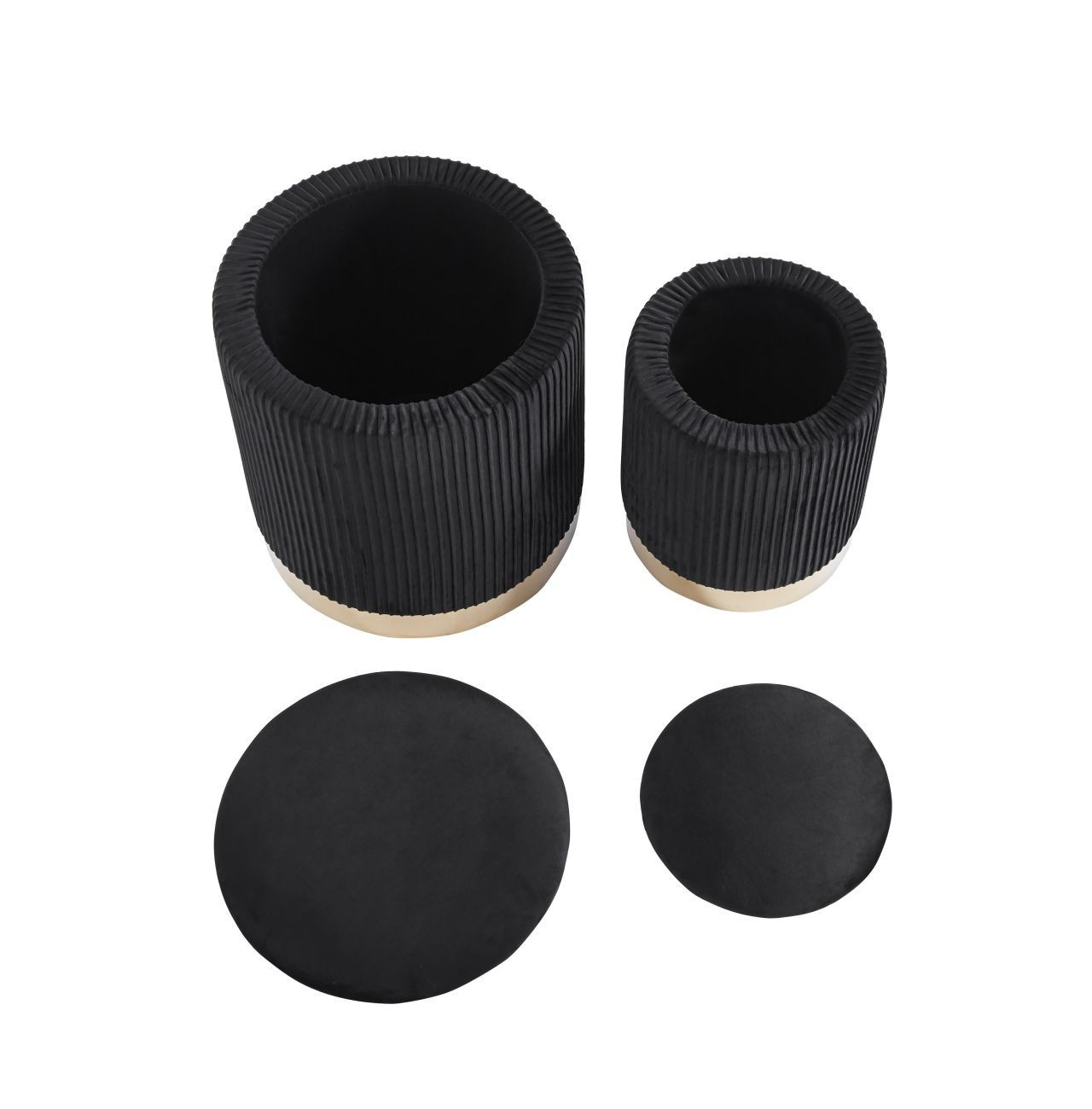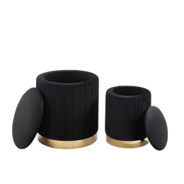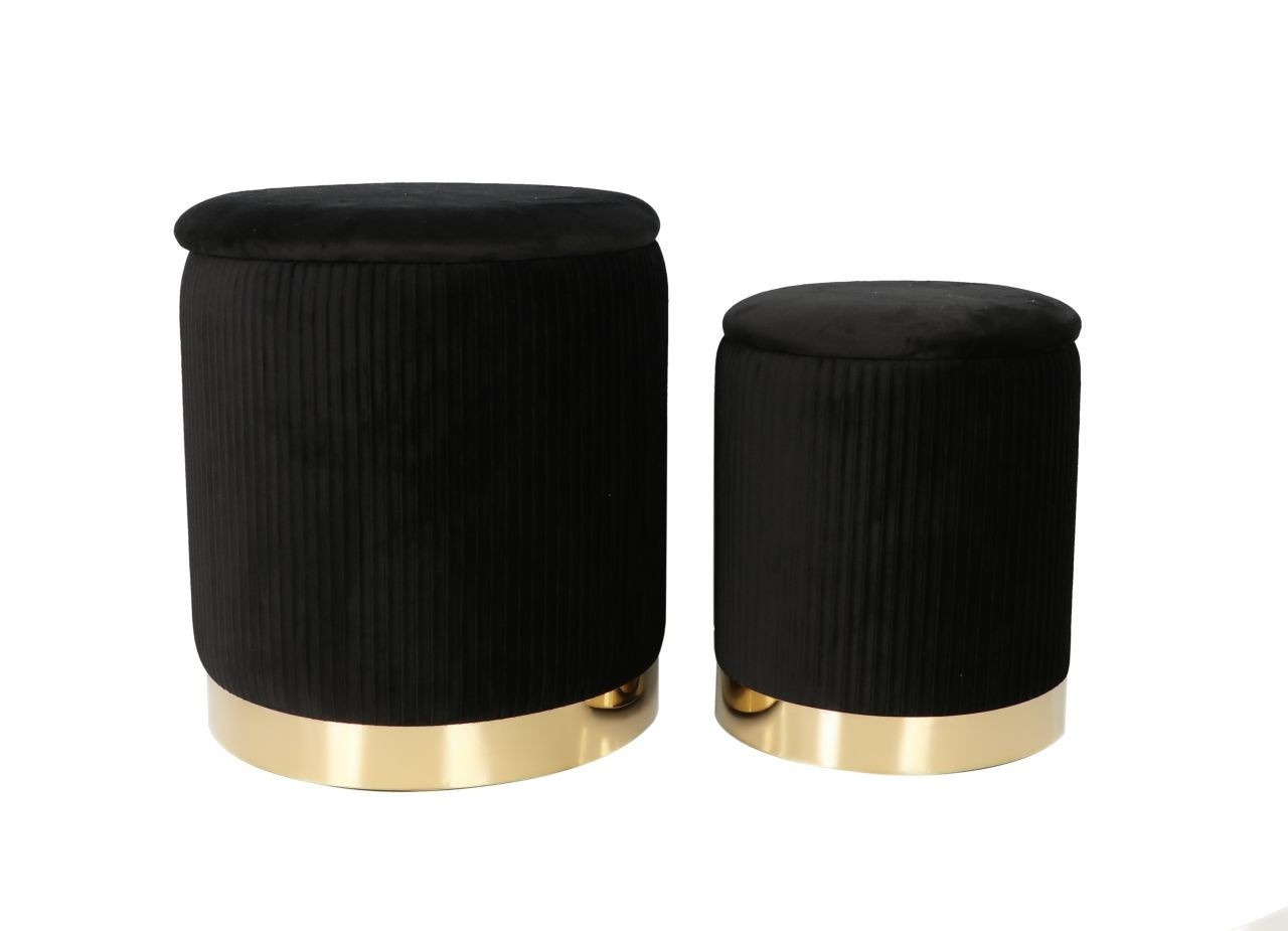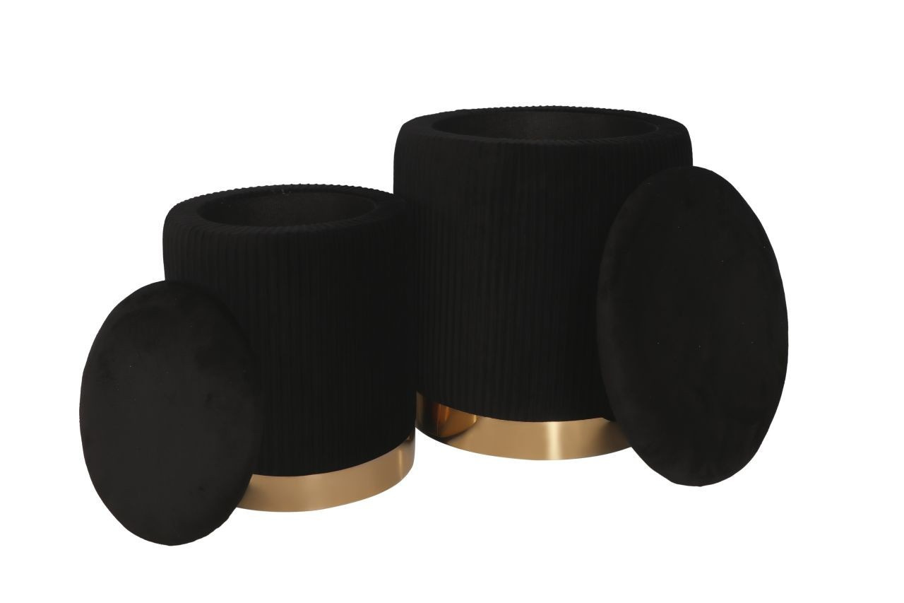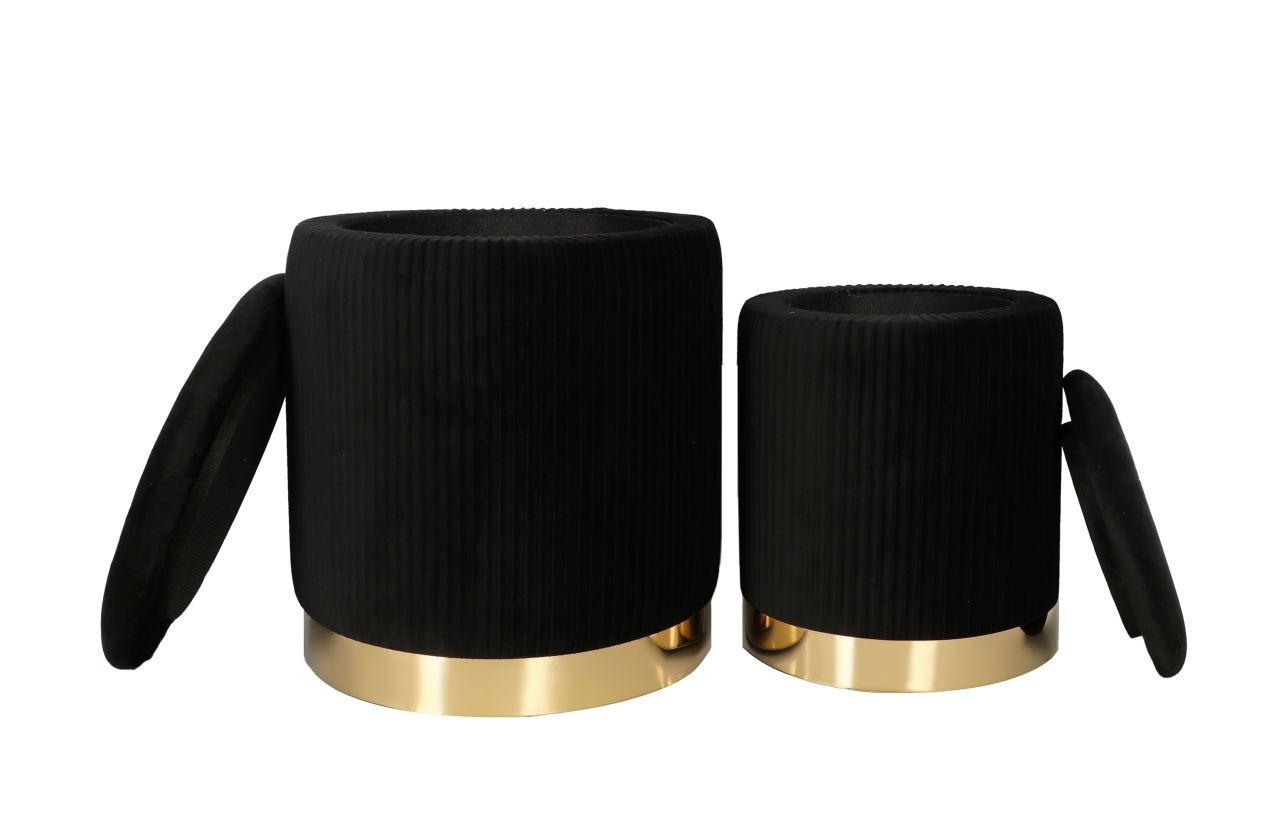 Méretek: *nagyobb puff: - átmérő 36 cm - magasság: 42 cm *kisebb puff: - átmérő 28 cm - magasság: 36 cm Anyag: - bársony szövet + krómozott fém Egyéb: - tároló funkció Szín: - szövet: fekete - alap: arany