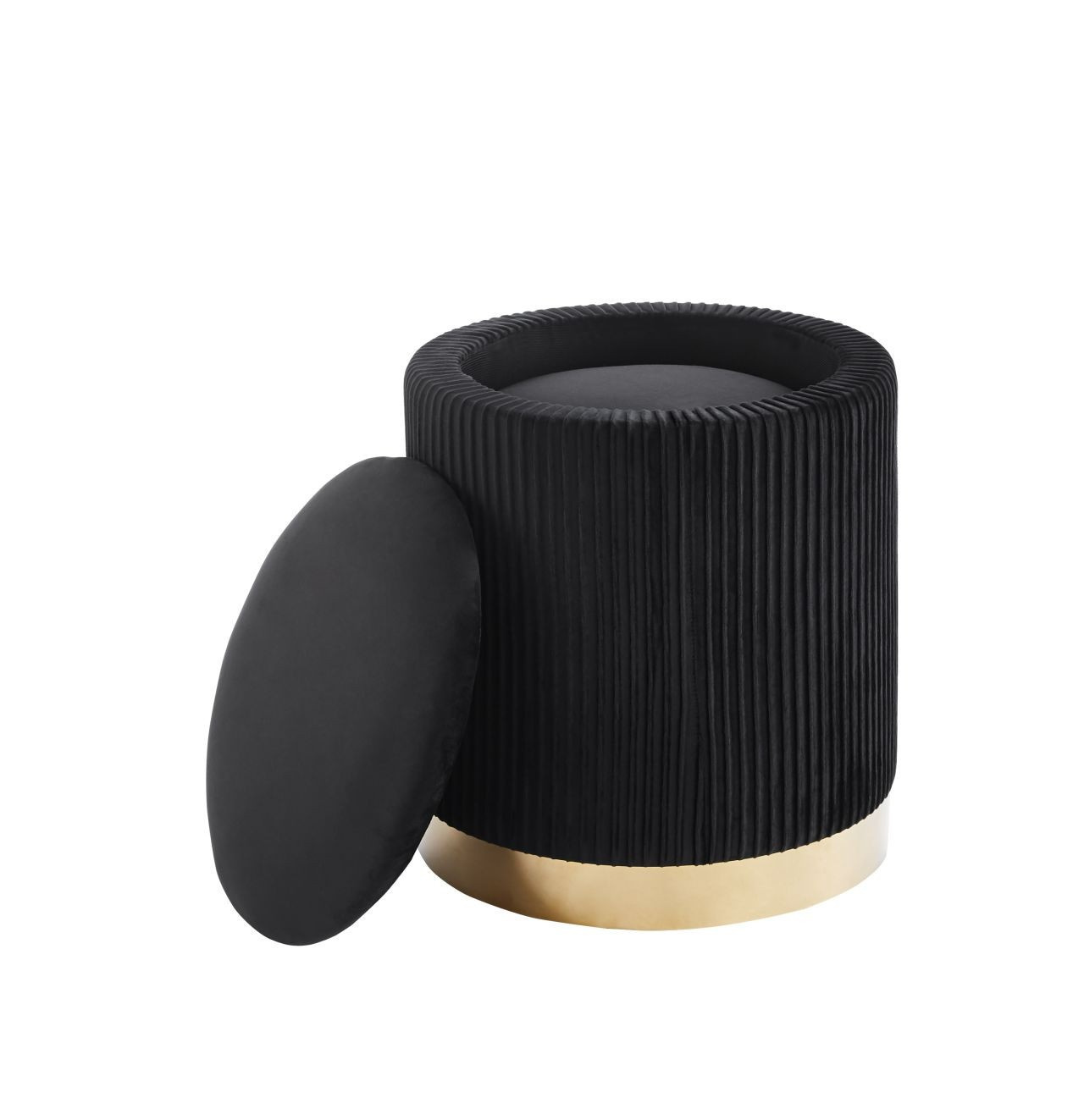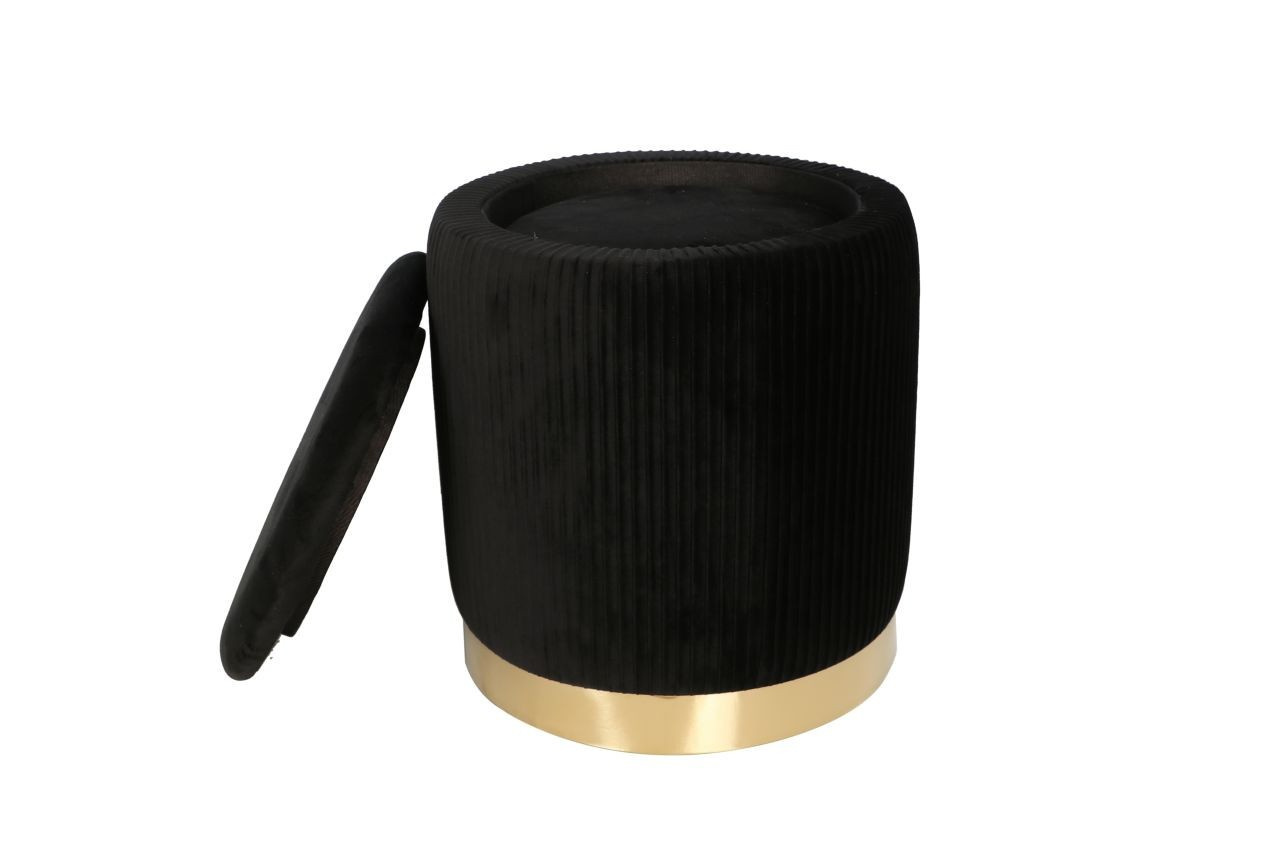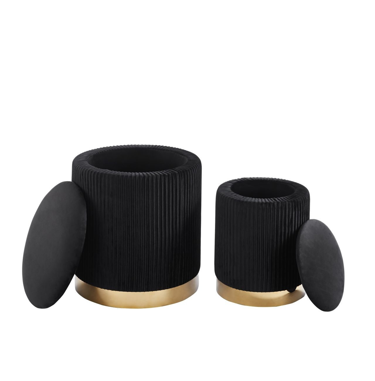 Méretek: *nagyobb puff: - átmérő 36 cm - magasság: 42 cm *kisebb puff: - átmérő 28 cm - magasság: 36 cm Anyag: - bársony szövet + krómozott fém Egyéb: - tároló funkció Szín: - szövet: fekete - alap: arany