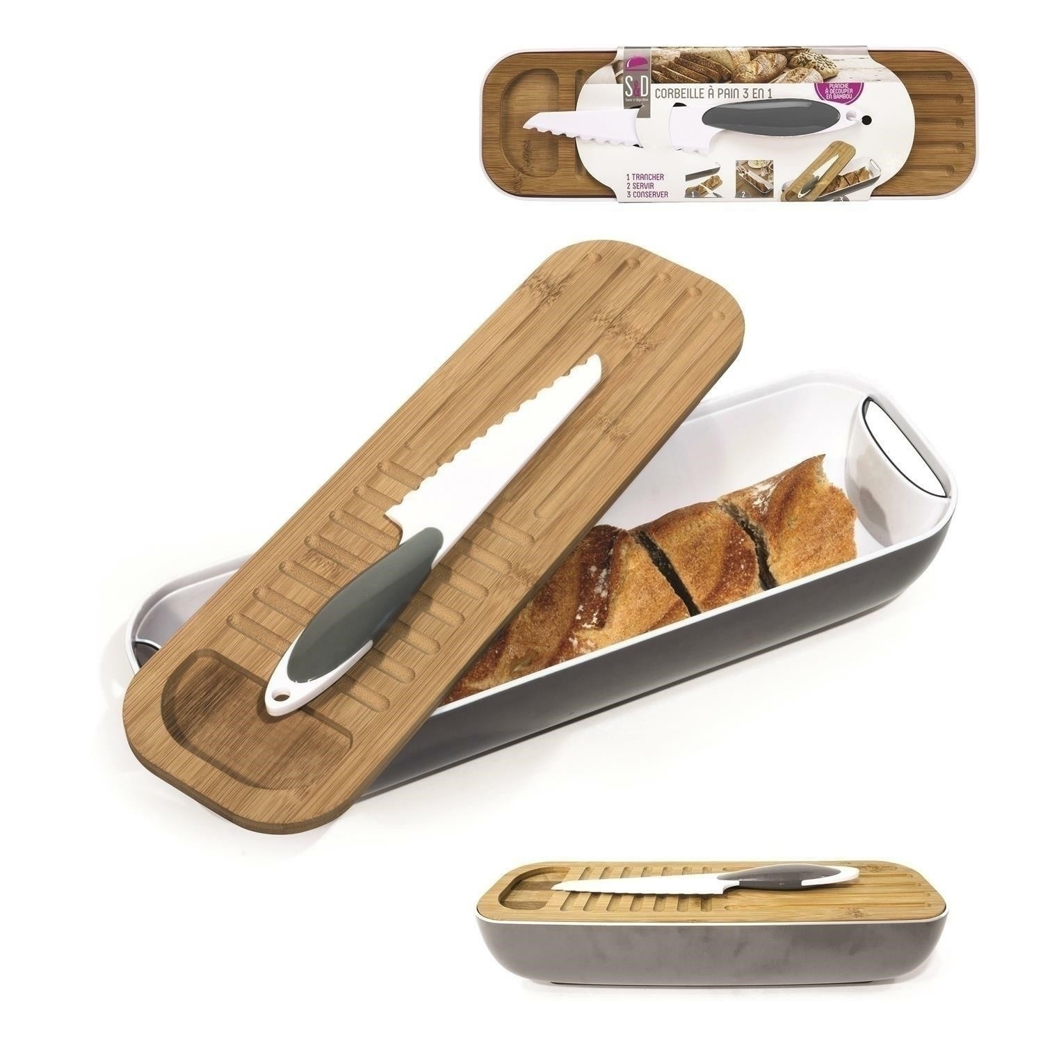 3 az 1-ben készlet: deszka, edény és kés megkönnyíti a munkát a konyhában. A készlet része egy műanyagból készült kenyértartó edény, egy bambuszból készült fedélként is szolgáló deszka, valamint egy speciális kés. Ez a készlet felgyorsítja az ételek elkészítését és megkönnyíti a rend fenntartását.