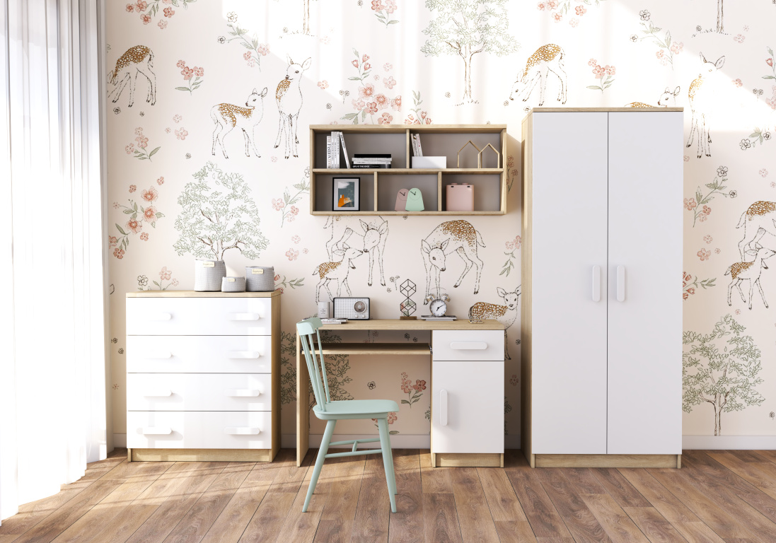A SMYK III modern bútorcsalád egyszerűségével és eleganciájával örvendeztet meg, amely a korpusz Sonoma Tölgy színét és a fehér frontokat kombinálja. A "Smyk III" másik megkülönböztető eleme a díszes fa fogantyúk, amelyek különböző színekben kaphatók. Éppen ezek adják a bútornak a karakterét, és teremtenek egyedi és finom légkört a gyerekszobában.