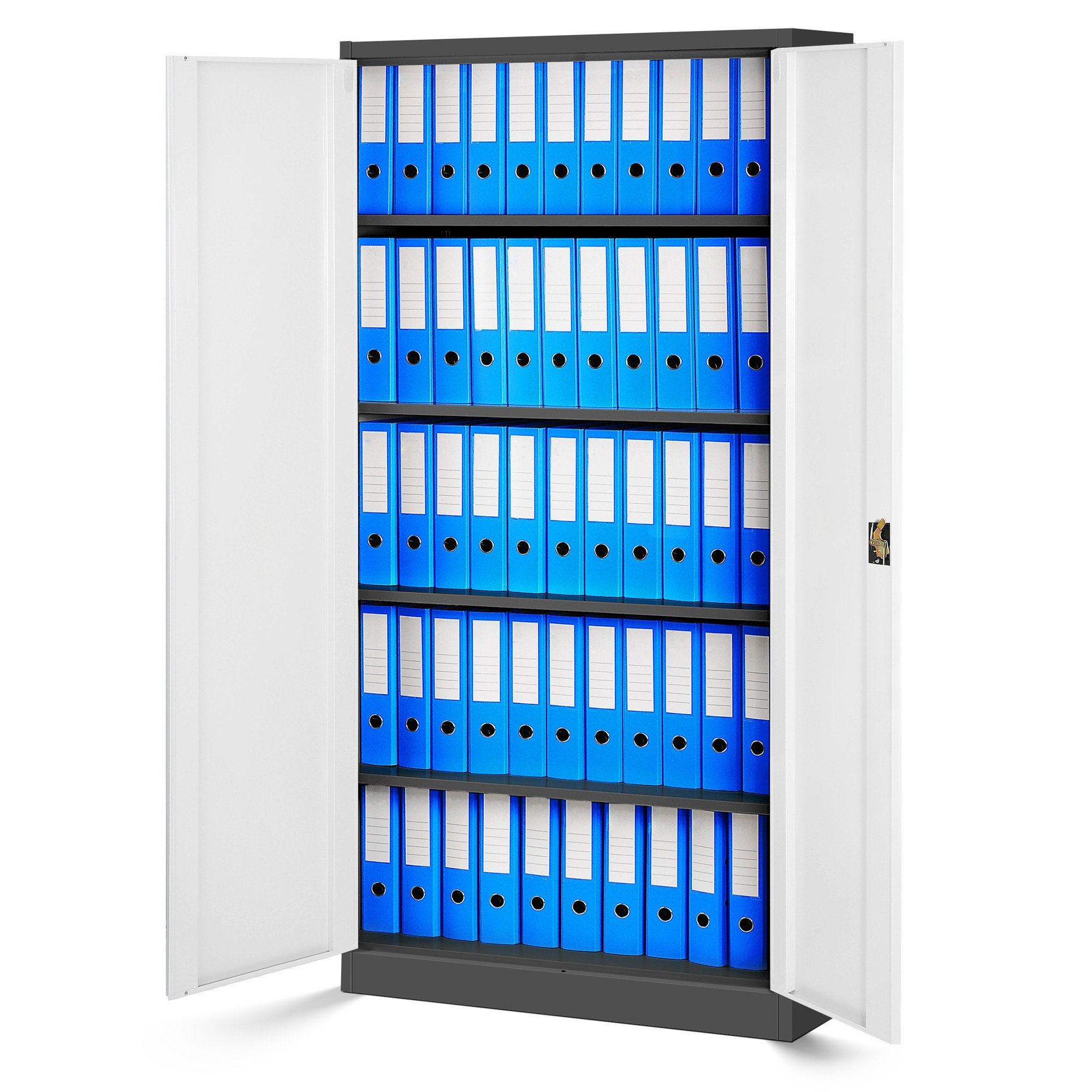 Minden szekrény elegendő helyet kínál akár 50 szabványos iratrendező tárolására. Négy állítható polc lehetővé teszi, hogy a belső elrendezést az igényeihez igazítsa. A polcok 25 mm-enként állíthatók, így különböző méretű tárgyak számára alakíthat ki helyet. Minden polc teherbírása akár 50 kg, így nem kell aggódnia a nehezebb tárgyak tárolása miatt sem.