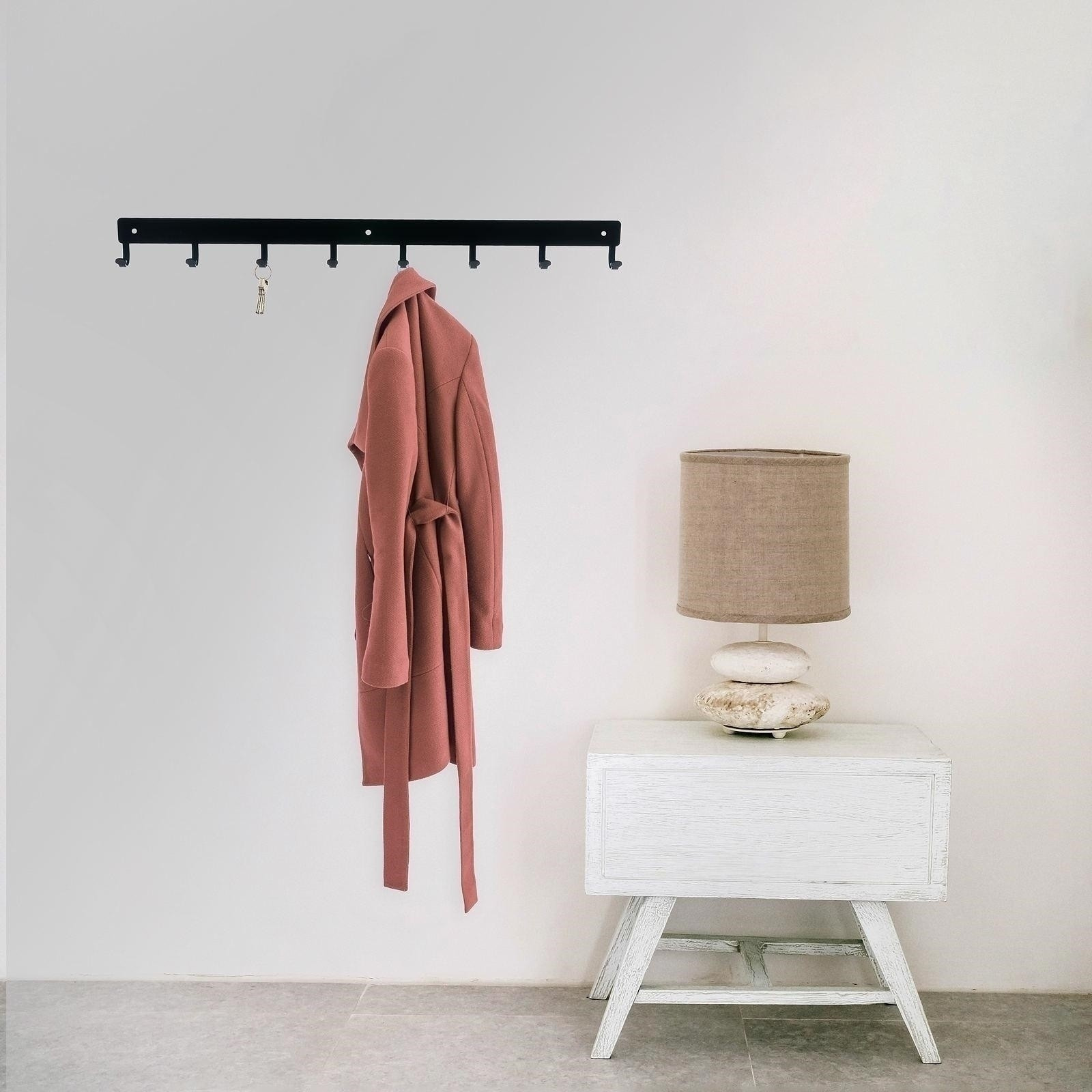Akasztós sín nagyszerű megoldás az előszobába vagy a váróterembe. A modern acél fogas akár 8 kampóval rendelkezik, amelyek mindegyike legfeljebb 3 kg terhelést bír el. A lézerrel vágott és egyben tartós kampóknak köszönhetően a sín ideális táskák, kulcsok vagy ruhák tárolására. A termék porszórt bevonattal rendelkezik, ami azt jelenti, hogy könnyen tisztítható és karcálló. Egy másik előny a matt felület, amely osztályt és eleganciát kölcsönöz. A kampós sín két színben kapható, ami több lehetőséget biztosít a belső tér elrendezéséhez. A sín maximális terhelhetősége 24 kg. A fogashoz mellékelt szerelőkészlet tartalmaz tipliket, takarókat és csavarokat. Magasság: 5,5 cm Szélesség: 60 cm Max. darabszám kartonban: 1 Karton méretei: 9cm x 63cm x 5cm Csomag súlya: 2kg