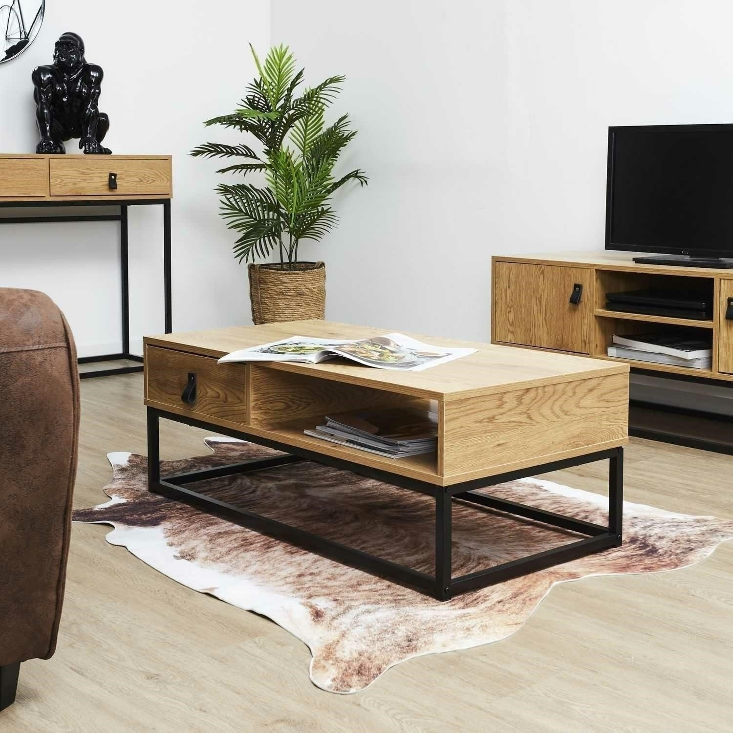 A dohányzóasztal úgy lett tervezve, hogy univerzálisan illeszkedjen a különböző igényekhez. Gyönyörűen mutat az otthoni nappaliban, de remekül kiegészíti az irodai tér belső terét is. Az egyszerűsége a formájának kulcsfontosságú motívumot képvisel az egyszerű elrendezésben a használatával. Az Abbott dohányzóasztal a legmagasabb minőségű, bevált anyagokból készült. A lapok tartós és erős laminált lemezből készültek arany tölgy színben. A lábak nagyon tartós fémből készültek, fekete porfestéssel. A polc és a fiók rengeteg helyet biztosít, amelyet tetszés szerint lehet kihasználni. Az érdekes lábelrendezés nemcsak stabil támaszt nyújt a bútornak, hanem biztosítja azt is, hogy az egész újszerűen nézzen ki. A szekrény súlya: 18 kg Max darabszám. kartonban: 1 Karton méretei: 101cm x 51cm x 12cm
