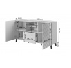 KOMODA wymiary:w/s/g-82cm/150cm/41,6cm, materiał: Korpus: płyta laminowana matowa 16mm Fronty: płyta MDF laminowana płaszczowana folią PCV 16mm z widocznymi frezami Obrzeże: ABS 0,45mm Nóżki: tworzywo sztuczne w kolorze czarnym Uchwyty: brak, fronty przestaja ponad blat