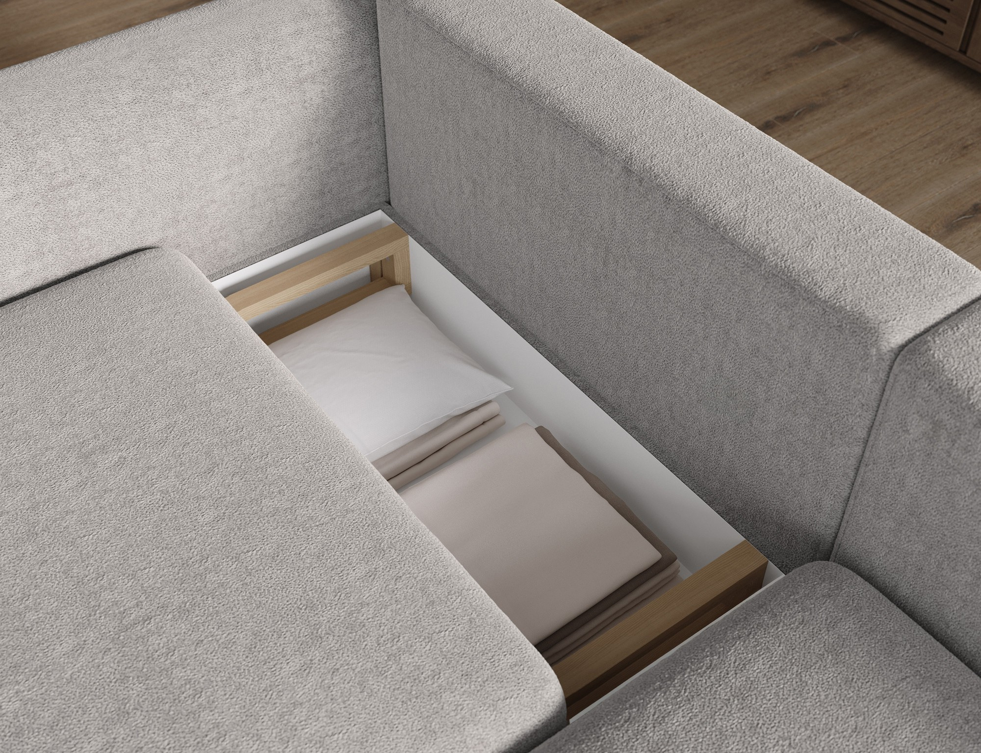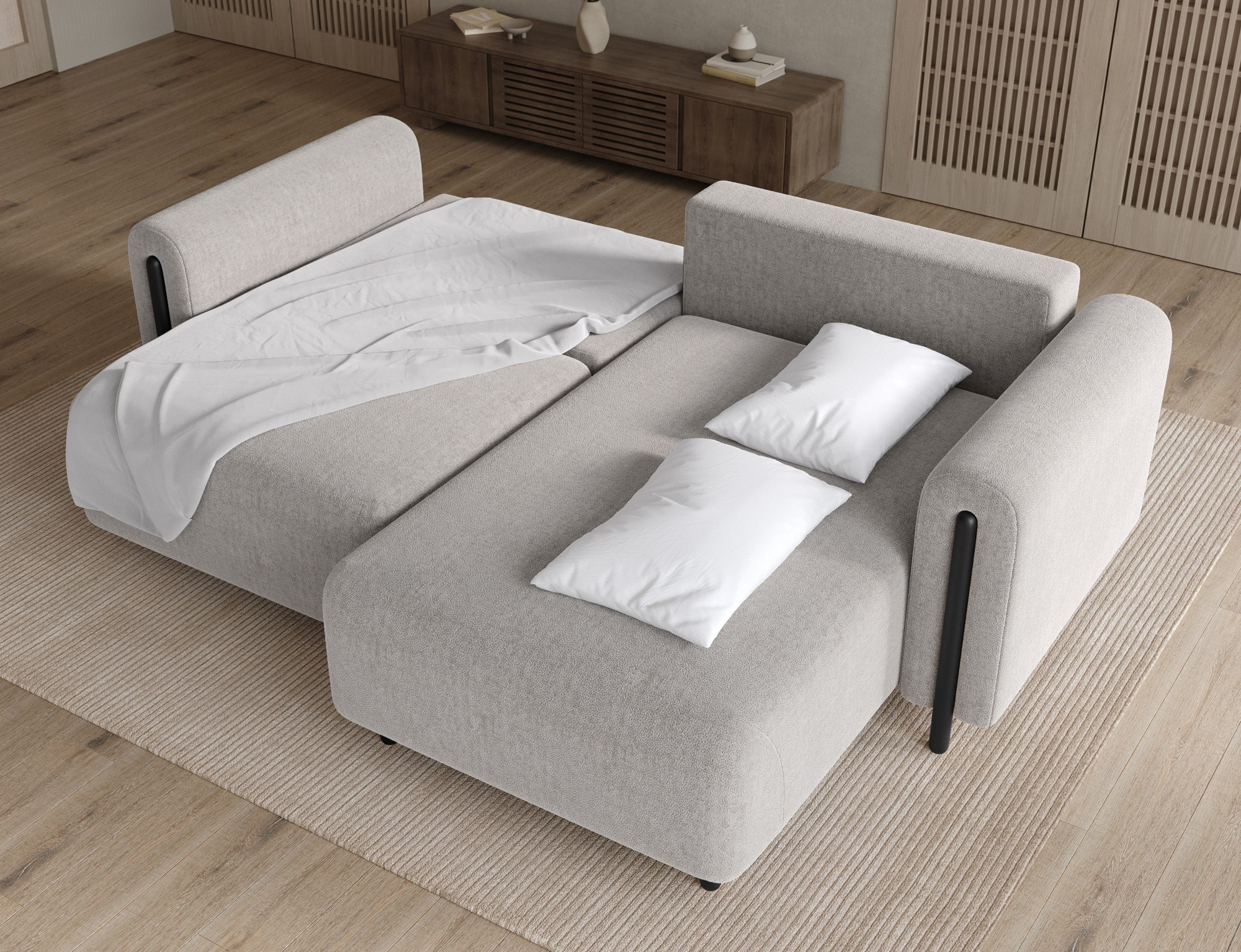The Acossta corner sofa is a modern and functional upholstered piece designed for everyday comfort and long-lasting durability, making it perfect for both living rooms and relaxation areas. With overall dimensions of 244 × 154 × 95 cm and a weight of 121.7 kg, this model stands out for its solid construction and ergonomically shaped form that ensures a high level of seating and lounging comfort. The seat comfort is provided by a combination of Type B wave springs and HR3030 high-resilience foam, while the backrest filled with T2315 polyurethane foam offers stable and comfortable back support. The Acossta corner sofa features a sleeping function with a surface of 49 × 200 cm, making it a practical solution for occasional overnight guests, and the DL assisted unfolding mechanism with an automatic leg allows for quick and smooth conversion. An additional advantage is the integrated bedding storage compartment, which enhances functionality and provides convenient storage, making the Acossta corner sofa an ideal choice for those seeking a balance of design, comfort, and practical features.
