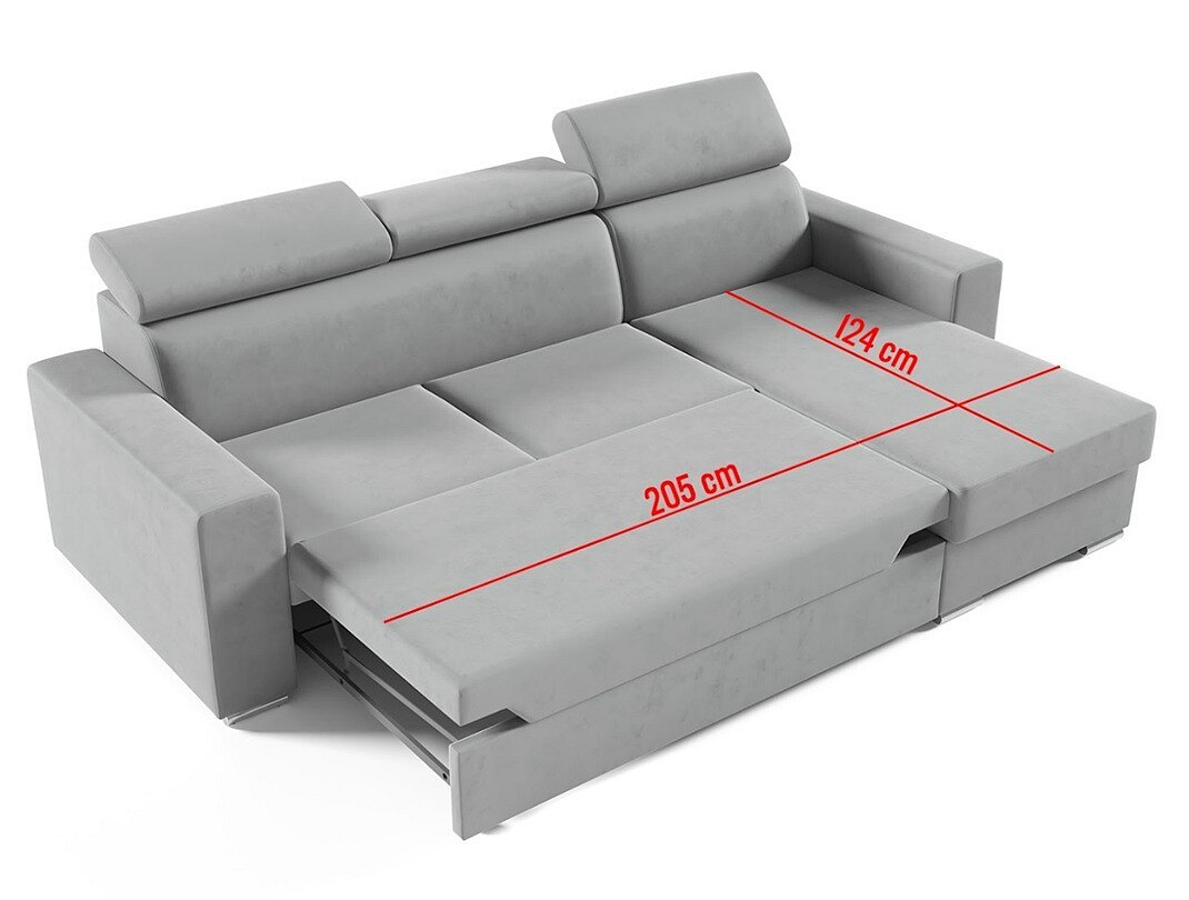 Az ADELKA sarokülőgarnitúra "Delfin" kihúzható rendszerrel van felszerelve, amely lehetővé teszi az egyszerű és gyors átalakítást egy kényelmes, 205 x 124 cm méretű ággyá. Ez a rendszer ideális azok számára, akiknek időnként szükségük van egy alvóhelyre vendégek számára anélkül, hogy fel kellene áldozniuk a teret vagy a stílust.