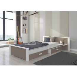Az ALDEX SHELF egyszemélyes ágy egyszerű kialakításával remekül illeszkedik a diákszoba belső terébe. Ez a modell egy polccal van felszerelve, amely ideális hely egy éjjeli lámpának vagy kedvenc könyvnek. Az előnye a két tágas és funkcionális ágyneműfiók. A készlet része egy tartós keret, amely erős lécekből készült, valamint egy 8 cm vastag habszivacs matrac. Az ágykeret három réteg lakkal van bevonva, ami biztosítja a mechanikai sérülésekkel és különféle szennyeződésekkel szembeni ellenállást.