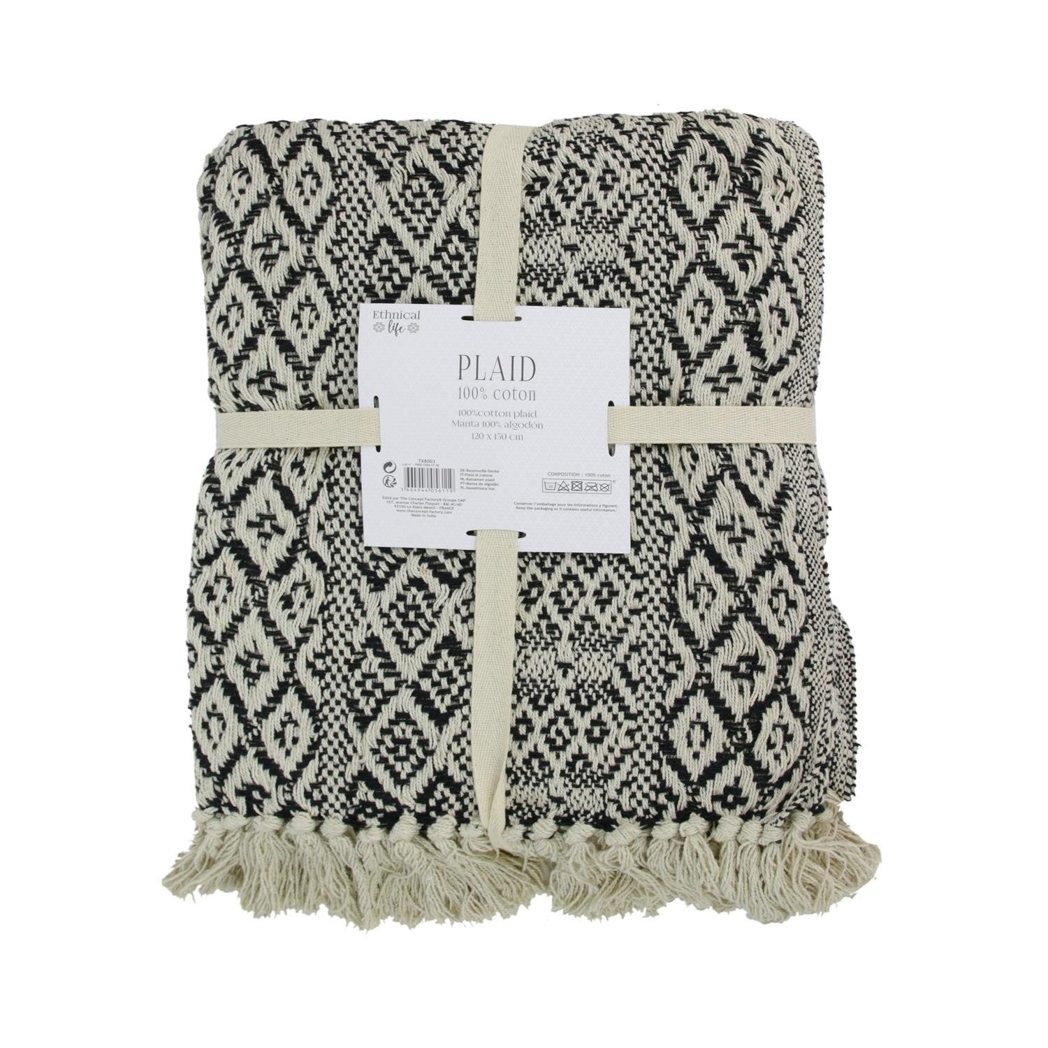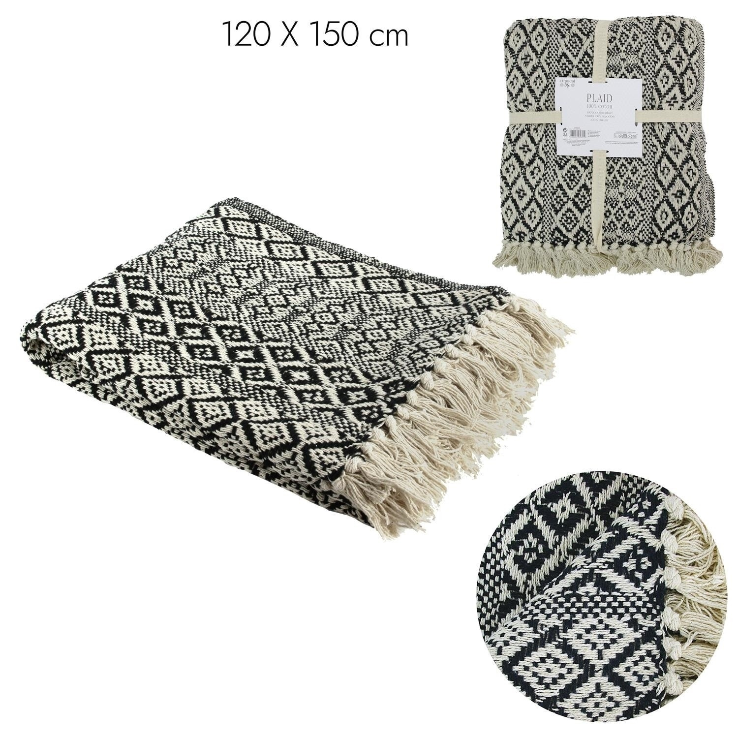 100% pamutból készült takaró illik a keleti stílusú belső térbe. A takaró fekete-fehér mintáját a szélén rojtok egészítik ki.