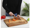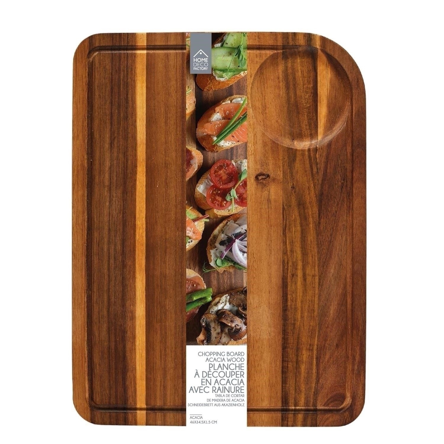 A hosszú távú használatot biztosító deszka akácfából készült, amely tartós és ellenáll a nedvességnek és a sérüléseknek. A természetes akácfa rajzolata elegáns és egyedi megjelenést kölcsönöz a deszkának, amely illik bármely konyhába. A sima felületű lap megkönnyíti a tisztítást és karbantartást. Nedves ruhával letörölhető és rendszeresen olajozható, hogy megőrizze szépségét és funkcionalitását. Ideális mindennapi használatra a konyhában, kiváló zöldségek, gyümölcsök, hús és kenyér szeletelésére. Hosszúság: 46 cm Magasság: 1,5 cm Mélység: 34,5 cm Súly: 500 g Anyag: Akác