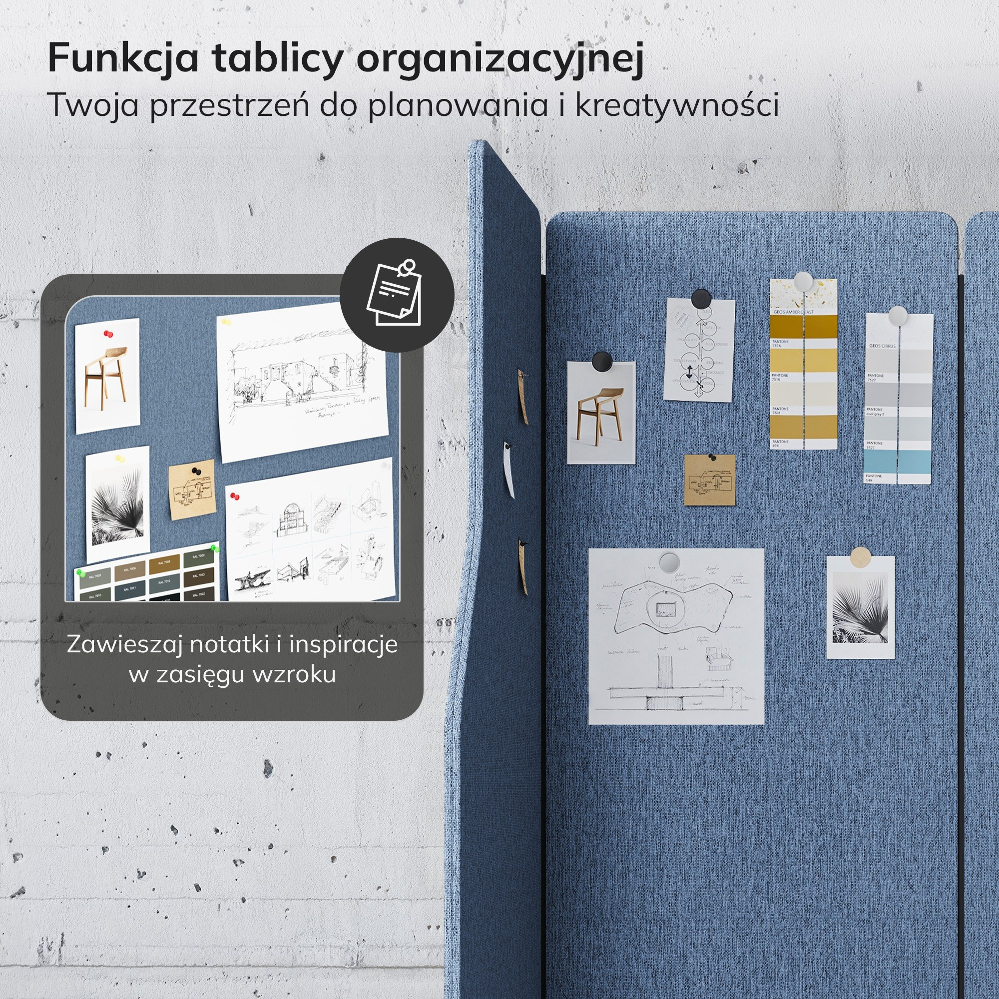 A SADIE akusztikus falpanelek felülete szervezőtáblaként használható jegyzetek, feladatok és fontos információk kitűzésére. Tartsa kéznél a fontos dolgokat, és spóroljon időt a fiókokban való keresgéléssel.