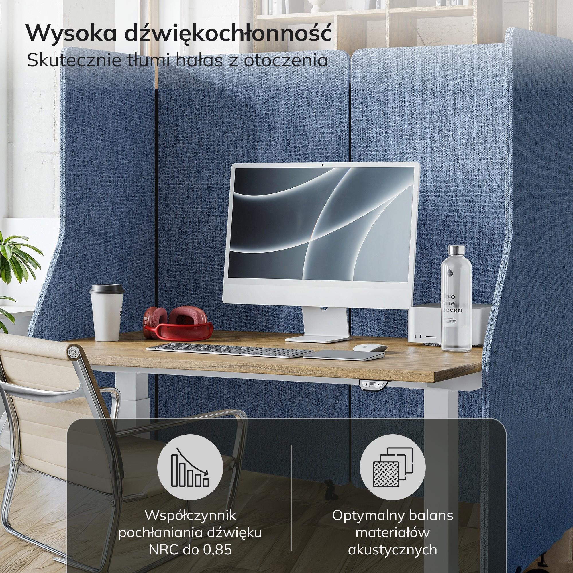 - Rugalmas elrendezés: Az akusztikus fal ideális 110-120 cm széles asztalokhoz és nyitott tér rendszerekhez, lehetővé téve a tér rugalmas elrendezését az aktuális igények szerint.