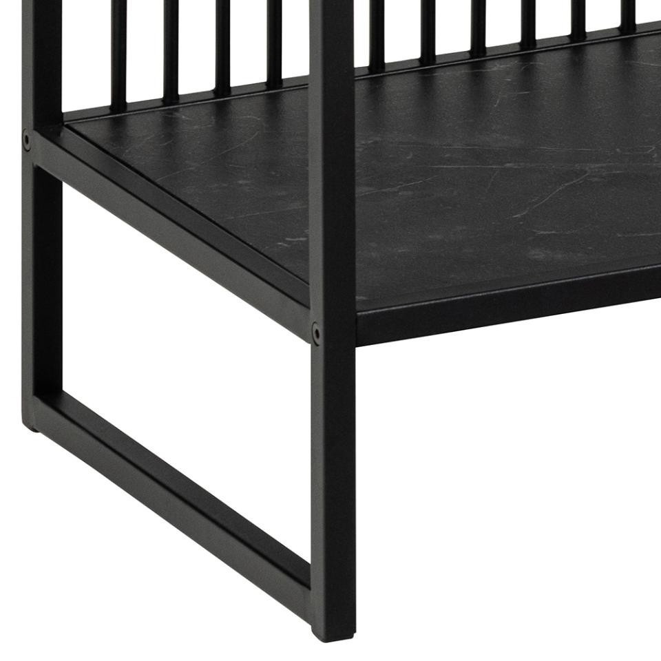 Strington polc, matt fekete acél keret és alap porfestékkel bevonva, 2 MDF polc és matt fekete Izmir furnér, amely márványt imitál. Úgy tervezték, hogy fokozza a vizuális érdeklődést, ez a polc különböző elemekkel stimulálja a látást, amelyek jellegzetes megjelenést kölcsönöznek neki. Beépítve a fekete acélkeretbe függőleges huzalokkal, a polcok fekete márvány hatással díszítettek, és elegendő helyet kínálnak apró dekoratív és érzelmi tárgyak tárolására. A polc tartós benyomást kelt minden térben. Összeszerelést igényel. Max. terhelés 27 kg. A polc tömege 15 kg Karton méretei: 89x40x17 cm.