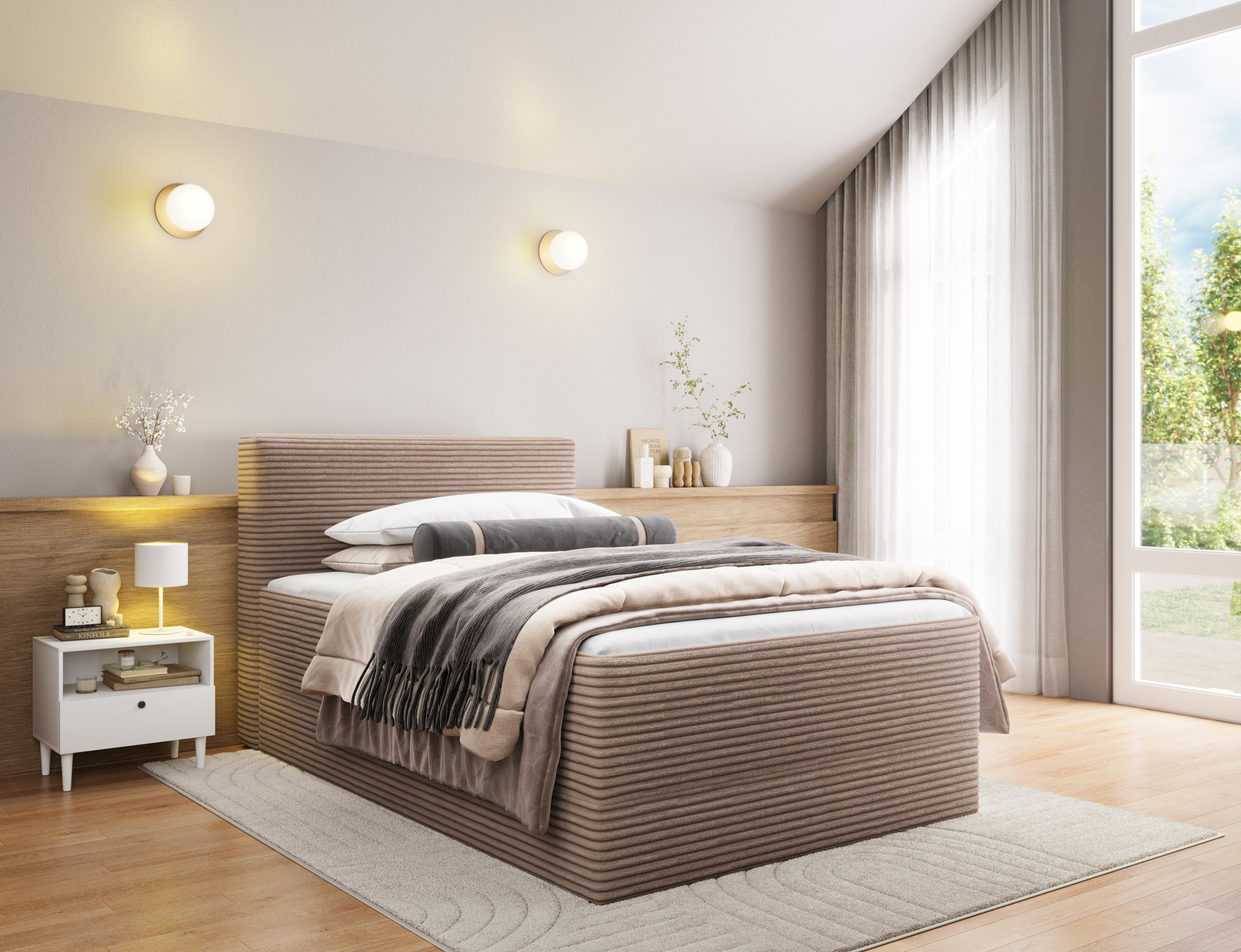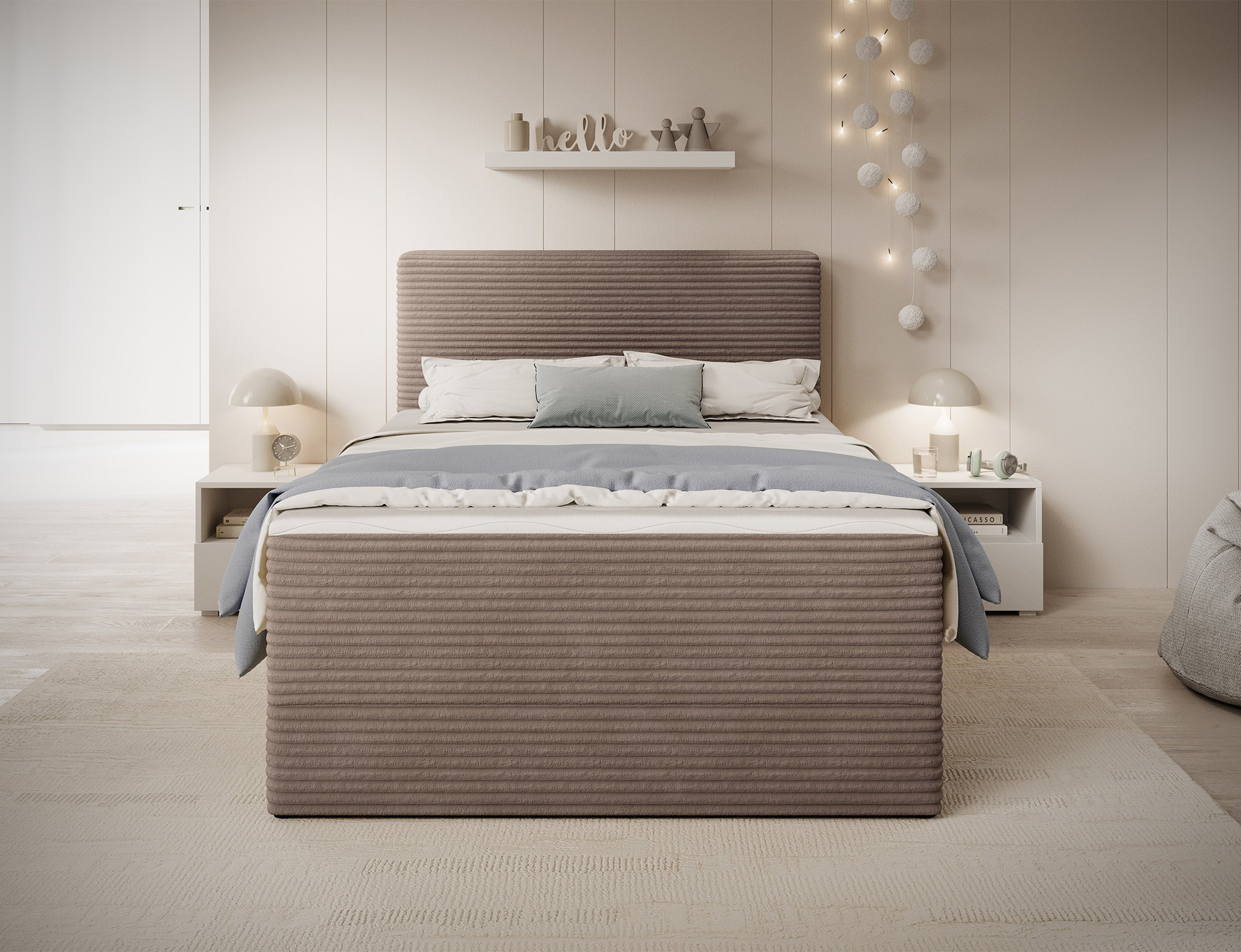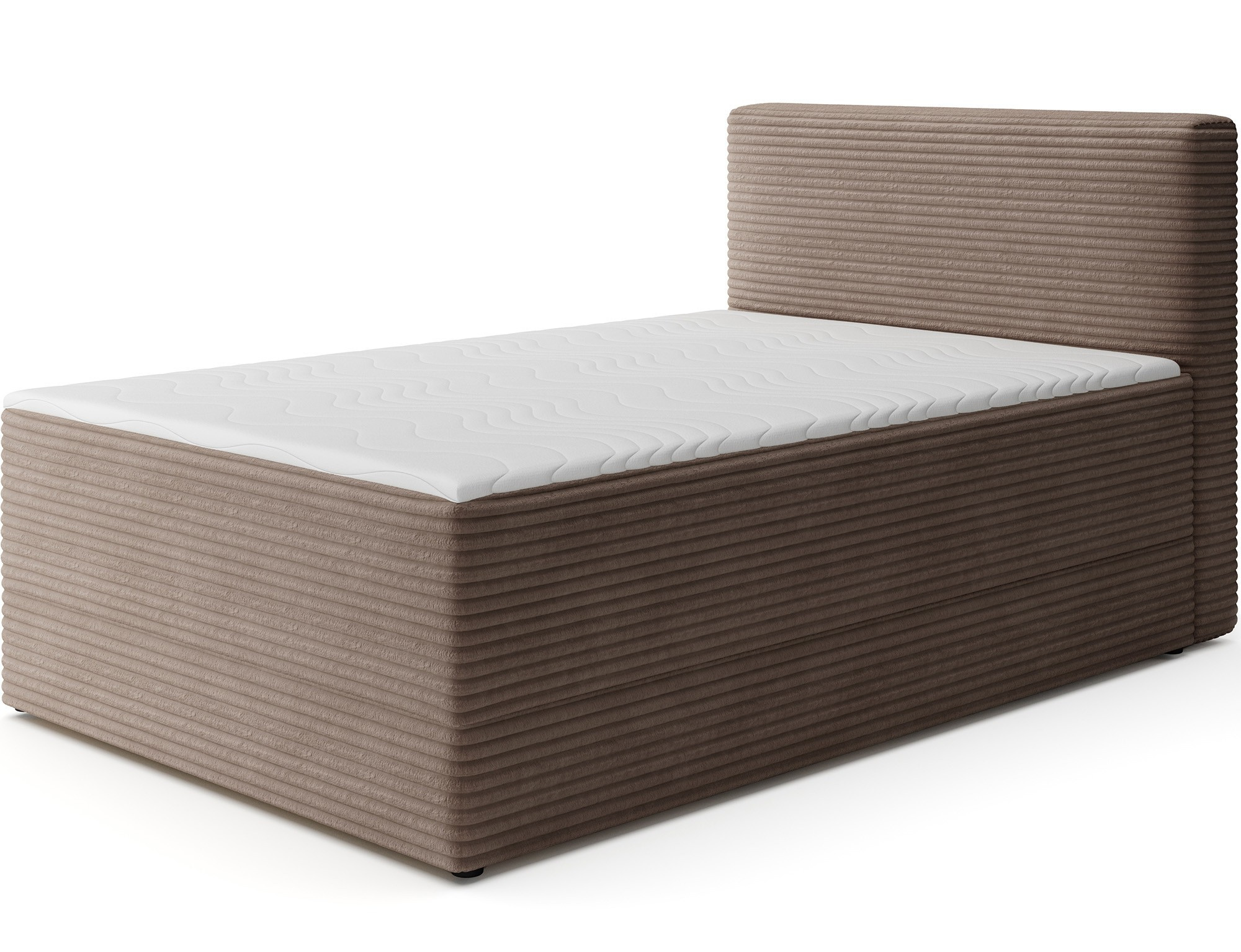 The Alamito boxspring bed is a functional and comfortable continental bed, designed for restful sleep and everyday use, making it an excellent practical choice for the bedroom. Its solid construction, with a height of 108 cm and a length of 215 cm, ensures stability and proper support, while carefully selected materials contribute to durability and comfort. The headboard is filled with 5 cm thick T2130 foam, while the base is made from a combination of T2130 foam, a bonell spring system, and T2540 foam, guaranteeing elasticity and sleeping comfort. The bed is complemented by a 5 cm thick topper, which enhances comfort and body adaptation. It features a practical bedding storage compartment that makes organization easier and helps optimize bedroom space. The structure includes a bonell spring mattress permanently mounted on a frame made of solid wood and particle board, providing a sturdy base and long-lasting durability. The Alamito model is available in two sizes: 120x200 cm and 140x200 cm, making it an ideal choice for both smaller and medium-sized bedrooms, combining aesthetics, functionality, and a high standard of sleep.