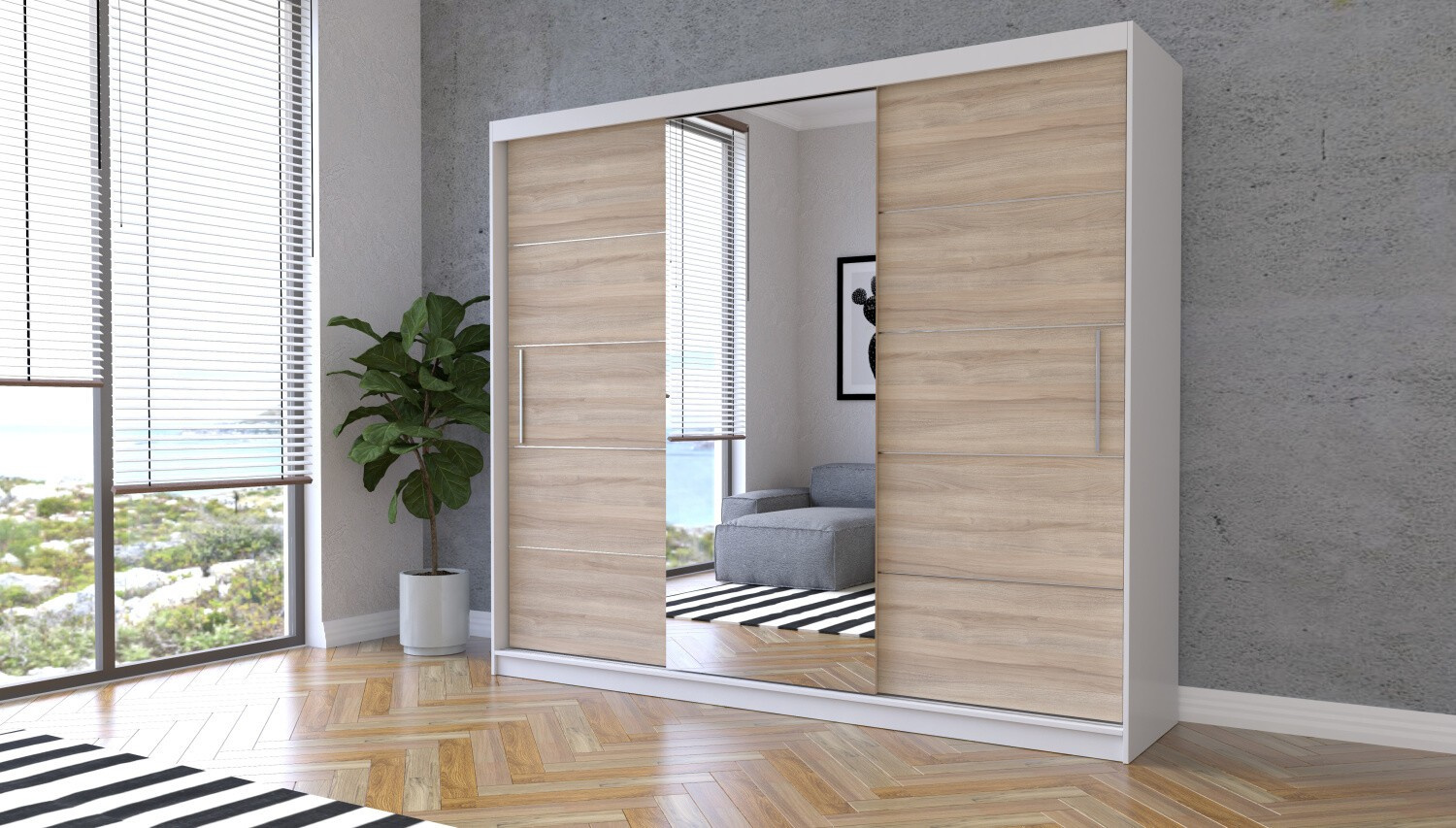 ALBA ruhásszekrény tükörrel, Matt fehér/Sonoma