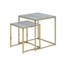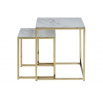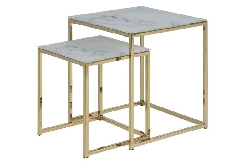 Az Alisma asztalkészlet üveglappal készült, amely alulról márványhatású nyomtatással van ellátva, és arany színű fém talppal rendelkezik. A geometria a márványmintával együtt modern dizájn, amely megfelel a trendeknek. A 6 mm vastag üveglap tartós és erős. A nagyobb asztal méretei 45x45x50, a kisebbé pedig 35x35x40. Magasság: 50/40 Szélesség: 45/35 Mélység: 45/35