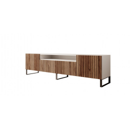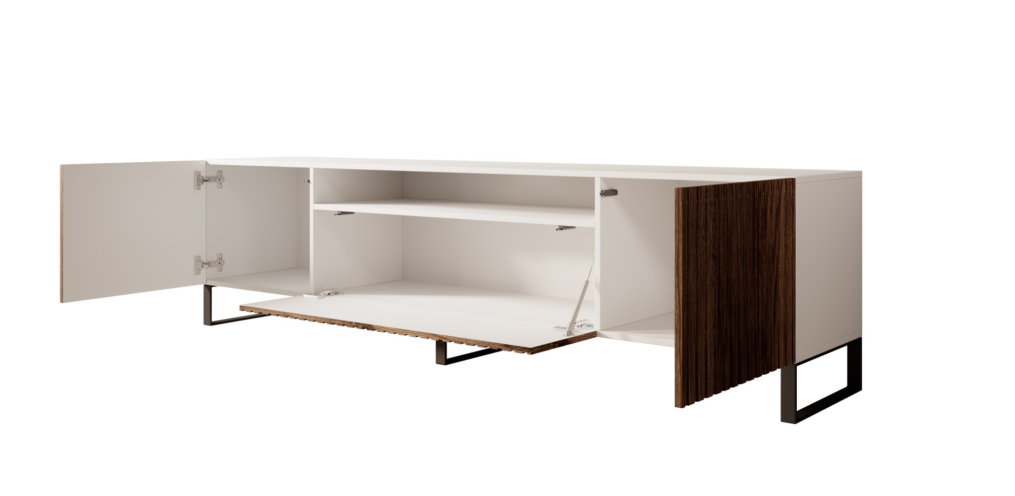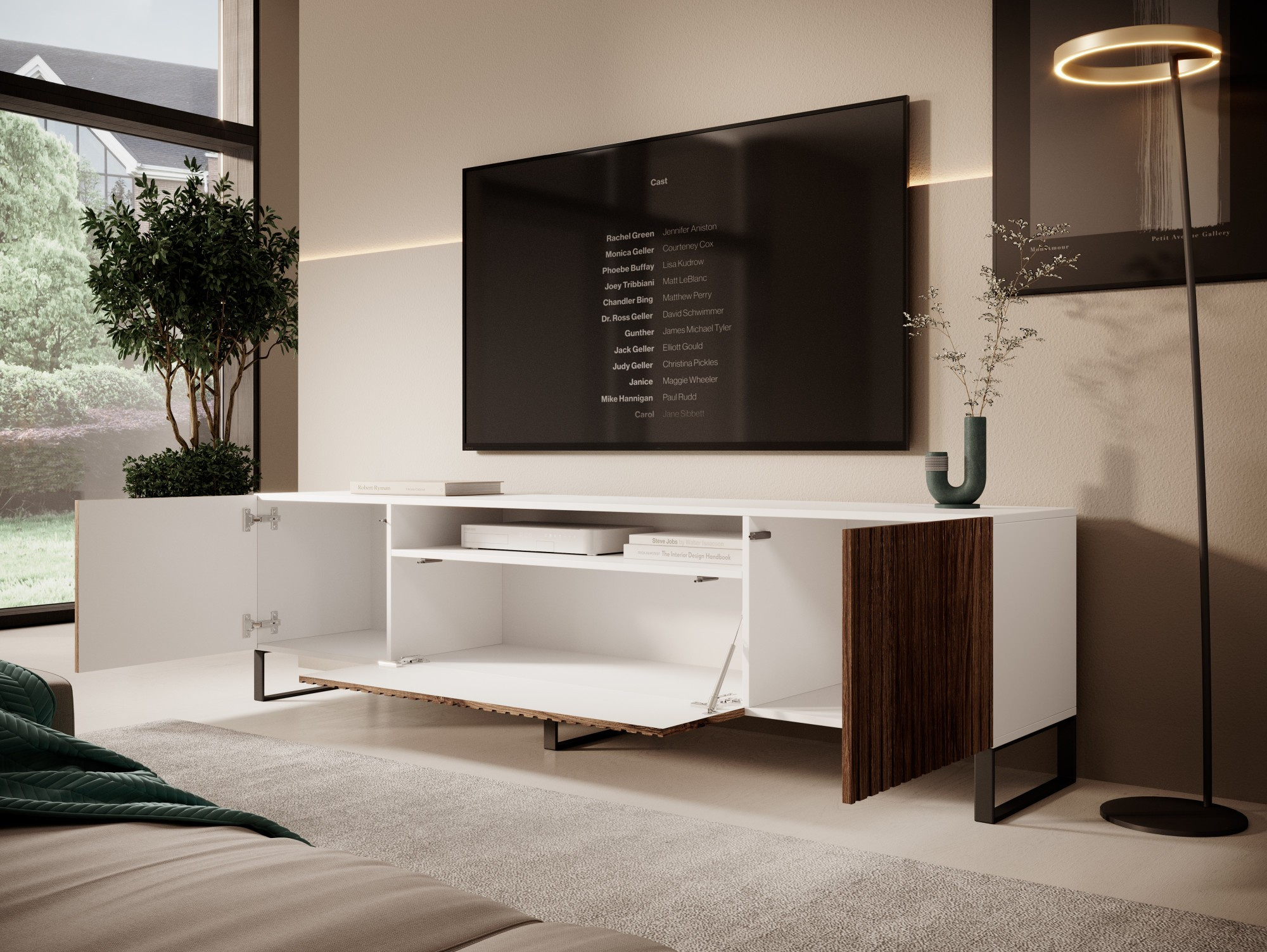 RTV szekrény Miro – modern megoldás a nappalijába, amely ötvözi az eleganciát a funkcionalitással. A modell két színváltozatban érhető el: klasszikus fehér katania dekorral és stílusos fekete katania dekorral, amelyek tökéletesen illeszkednek a különböző belső stílusokhoz.A Miro televíziós szekrény álló és függesztett változatban is kaphatók, ami lehetővé teszi a tér és az egyéni elrendezési preferenciákhoz való igazodást. Kiváló minőségű anyagok, beleértve a tartós laminált lapot, nemcsak tartósságot, hanem elegáns megjelenést is garantálnak hosszú évekre. A szekrény tágas polcokkal és praktikus fülkékkel rendelkezik, amelyek elférnek minden RTV eszközt és kiegészítőt, biztosítva a rendet és a szükséges eszközökhöz való könnyű hozzáférést.Az RTV Miro ideális választás azok számára, akik értékelik a stílust és a kényelmet.