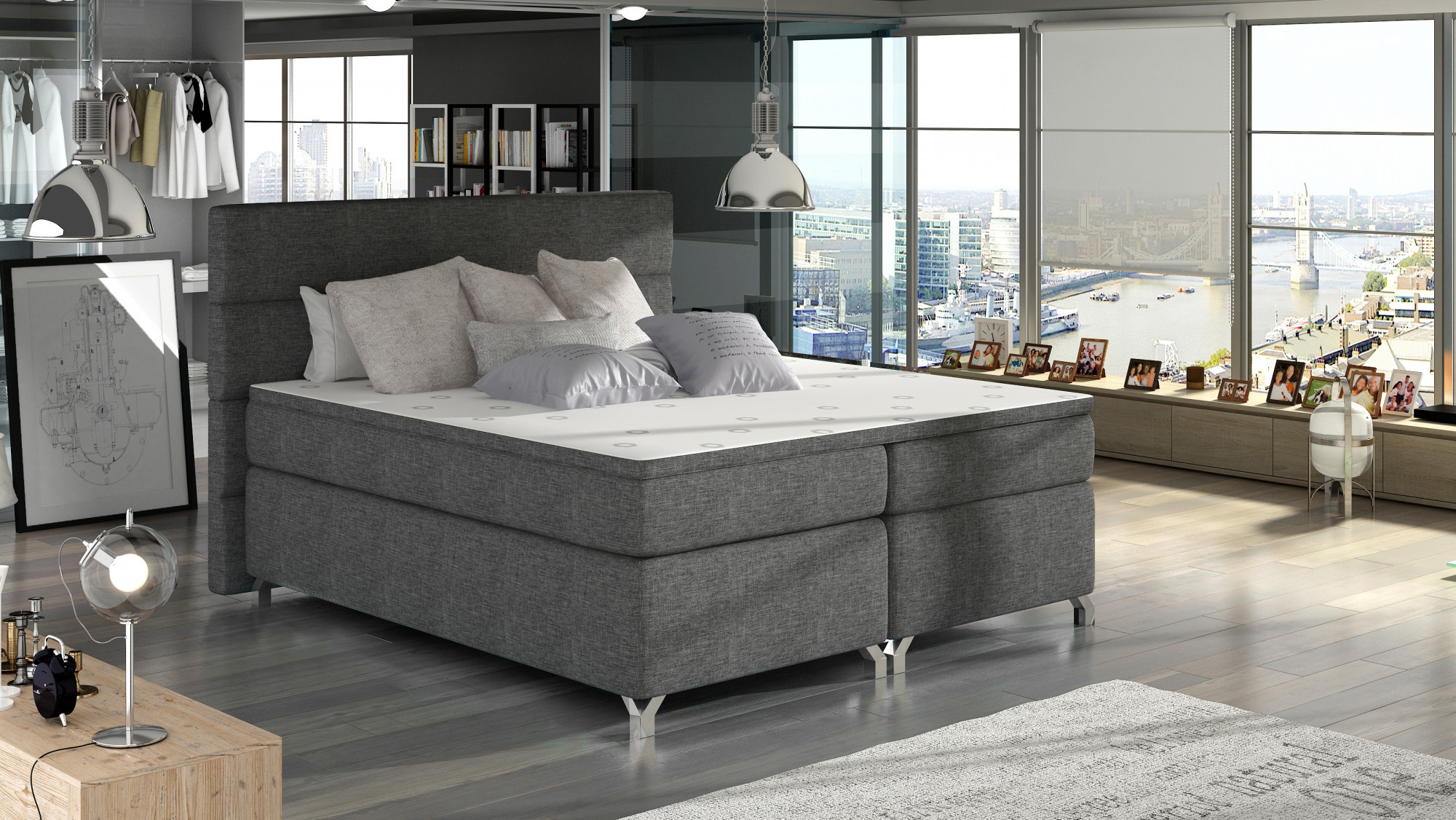 Amadeo is an exceptionally comfortable, sturdy and original design boxspring bed, which impresses with its unusual form and additional decorations. It is available in three variants 140/ 160 / 180 x 200 cm, so you can very easily adjust it to the metric size of your apartment. Among its features are: a high mattress, a stylish headrest equipped with additional T21 foam, a capacious storage compartment for bedding, metal chrome legs and elegant upholstery resistant to abrasion and dirt, which is available in many colors from the Eltap collection. The most original decorative element of our furniture is the possibility of equipping it with LED lighting. The mattress itself is made of bonel, as well as two additional layers of T25 foam located at the top and bottom of the mattress. The filling of the bed has also been reinforced with a 4 cm thick T21 foam topper. This solution makes it as comfortable as possible. It is worth having such a functional piece of furniture in your apartment.