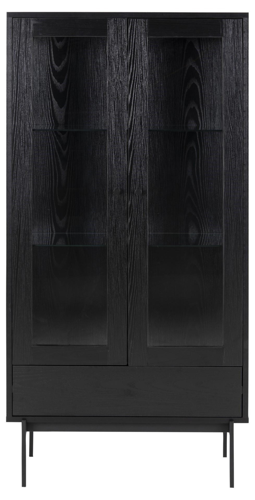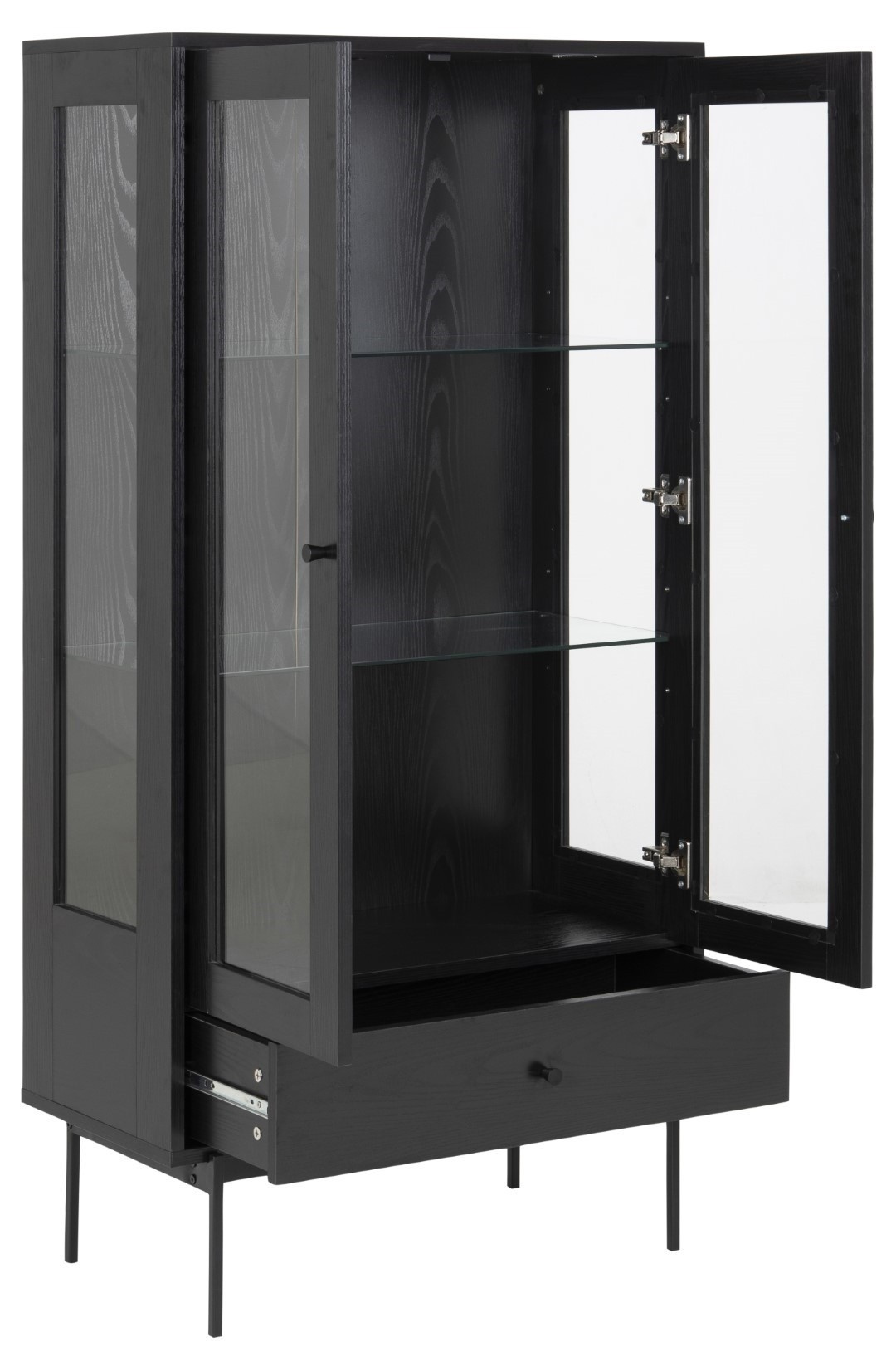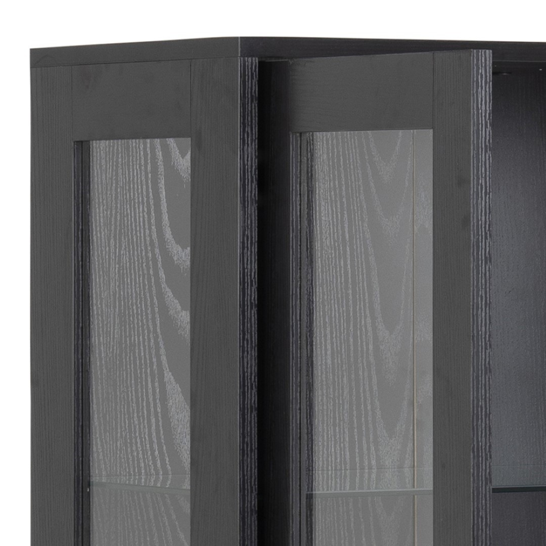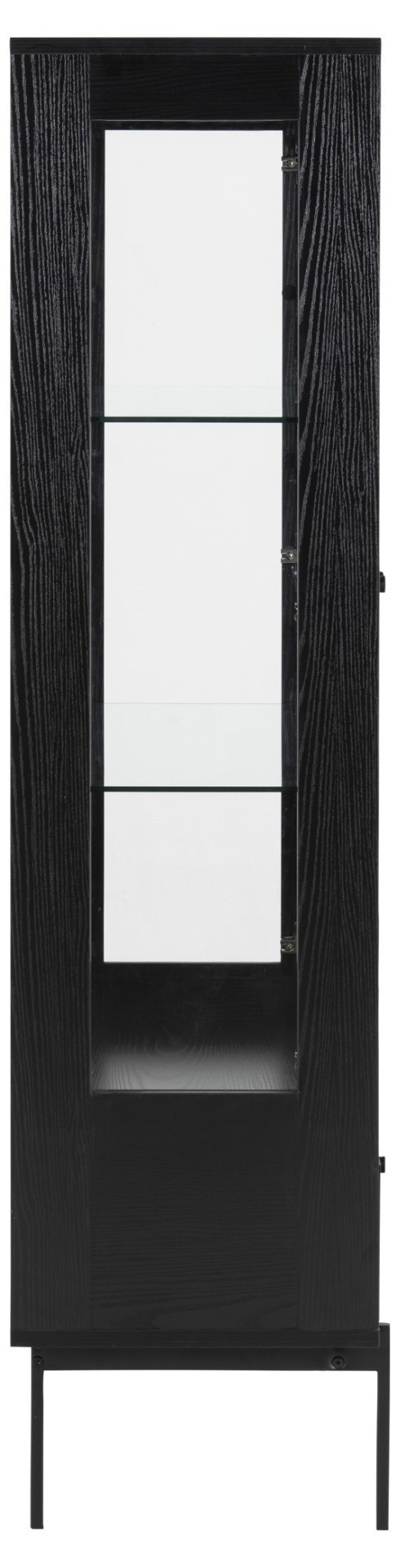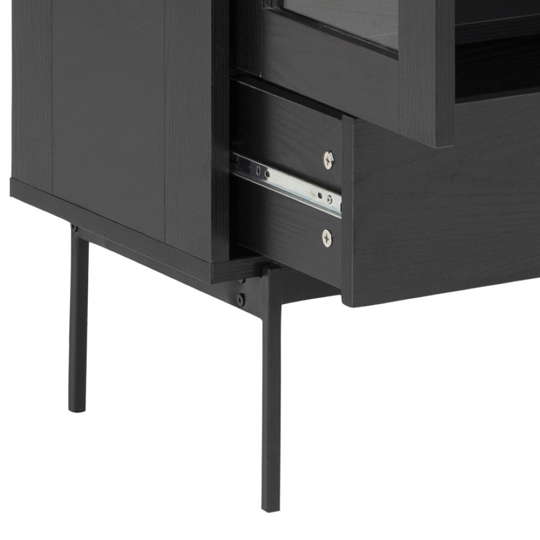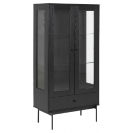 Az Angus fekete magas vitrin klasszikus bútor nemcsak az étkezőasztali edények számára, hanem a nappaliba is könyvek, szuvenírek vagy porcelán tárolására. Az Angus fekete klasszikus vitrin elegáns bútordarab, amelynek váza MDF lapból készült, kőris hatású lamináttal. Az oldal alapját fém, porfestett lábak képezik. A vitrinek fekete matt kivitele ideális bútordarabbá teszi modern és loft belső terekhez egyaránt. A vitrin közepén két üvegpolc található. A szekrény alatt egy fiók volt elhelyezve, amely kevésbé dekoratív tárgyakat tárolhat, pl. összehajtogatott abroszok vagy szalvéták. Csomag méretei: 1) 84x42,5x17 cm 2) 42,5x138x11 cm Súly: 23 kg és 25 kg