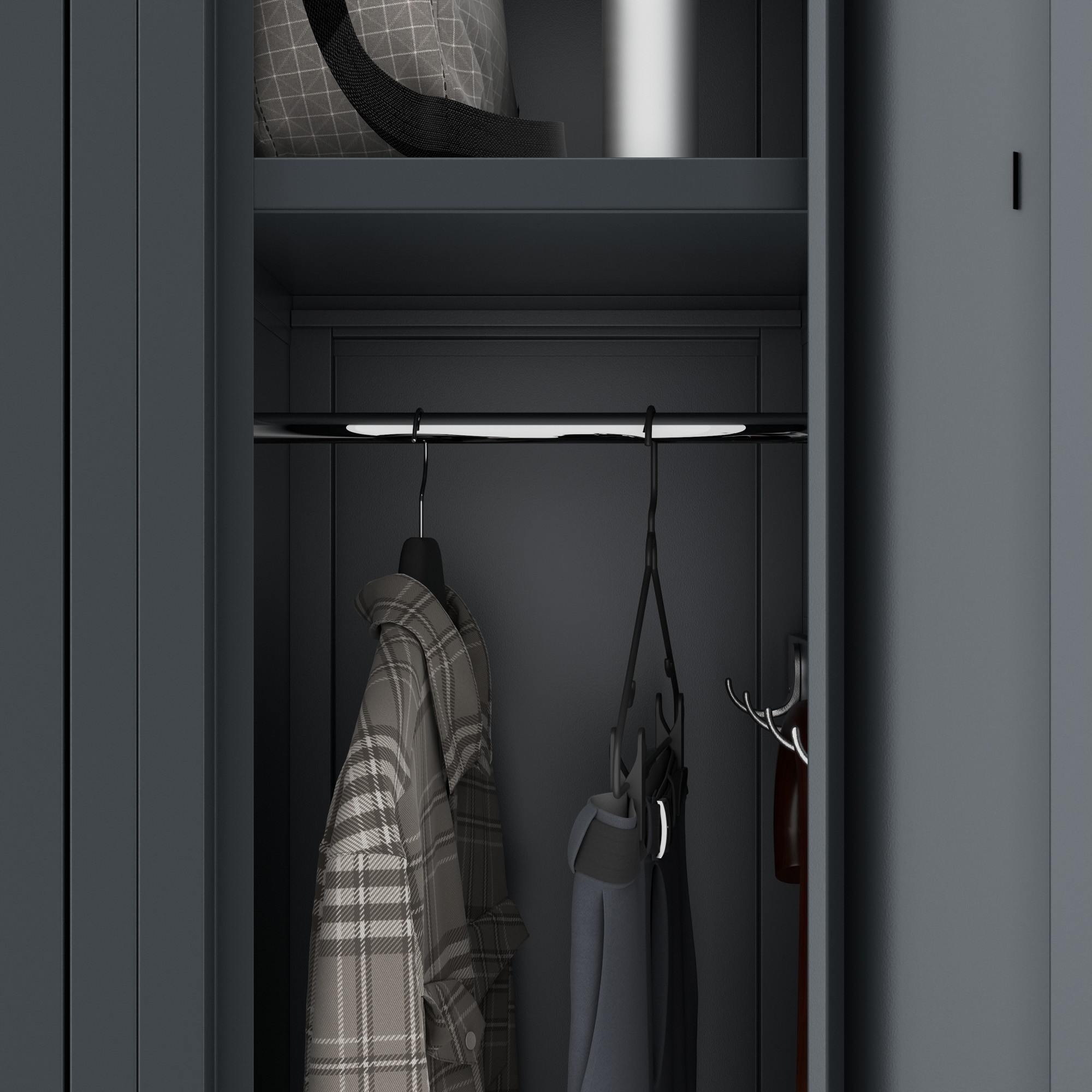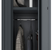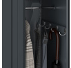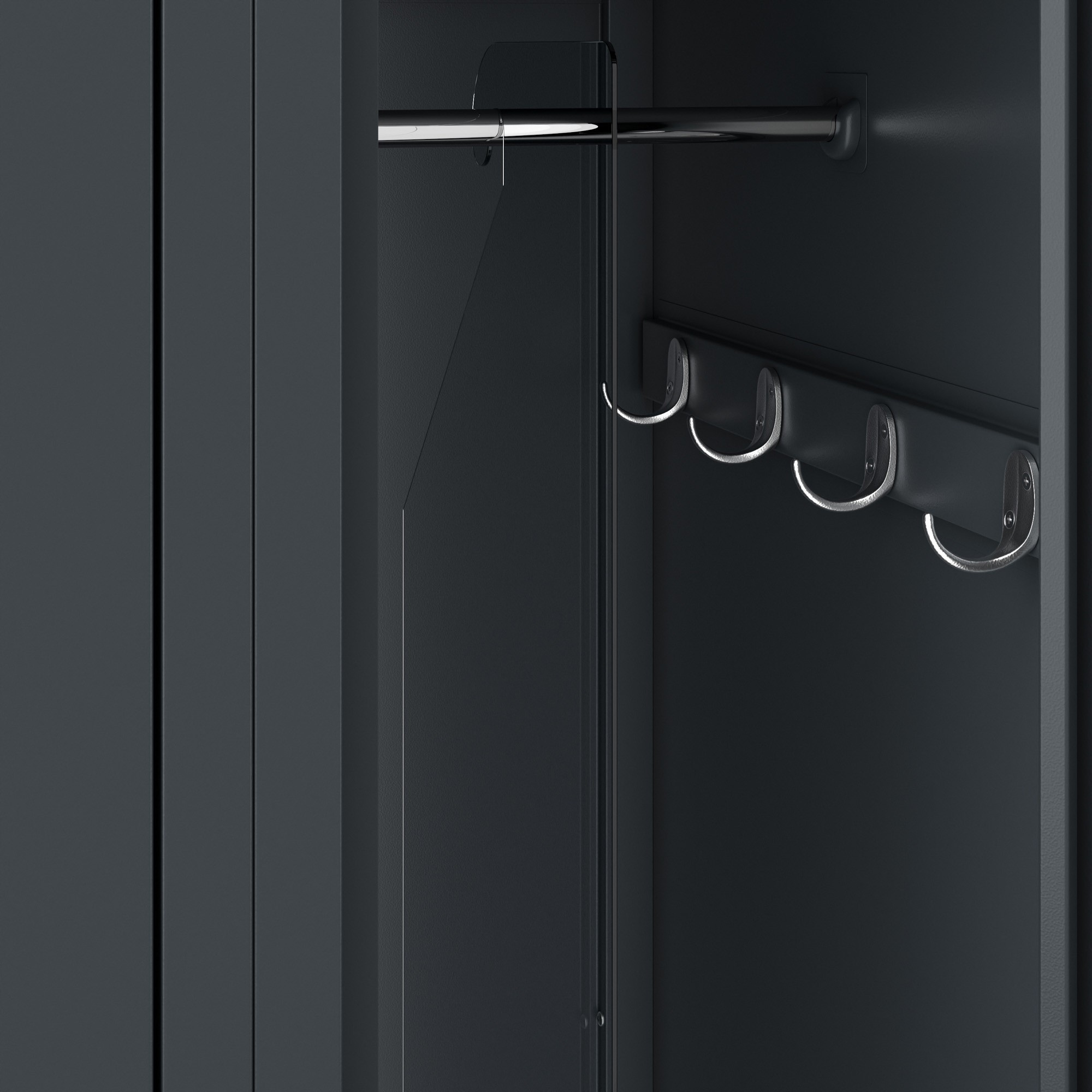 Két fő rekesz elegendő helyet kínál ruhák, cipők és egyéb személyes tárgyak tárolására. A felső polcok ideális helyet biztosítanak táskák, hátizsákok vagy más terjedelmesebb tárgyak tárolására. A praktikus vállfa lehetővé teszi a ruhák kényelmes felakasztását, megakadályozva azok gyűrődését. És a további kampóknak köszönhetően még több lehetőséget kap a tér szervezésére és elrendezésére.Biztonságos tárolás zárható ajtókkal