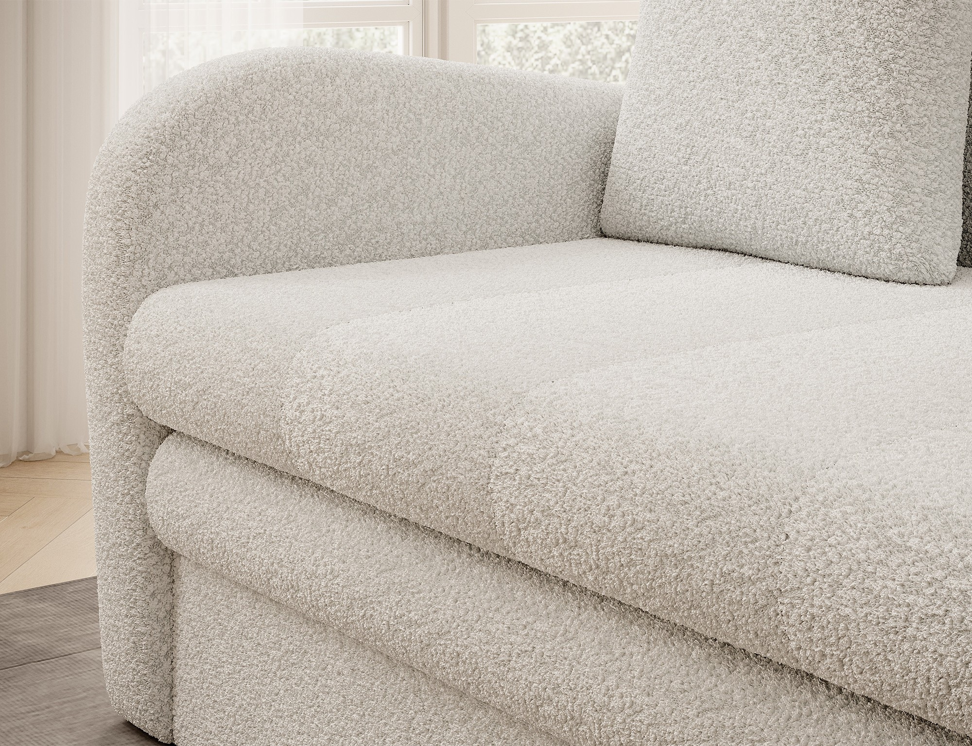 The Ario sofa bed is the answer to the needs of modern apartments. Upholstery available in a variety of colors and fabrics, along with its minimalist design, makes it a perfect fit for a modern interior. Its compact dimensions ensure that the structure does not take up too much space, making it ideal for a youth room, guest room, or small living room. Small 1.5 cm plastic legs protect the floor from scratches. An interesting feature is the use of T28 and T25 foam, which provides significant softness and resilience, preventing deformations. Ario features an easy-to-use sleeping function (surface dimensions: 111 cm x 196 cm) and a spacious bedding storage compartment (85 cm x 61 cm x 13 cm). It is perfect for both occasional and everyday sleeping.