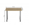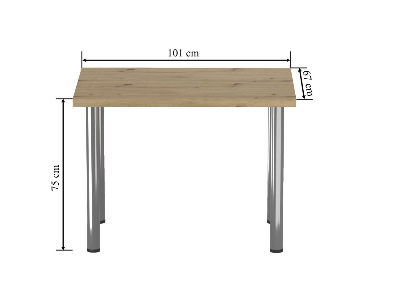 Méretek: - hosszúság: 101 cm - szélesség: 67 cm - magasság: 75 cm - lap vastagsága: 3,8 cm Anyag: - lap: laminált lap - lap szélei: ABS műanyaggal zárva - lábak: krómozott acél Szín: - lap: artisan tölgy - lábak: króm