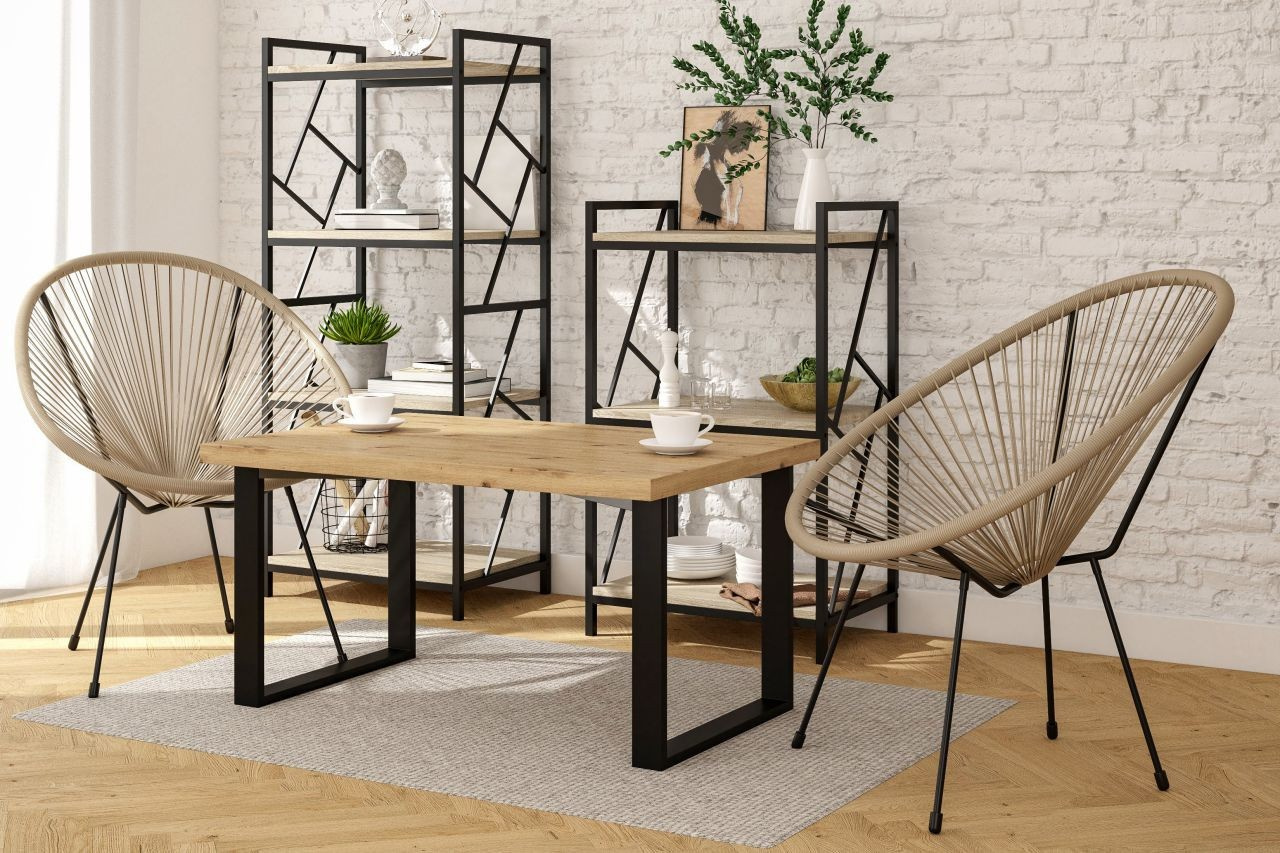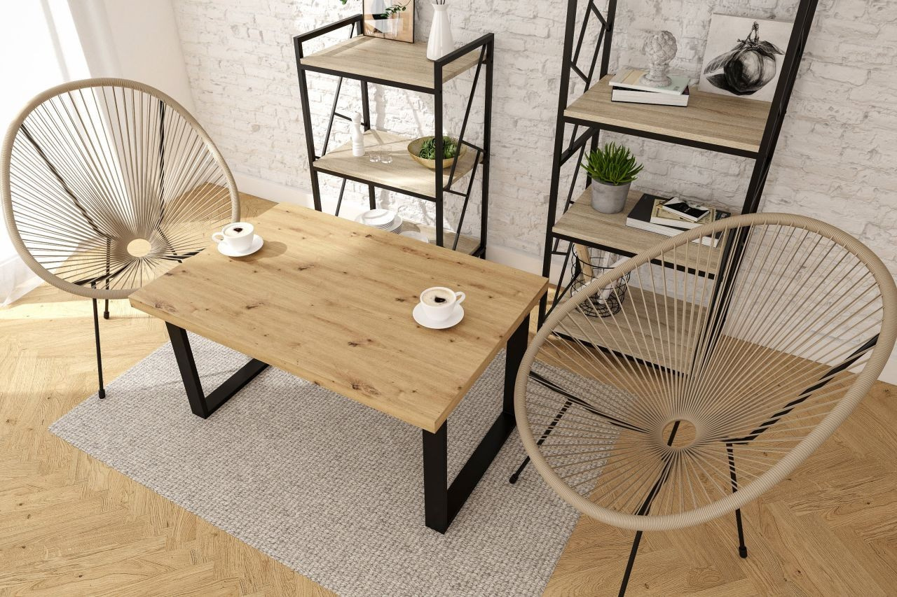 Méretek: - hosszúság: 101 cm - szélesség: 67 cm - magasság: 52 cm - lap vastagsága: 3,8 cm Anyag: - lap: laminált lap - lap szélei: ABS műanyaggal zárva - lábak: porszórt festett acél Szín: - lap: artisan tölgy - lábak: fekete