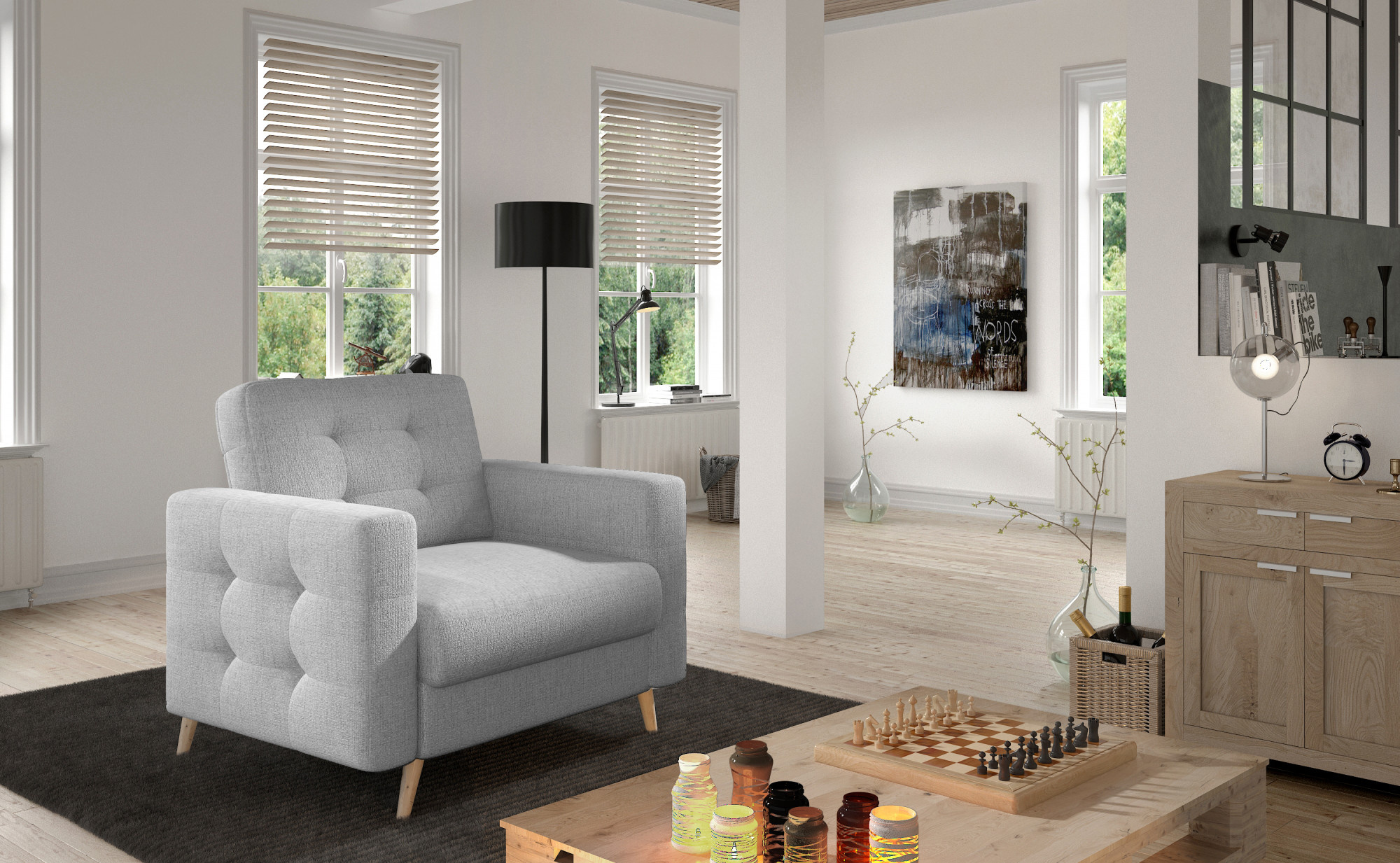 Asgard armchair is a spacious and elegant piece of furniture with dimensions of 105 x 92 x 88 cm, which is maintained in a classic design. Through its decorative quilting on the wooden legs and on the backrest - it will enrich any ordinary corner of the home. The armchair also has a deep, smooth seat, a contoured backrest, a spacious cushion, as well as a multitude of color variations. The incredible comfort of our armchair is also influenced by its filling. Corrugated spring in combination with T30 foam is an excellent solution for connoisseurs of comfort. Thanks to them, the seat is properly contoured, and our spine is properly protected during use. This model, depending on your preferences, can be placed both in the bedroom, living room or study. We fully recommend our Asgard furniture. Such a choice never disappoints!