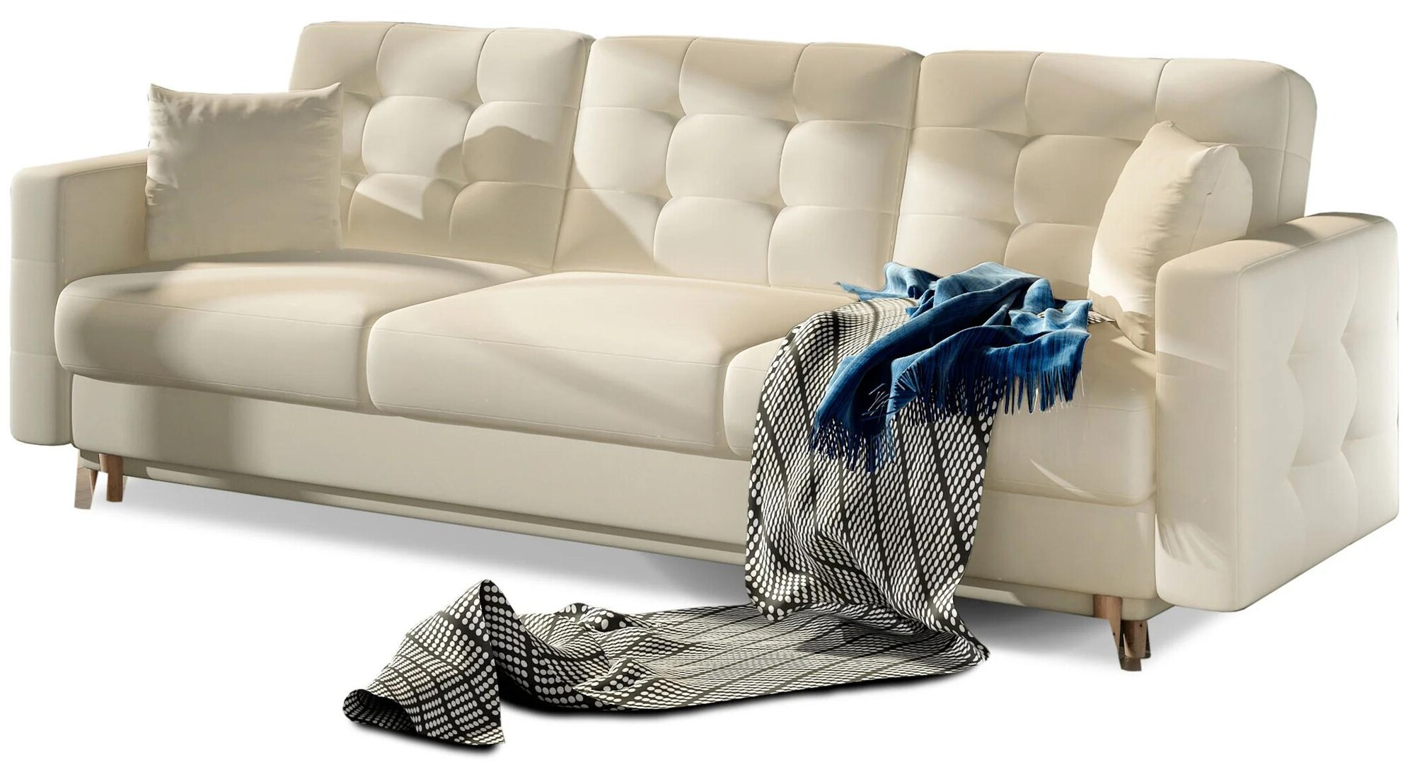 Asgard is an elegant and very stylish sofa for lovers of beautifully arranged interiors. The classic shape, stylish quilting on the cushions and sides give the sofa a unique and cozy character. Asgard is a piece of furniture with dimensions of 233 x 92 x 93 cm - for lounging during the day, and also thanks to the sleeping function - a bed of 133 x 196 cm with an additionally spacious bedding container supported by the DL opening mechanism. Thanks to the use of corrugated spring and T30 foam, the seat of the sofa is extremely flexible, soft and resistant to any kind of deformation. Simple form, elegant finish and secure construction - this is what the Asgard lounge furniture is. It is worth having such a sofa in your apartment to enjoy exceptional comfort and style.