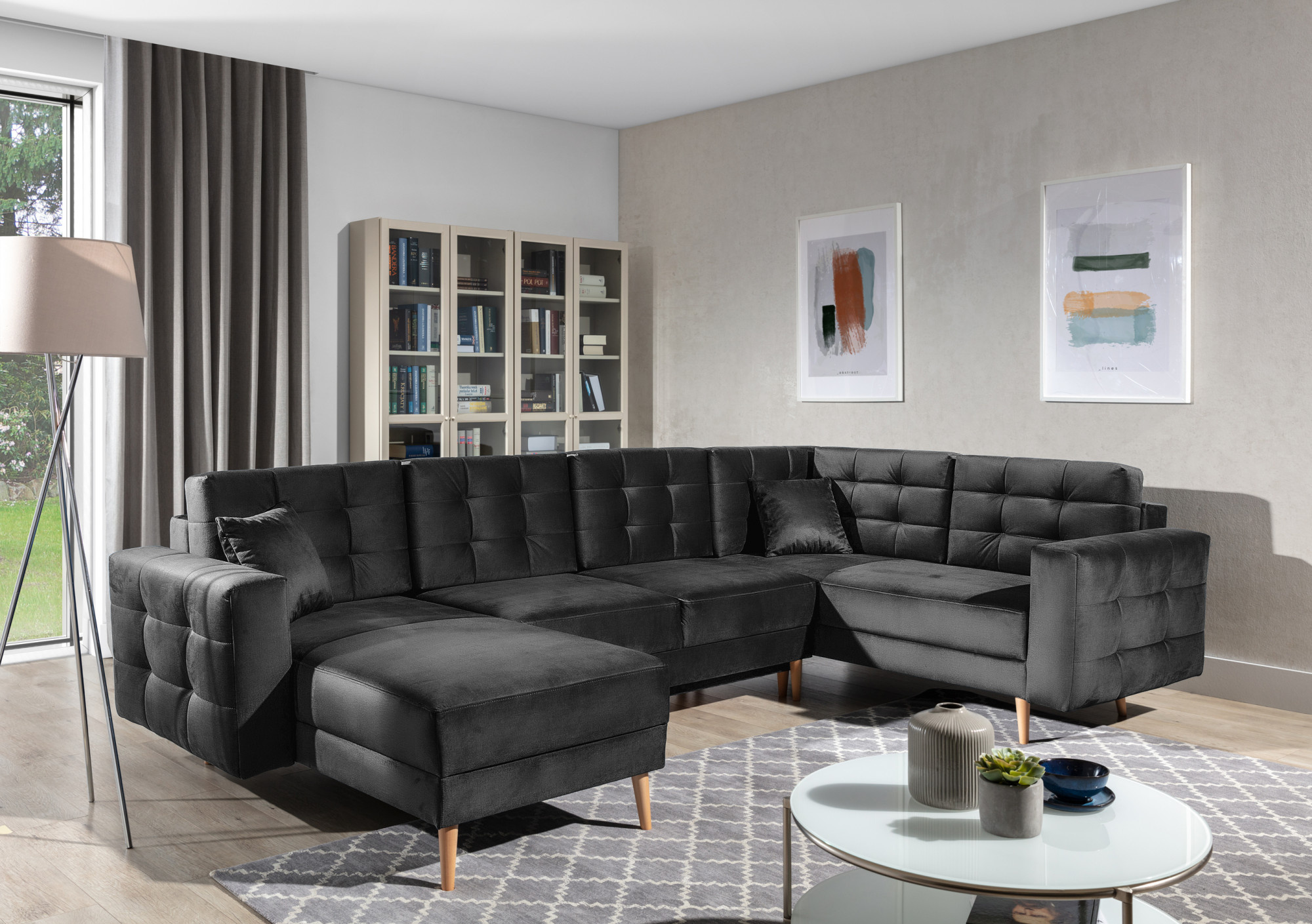 Asgard U is a spacious, comfortable and upholstered corner unit of a considerable size with dimensions of 326x202x93 cm. The U-shaped piece of furniture has a comfortable, soft seat made of a durable wave spring, as well as elastic T30 foam, which is resistant to damage. Our corner unit is equipped with asleeping function and a spacious storage compartment for bedding. After unfolding the furniture with the DL automated mechanism, we gain 282 x 120 cm of space for night rest. The characteristics features of the Asgard U corner unit include: a high, 48 cm seat, an upholstered backrest, elegant quilting and delicate stitching on the back and sides of the corner unit. In addition, we can also list: high, wooden, turned legs as well as a multitude of available colour variants. Asgard U is the quintessence of comfort and good style that will fit perfectly into many interiors.
