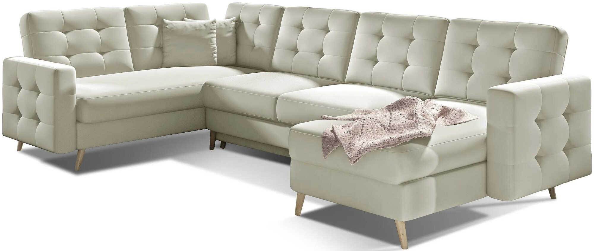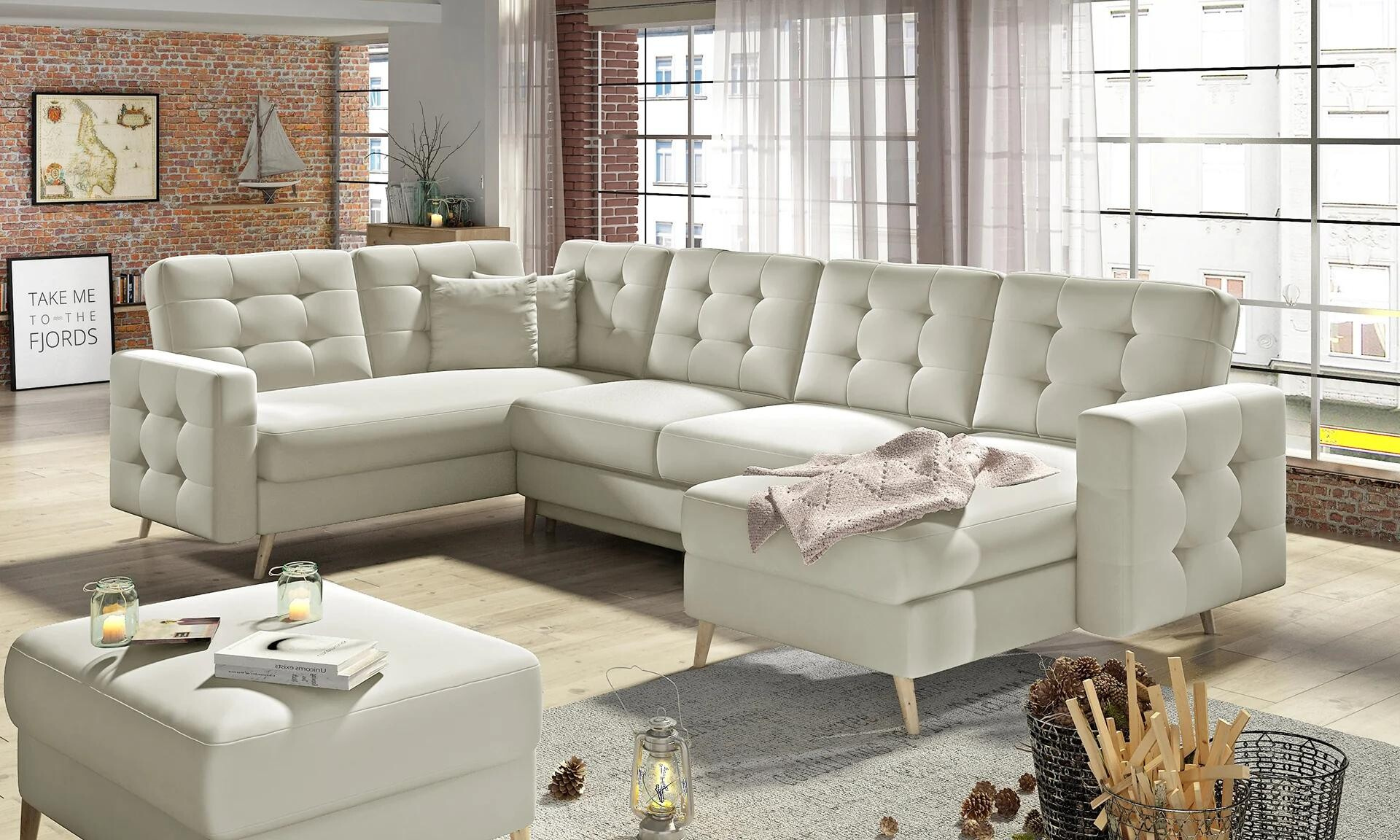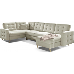 Asgard U is a spacious, comfortable and upholstered corner unit of a considerable size with dimensions of 326x202x93 cm. The U-shaped piece of furniture has a comfortable, soft seat made of a durable wave spring, as well as elastic T30 foam, which is resistant to damage. Our corner unit is equipped with asleeping function and a spacious storage compartment for bedding. After unfolding the furniture with the DL automated mechanism, we gain 282 x 120 cm of space for night rest. The characteristics features of the Asgard U corner unit include: a high, 48 cm seat, an upholstered backrest, elegant quilting and delicate stitching on the back and sides of the corner unit. In addition, we can also list: high, wooden, turned legs as well as a multitude of available colour variants. Asgard U is the quintessence of comfort and good style that will fit perfectly into many interiors.