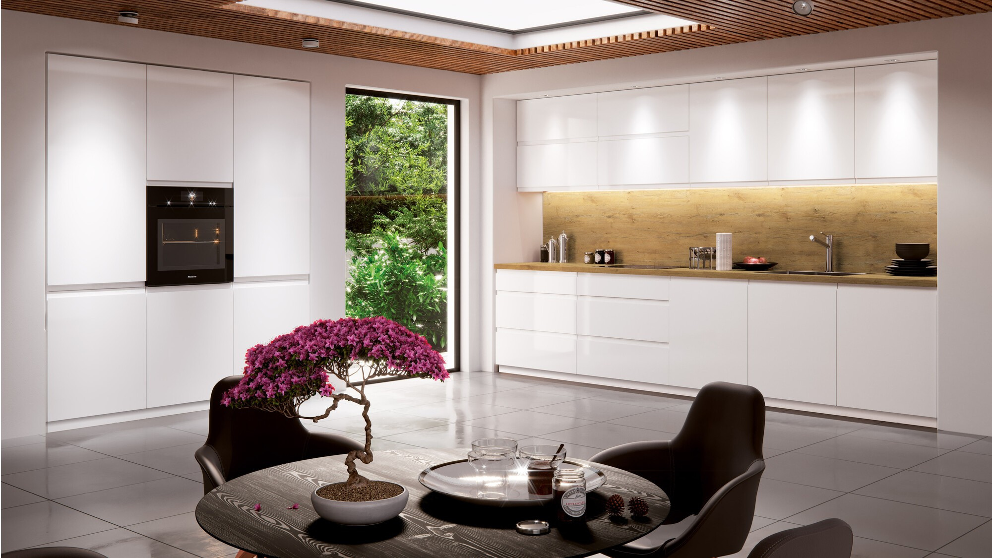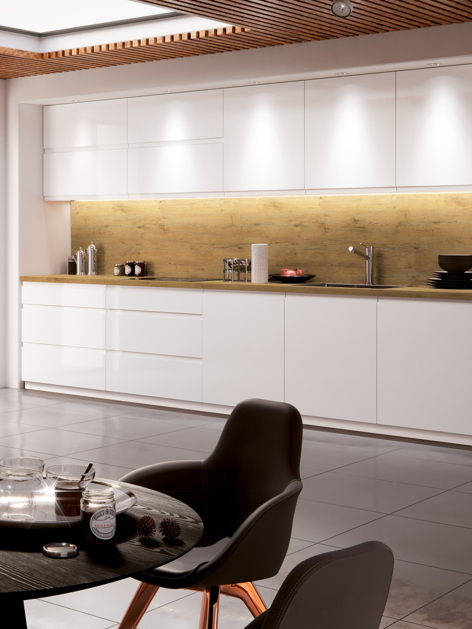 A ASPEN modern konyhabútor kiváló minőségű laminált anyagból készült, MDF ajtókkal kombinálva, amelyek magas fényű lakkozással vannak ellátva.