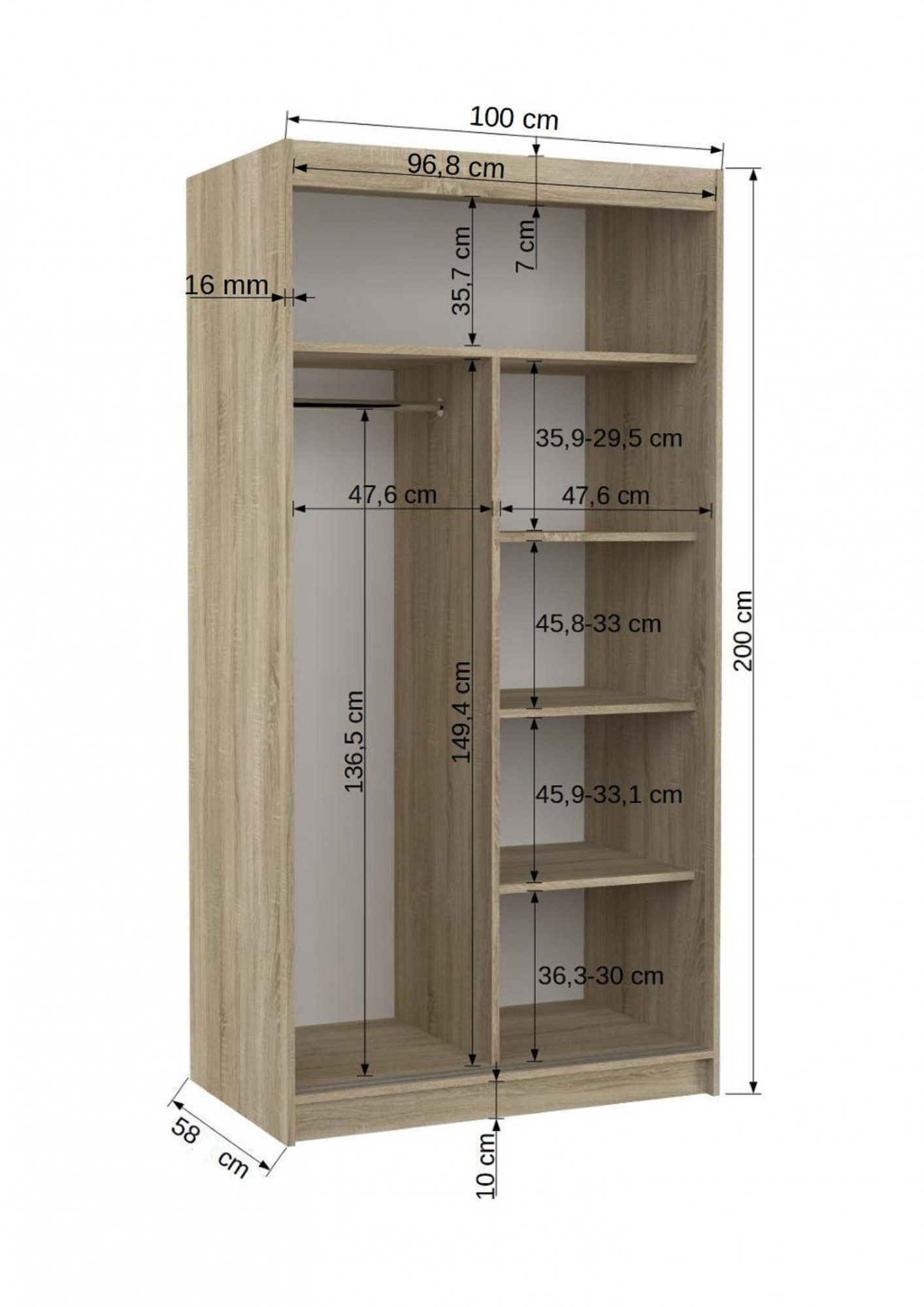 A tolóajtós ASTEN gardróbszekrény ideális módja a tér rendezésének. A bútor tágas polcokkal és egy rúddal van felszerelve, amelyre felakaszthatja a ruhákat, öltönyöket, felsőruházatot vagy ingeket. Annak köszönhetően, hogy a szekrény tolóajtós, nem kell további helyet biztosítani az ajtók kinyitásához, ami ideális megoldássá teszi egy kis szoba vagy keskeny előszoba számára.