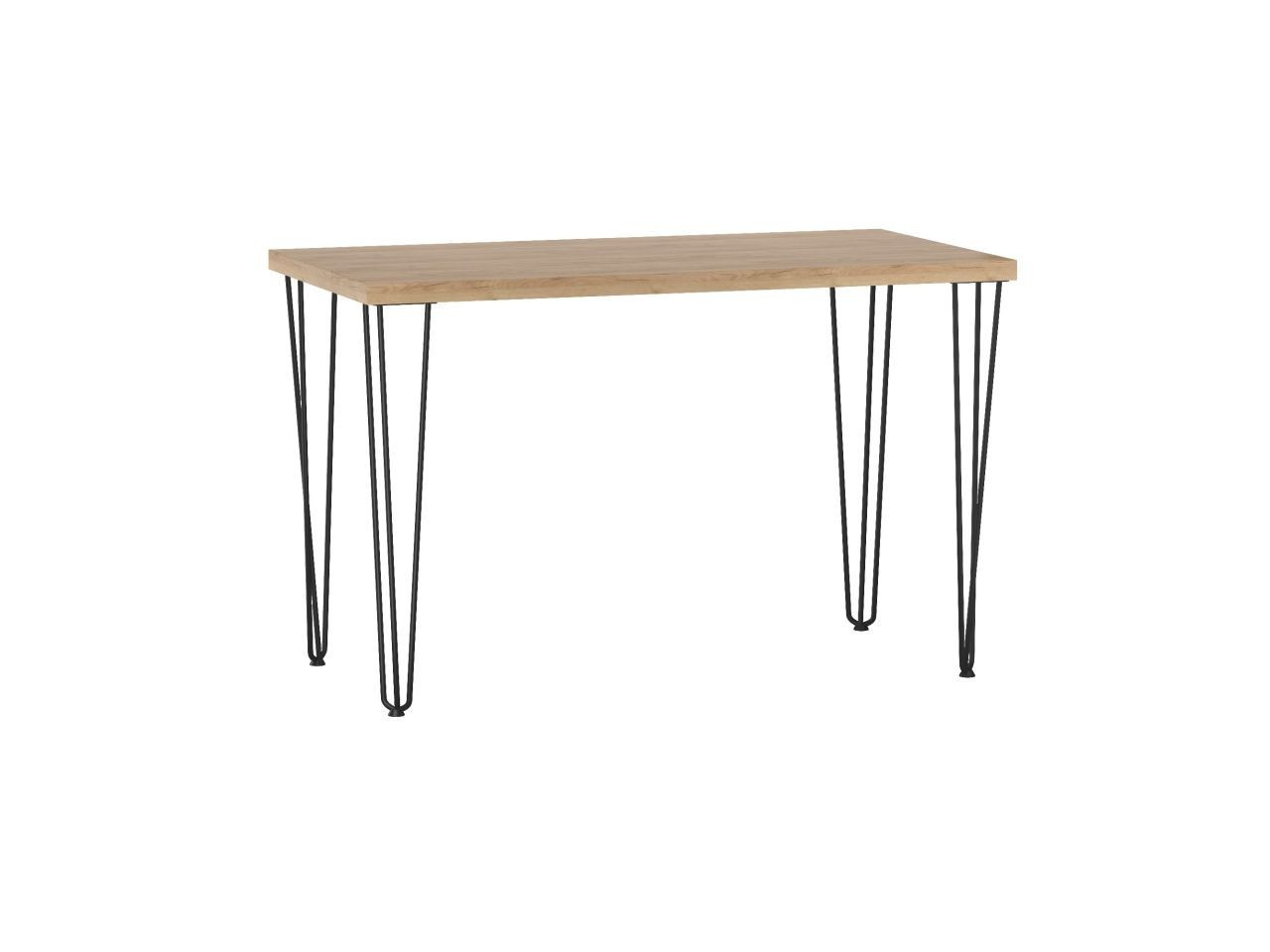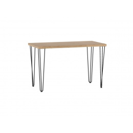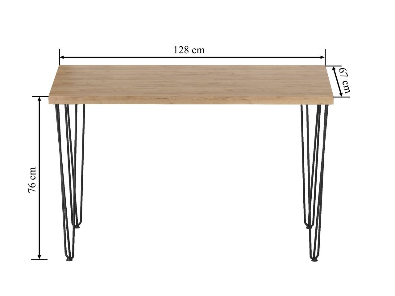 Méretek: - hosszúság: 128 cm - szélesség: 67 cm - magasság: 76 cm - lap vastagsága: 3,8 cm Anyag: - lap: laminált lap - lap szélei: ABS műanyaggal zárva - lábak: porszórt acél Szín: - lap: arany tölgy craft - lábak: fekete
