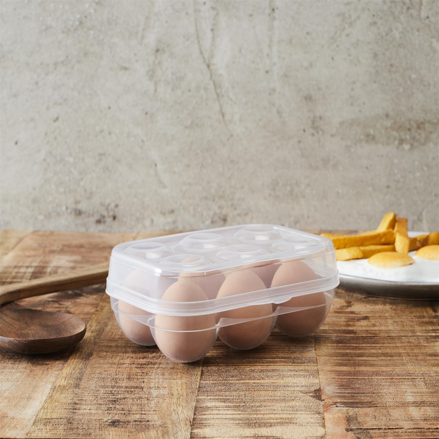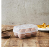 A 6 tojásos tartó műanyagból készült. Zárható rekeszes tároló biztosítja a tojások biztonságos szállítását és hűtőszekrényben való tárolását.