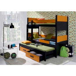 LAZARO je dětská patrová postel pro 3 děti s výsuvným lůžkem z lakovaného borovicového dřeva (pouze konstrukce postele), barevné doplňky jsou z materiálu PVC. Hrany postele jsou kryty lištami ABS. V ceně postele jsou také 2 úložné šuplíky. Maximální nosnost horní postele je 80 kg, spodní postele pak 120 kg.