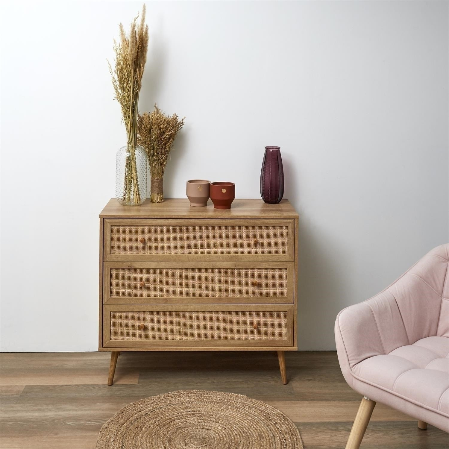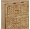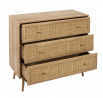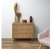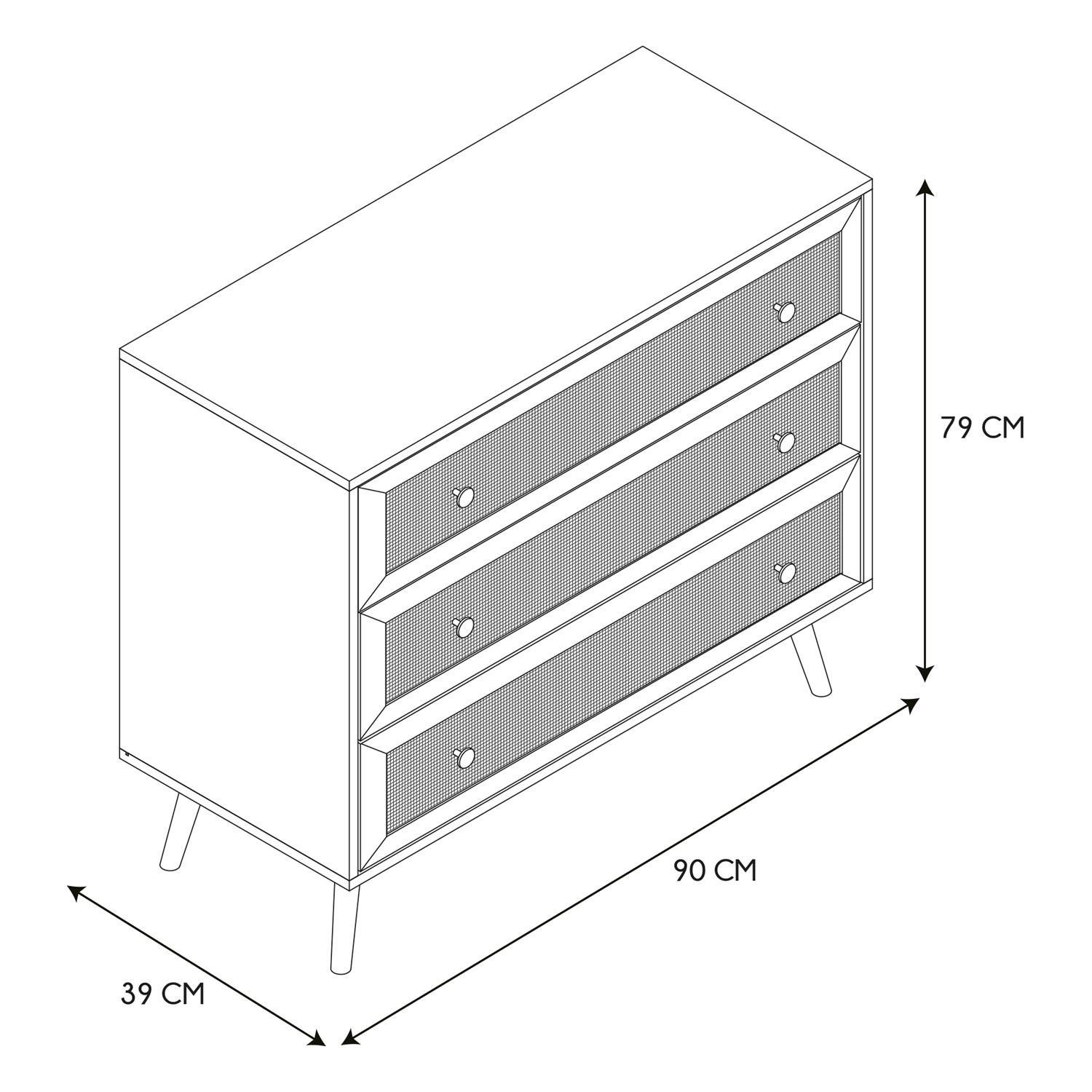 A Bali komód három fiókkal boho stílusú fonott előlapokkal rendelkezik. A komód alapját négy láb képezi, amelyek kialakításuknak köszönhetően stabilitást biztosítanak. A Bali komód lesz a legszebb bútordarab a belső terében, három tágas fiókja segít rendszerezni a ruhákat, apróságokat vagy evőeszközöket. A komód korlátlan lehetőségei lehetővé teszik, hogy ne csak a hálószobában, hanem a boho stílusú nappaliban vagy akár az irodában is bútordarab legyen. - Fő összetétel: forgácslap. A bútor összeszerelést igényel. Csomag méretei: 42 x 15 x 94 cm