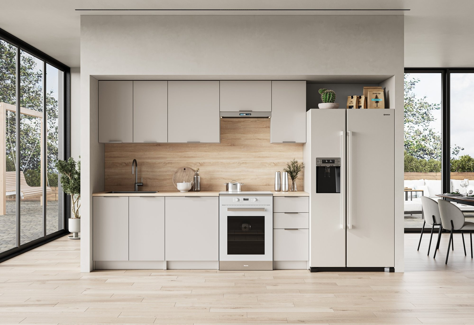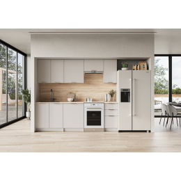 összeszerelés hossza: 240 cm, gázrugók, magas felső szekrények, munkalap vastagsága 28 mm, színek: előlapok – kasmír, korpusz - kasmír, munkalap - sonoma tölgy