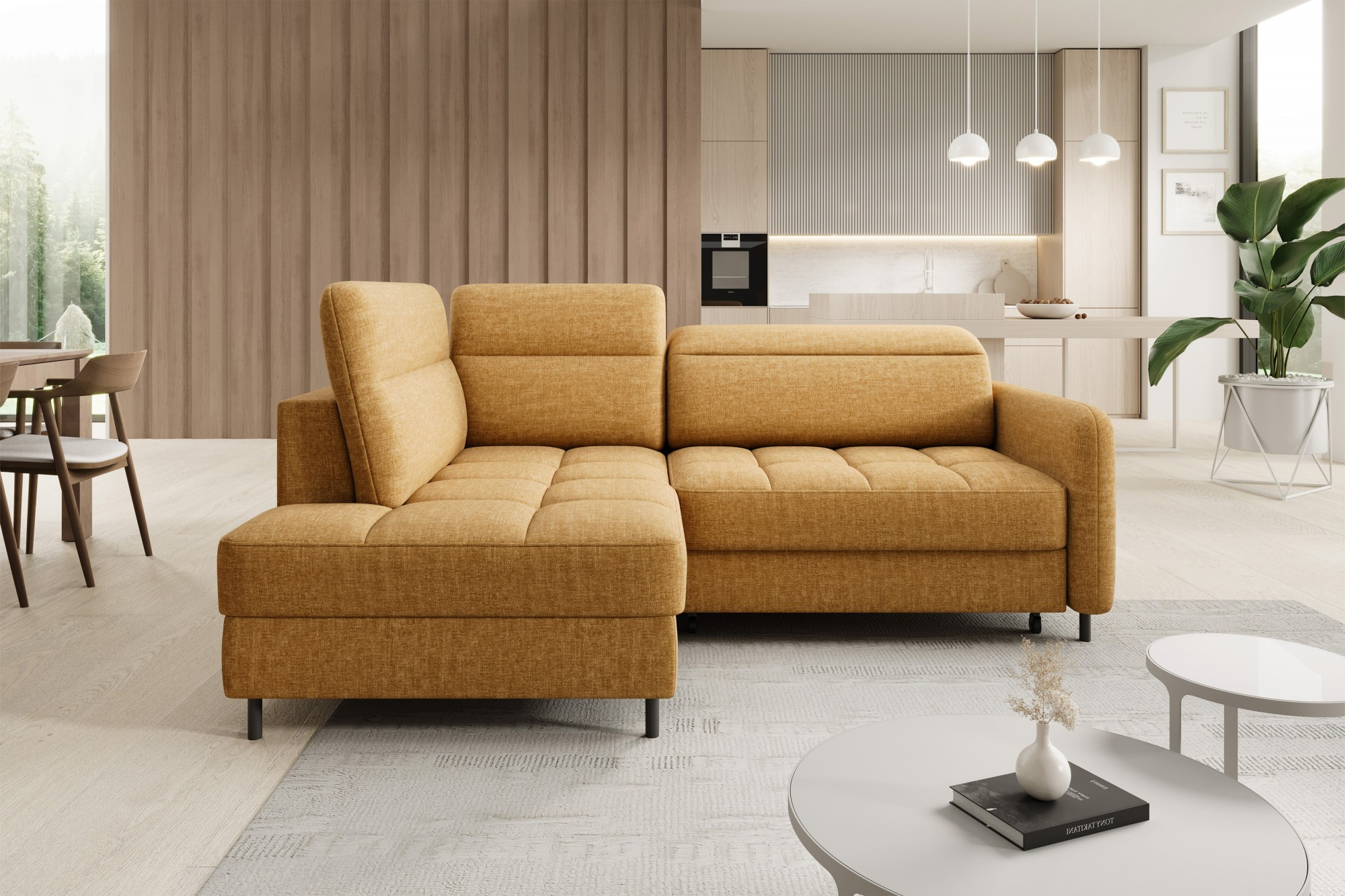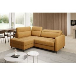 The Barea corner sofa is an elegant and functional piece of furniture measuring 208x160x100 cm, equipped with adjustable headrests and metal black legs with a height of 10 cm. Its solid construction made from high-quality materials ensures durability, and the carefully contoured seat and backrest guarantee comfort and proper support for the back. The modern design of the Barea corner sofa makes it a perfect fit for both minimalist and more sophisticated interior arrangements. Available in various fabric and color options, it is both aesthetic and functional, ideal for everyday relaxation and entertaining guests.