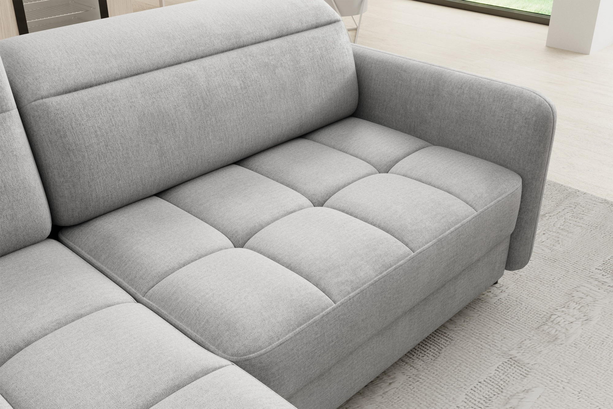 The Barea corner sofa is an elegant and functional piece of furniture measuring 208x160x100 cm, equipped with adjustable headrests and metal black legs with a height of 10 cm. Its solid construction made from high-quality materials ensures durability, and the carefully contoured seat and backrest guarantee comfort and proper support for the back. The modern design of the Barea corner sofa makes it a perfect fit for both minimalist and more sophisticated interior arrangements. Available in various fabric and color options, it is both aesthetic and functional, ideal for everyday relaxation and entertaining guests.