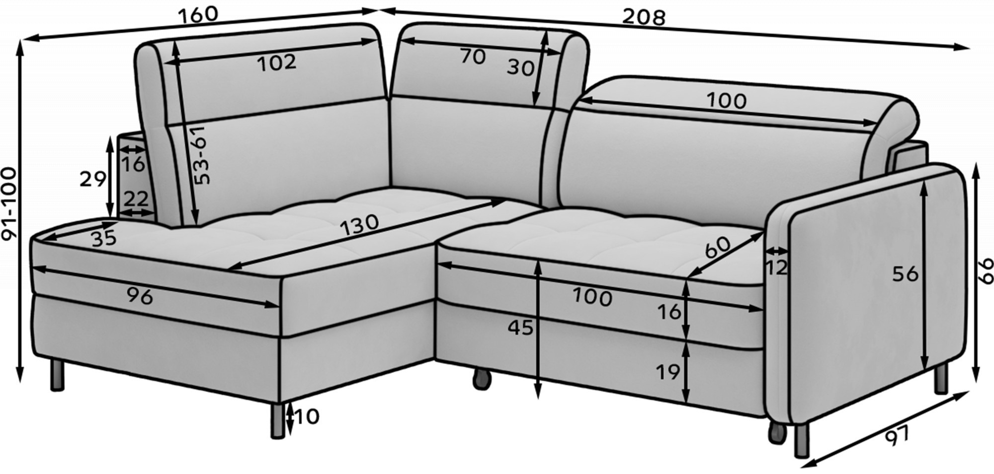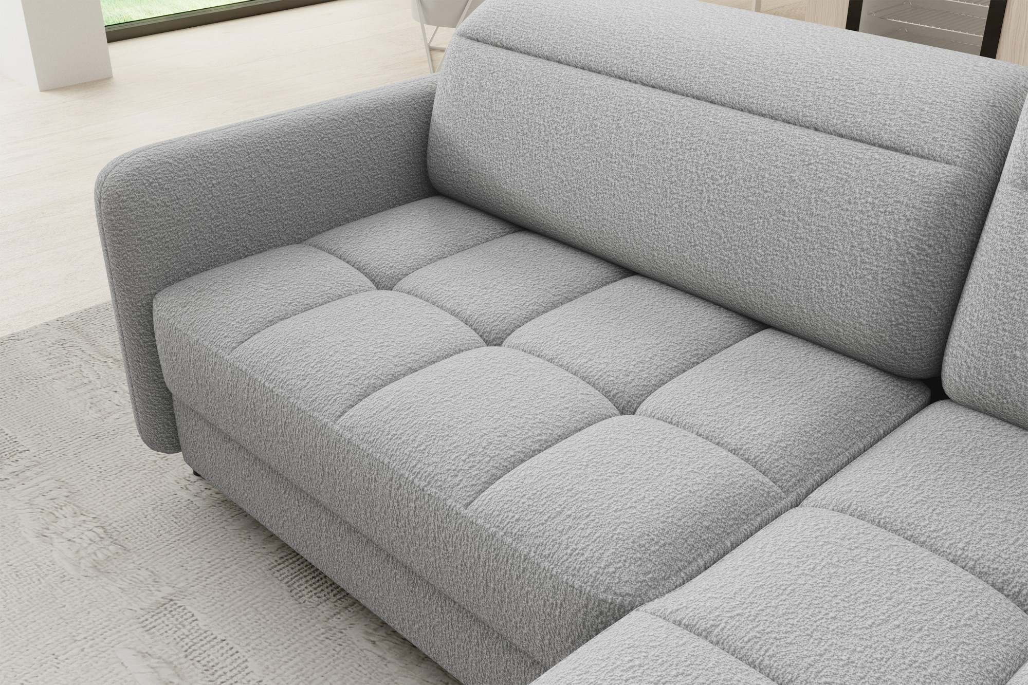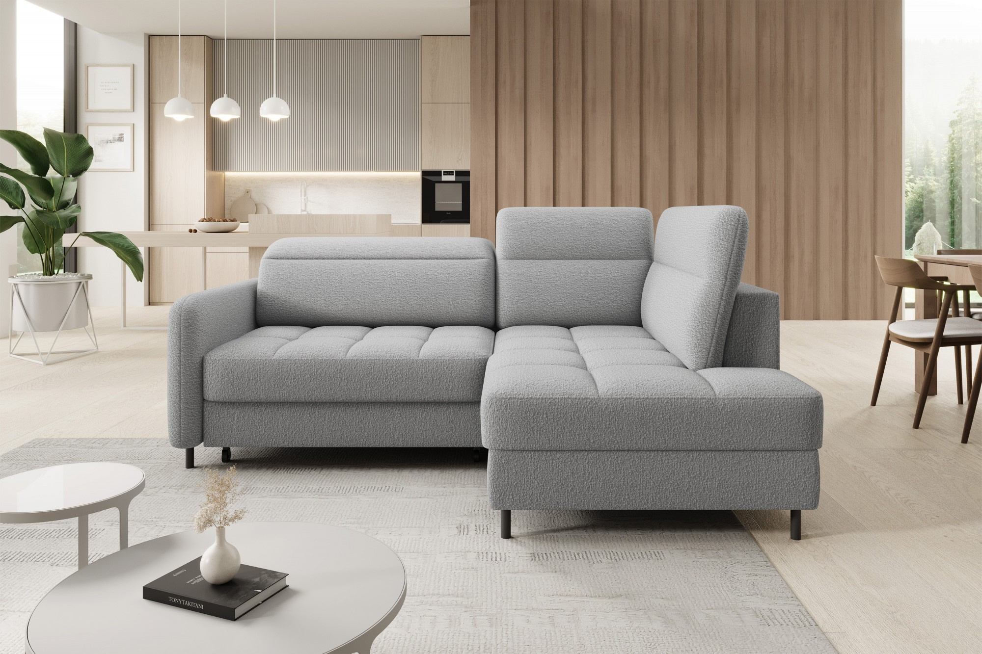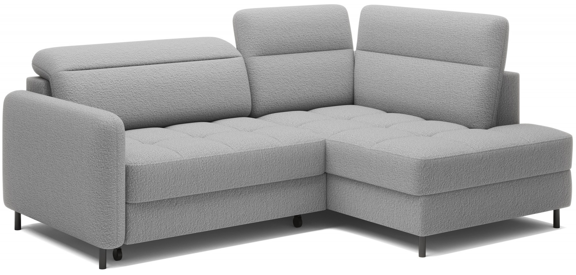 The Barea corner sofa is an elegant and functional piece of furniture measuring 208x160x100 cm, equipped with adjustable headrests and metal black legs with a height of 10 cm. Its solid construction made from high-quality materials ensures durability, and the carefully contoured seat and backrest guarantee comfort and proper support for the back. The modern design of the Barea corner sofa makes it a perfect fit for both minimalist and more sophisticated interior arrangements. Available in various fabric and color options, it is both aesthetic and functional, ideal for everyday relaxation and entertaining guests.