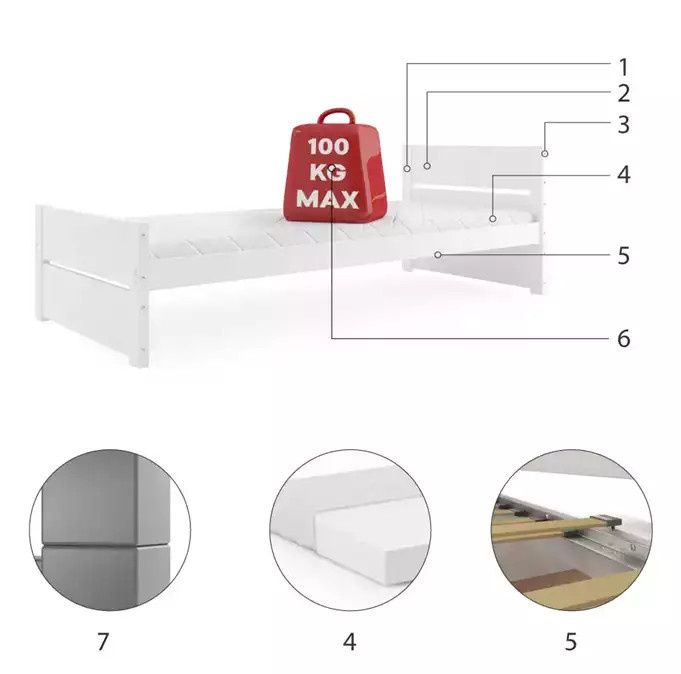 - Rama łóżka - wykonana z drewna sosnowego, pomalowana lakierem wodnym.