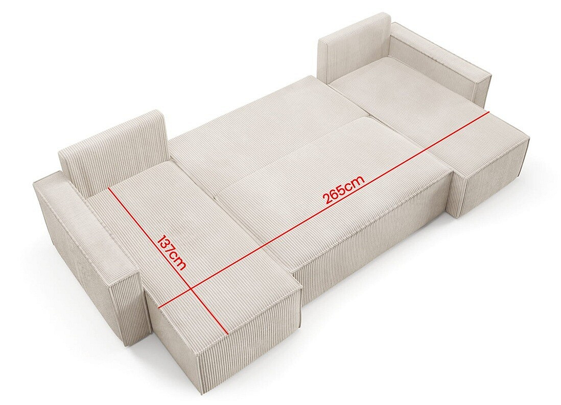 Ennek a kanapénak az egyik legnagyobb előnye a kihúzható funkció. Könnyen átalakítható kényelmes fekhellyé, amelynek alvófelülete 265x137 cm. Ez ideális megoldás azoknak a vendégeknek, akik éjszakára maradnak, vagy azokban a pillanatokban, amikor napközben szeretne pihenni.