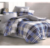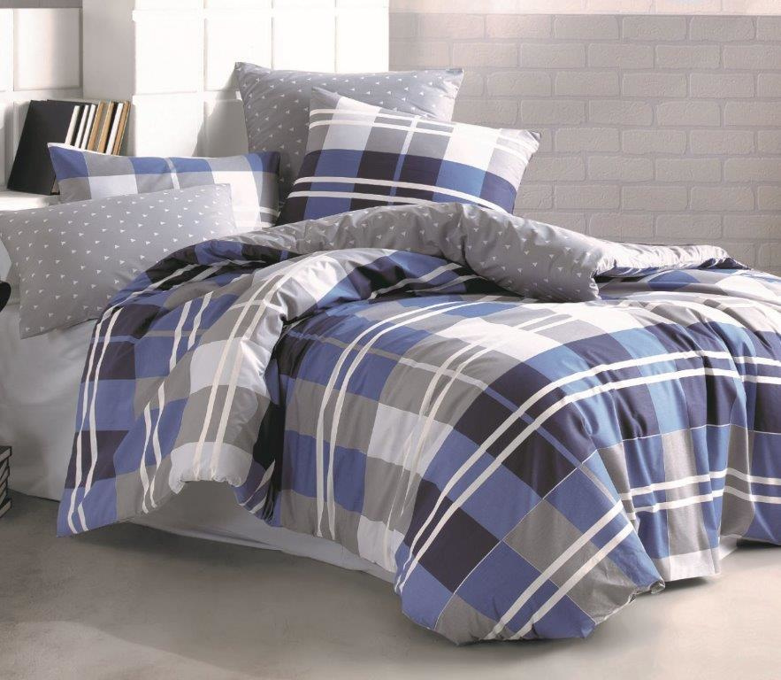 Bavlněný povlak Grand DUO je kombinace modrých, šedých, bílých pruhů a čtverců z jedné stany zjemní druhá strana šedá, s velmi decentním bílým tiskem.