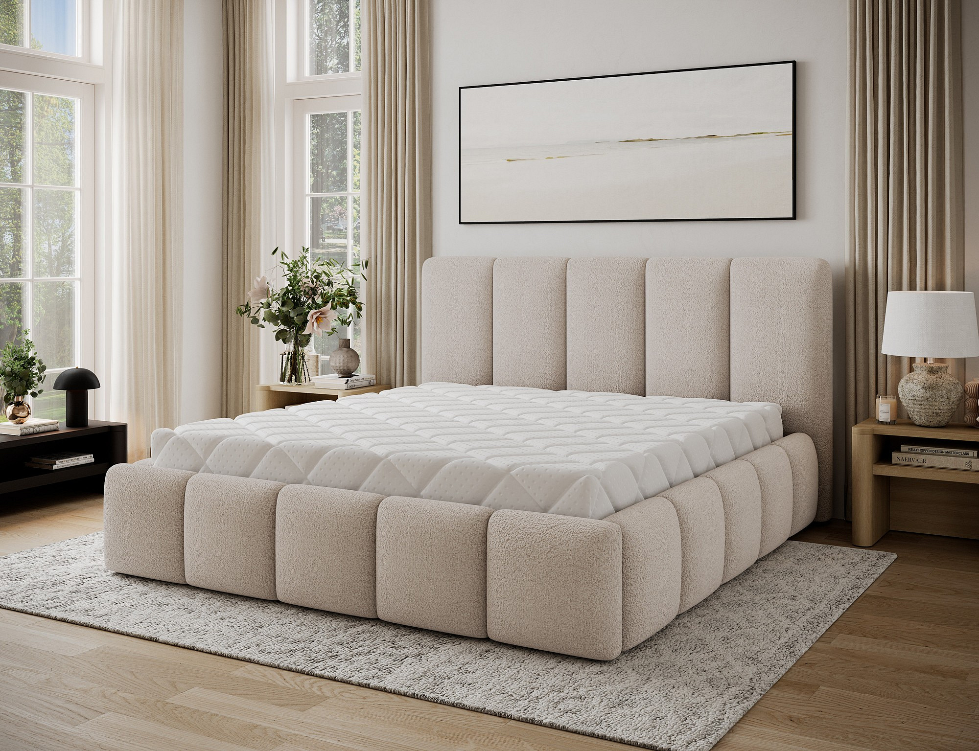 Edvige is an exceptionally comfortable, tasteful, and original glamour-style bed that impresses with its unique form. The sleeping surface dimensions – available in 140/160/180 × 200 cm – provide ample space for comfortable rest and can be chosen according to individual preferences, room size, and bedroom layout. Edvige stands out thanks to its high headboard and bed sides made with additional foam for the tufting, while the aesthetic effect is enhanced by elongated, spacious quilting. A wide range of color options makes it easy to match the bed with other elements of the bedroom décor. In this design, modernity and a contemporary finish go hand in hand with elegance, making Edvige a perfect addition to any bedroom and a piece that is certainly worth having.