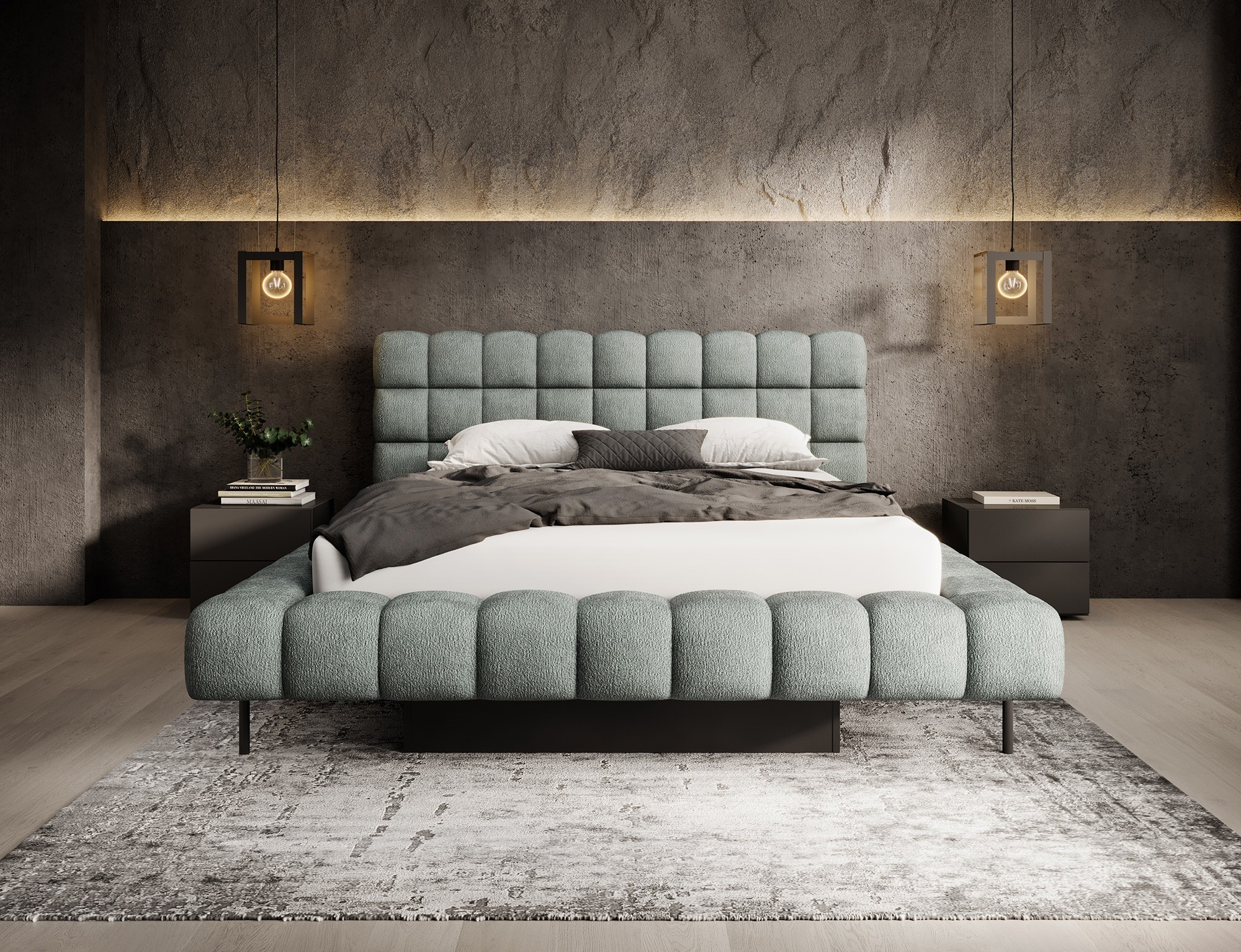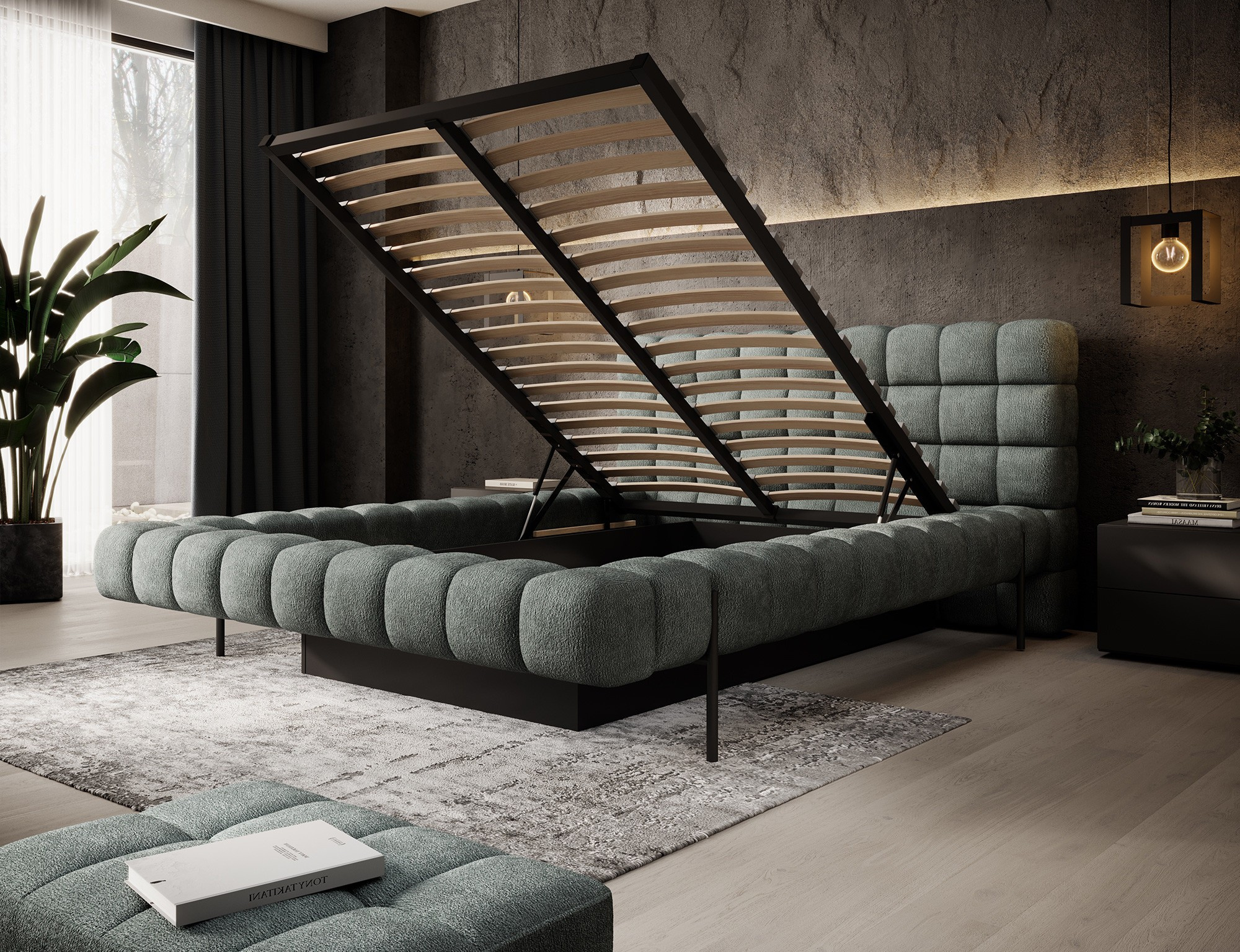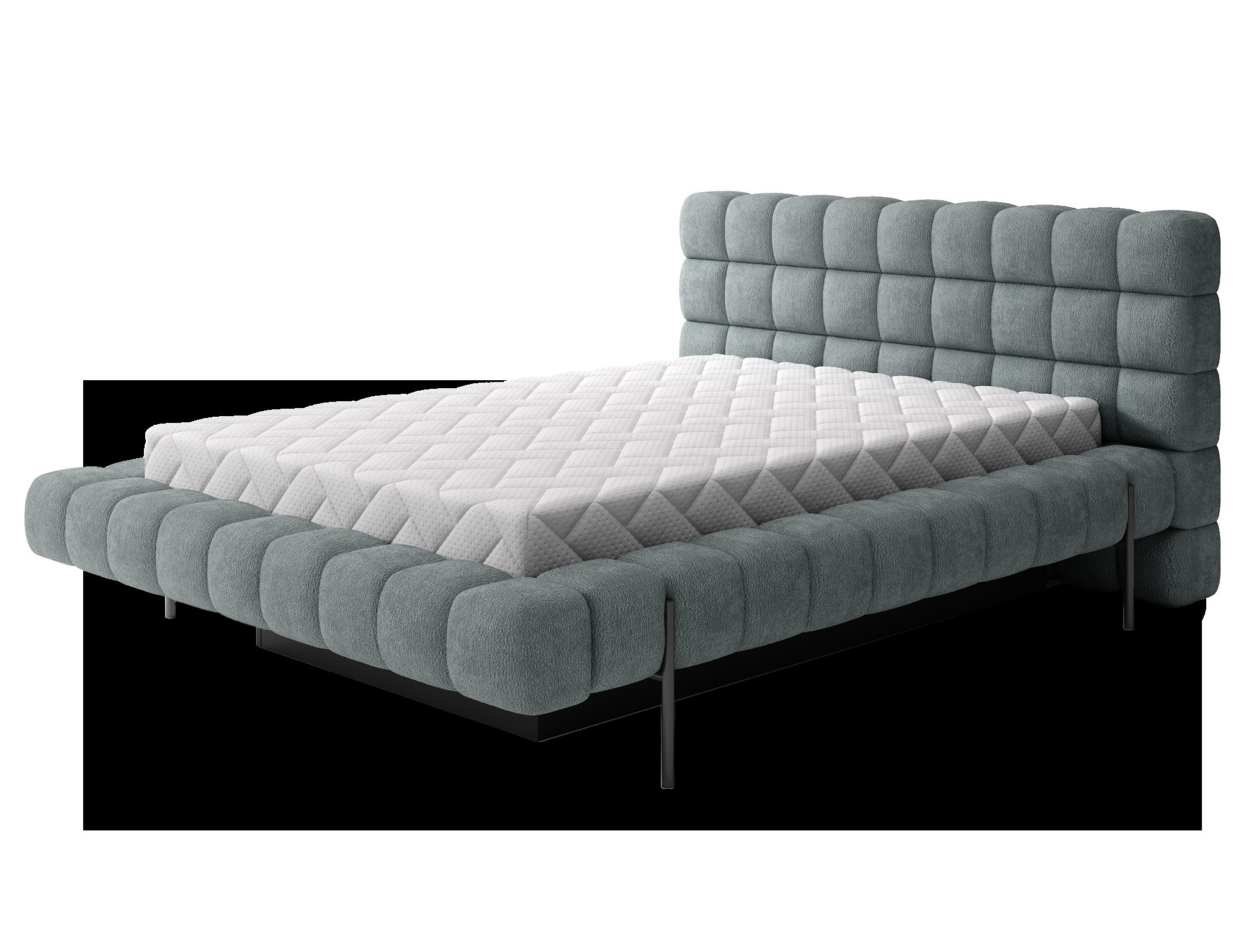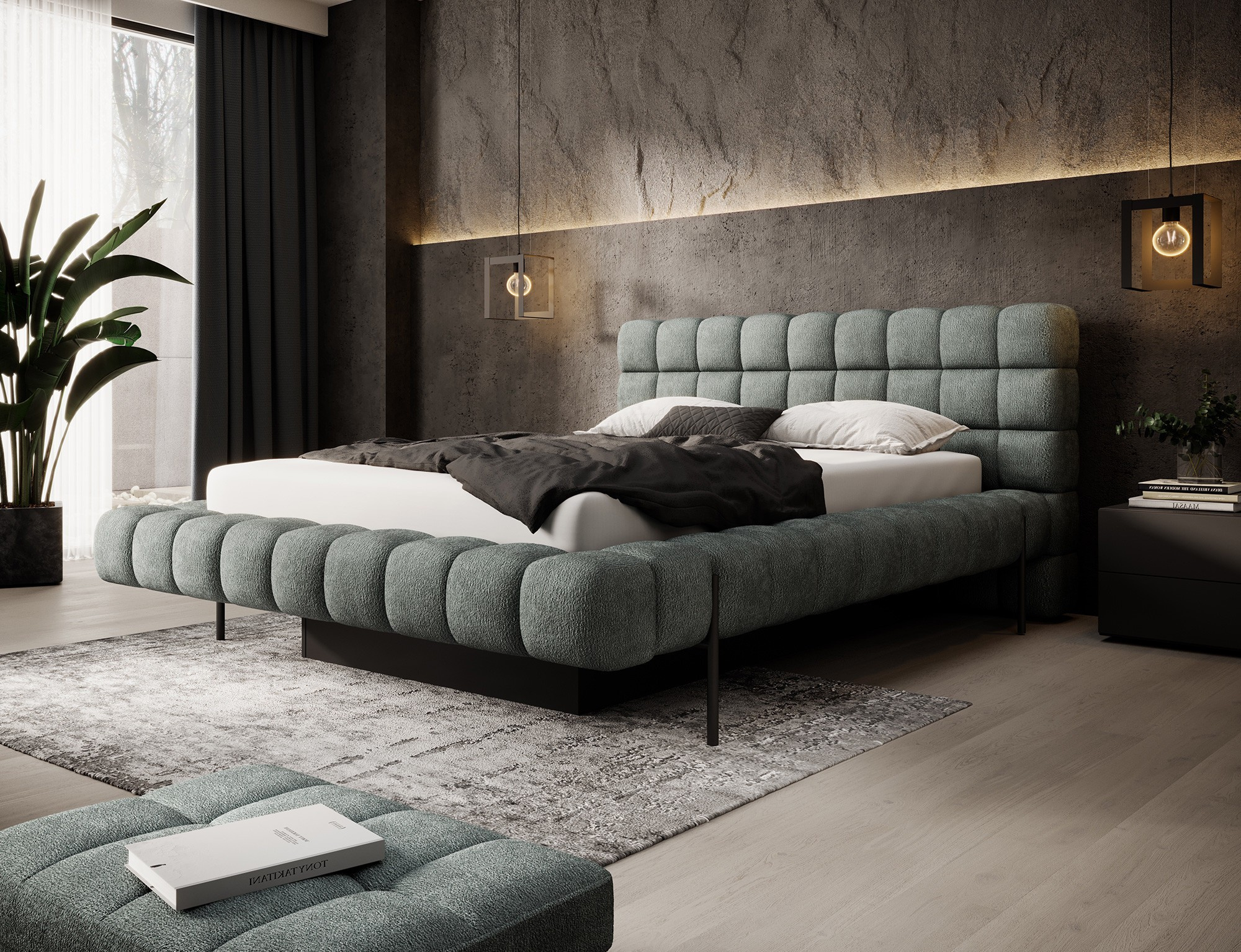 The Magentta bed combines modern design, functionality, and exceptional comfort. Its upholstered backrest adds a touch of elegance and coziness, making it a perfect centerpiece for any bedroom. The sturdy frame and headboard are filled with high-quality T2130 foam, providing excellent support and comfort whether you’re sleeping or relaxing. Available in three sizes: 140 cm, 160 cm, 180 cm, it fits a variety of spaces and personal preferences.The metal frame includes 36 slats, evenly distributing the mattress's weight to enhance durability and provide superior support. The black metal leg ensures a stable base while emphasizing the sleek, minimalist design. A practical storage compartment for bedding offers an efficient solution for organizing duvets, pillows, and other linens, optimizing your bedroom space. The Magentta bed is the ideal choice for those who value modern aesthetics, comfort, and practicality.