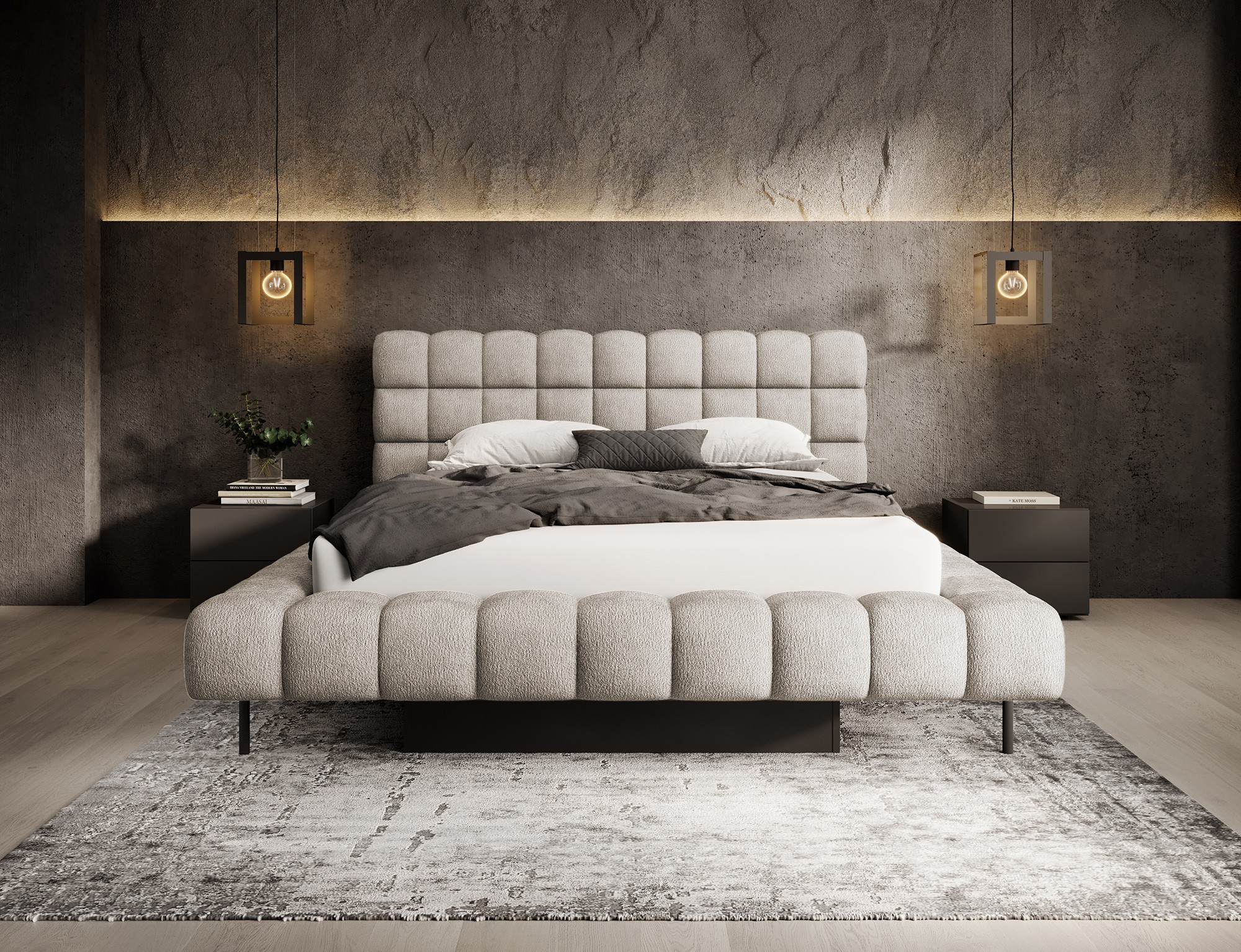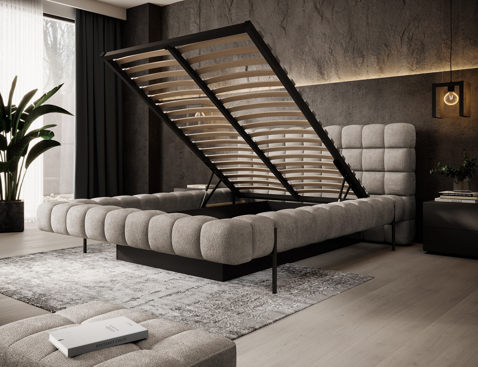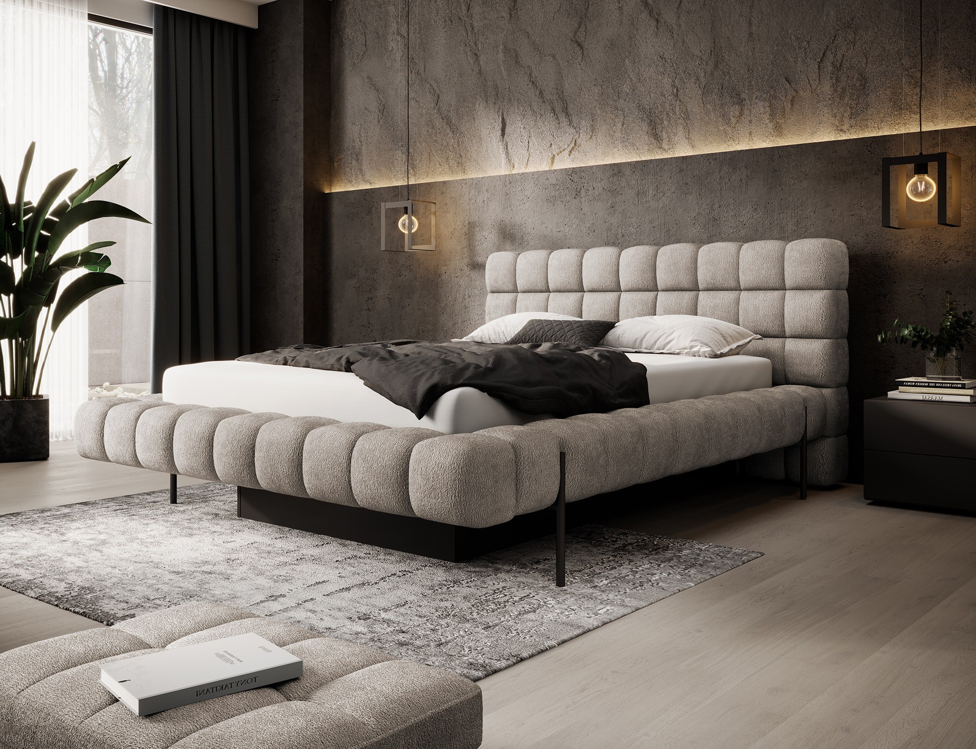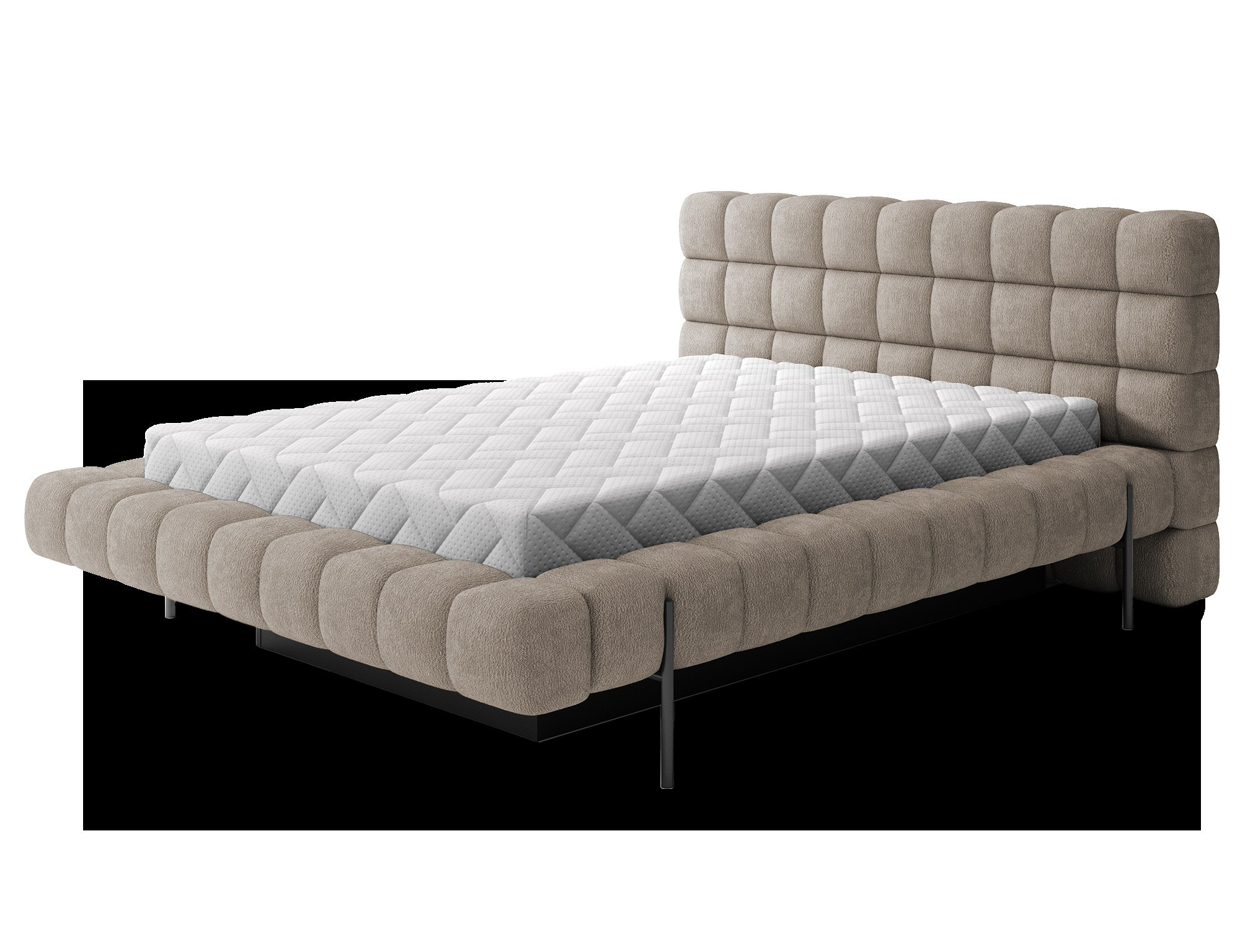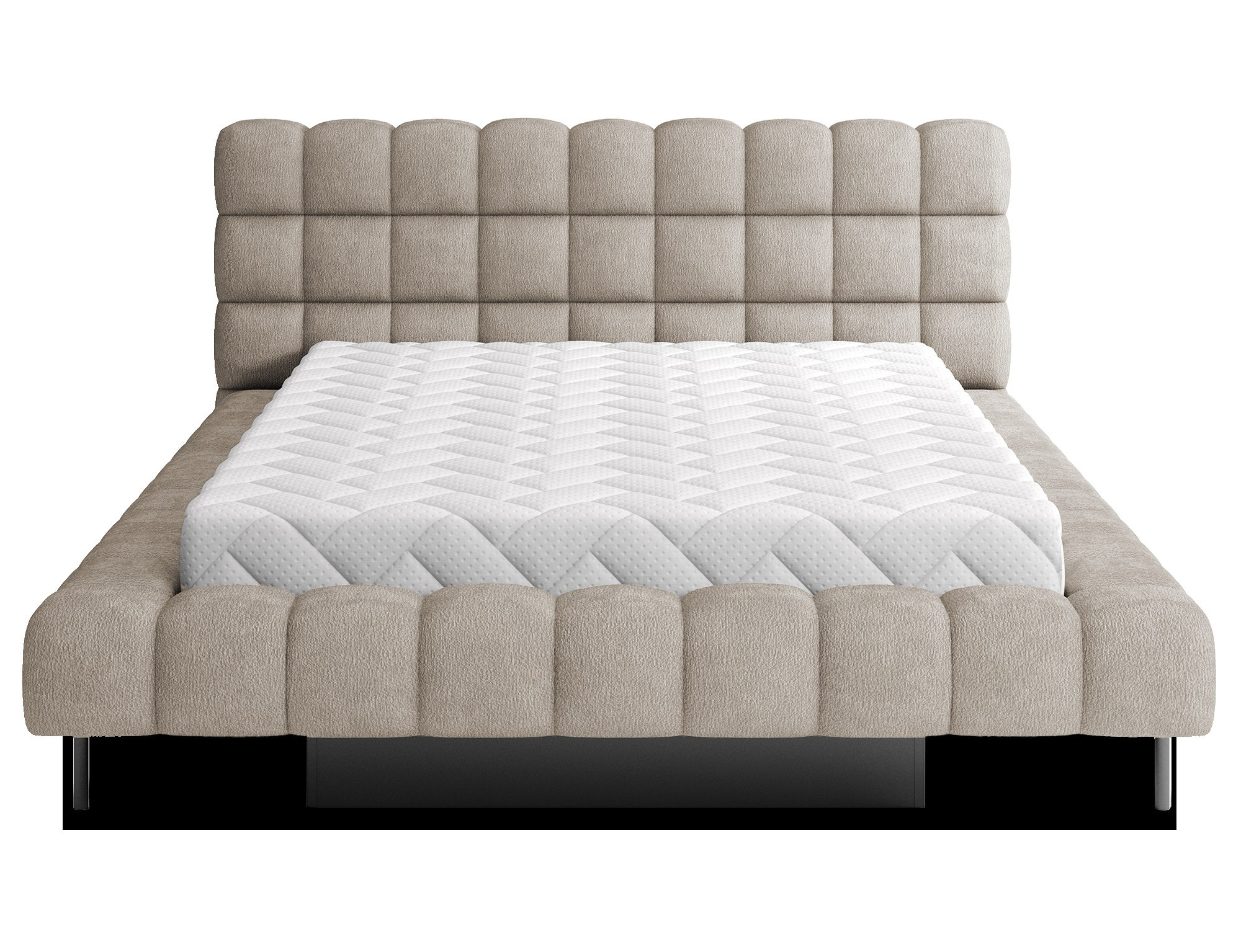 The Magentta bed combines modern design, functionality, and exceptional comfort. Its upholstered backrest adds a touch of elegance and coziness, making it a perfect centerpiece for any bedroom. The sturdy frame and headboard are filled with high-quality T2130 foam, providing excellent support and comfort whether you’re sleeping or relaxing. Available in three sizes: 140 cm, 160 cm, 180 cm, it fits a variety of spaces and personal preferences.The metal frame includes 36 slats, evenly distributing the mattress's weight to enhance durability and provide superior support. The black metal leg ensures a stable base while emphasizing the sleek, minimalist design. A practical storage compartment for bedding offers an efficient solution for organizing duvets, pillows, and other linens, optimizing your bedroom space. The Magentta bed is the ideal choice for those who value modern aesthetics, comfort, and practicality.