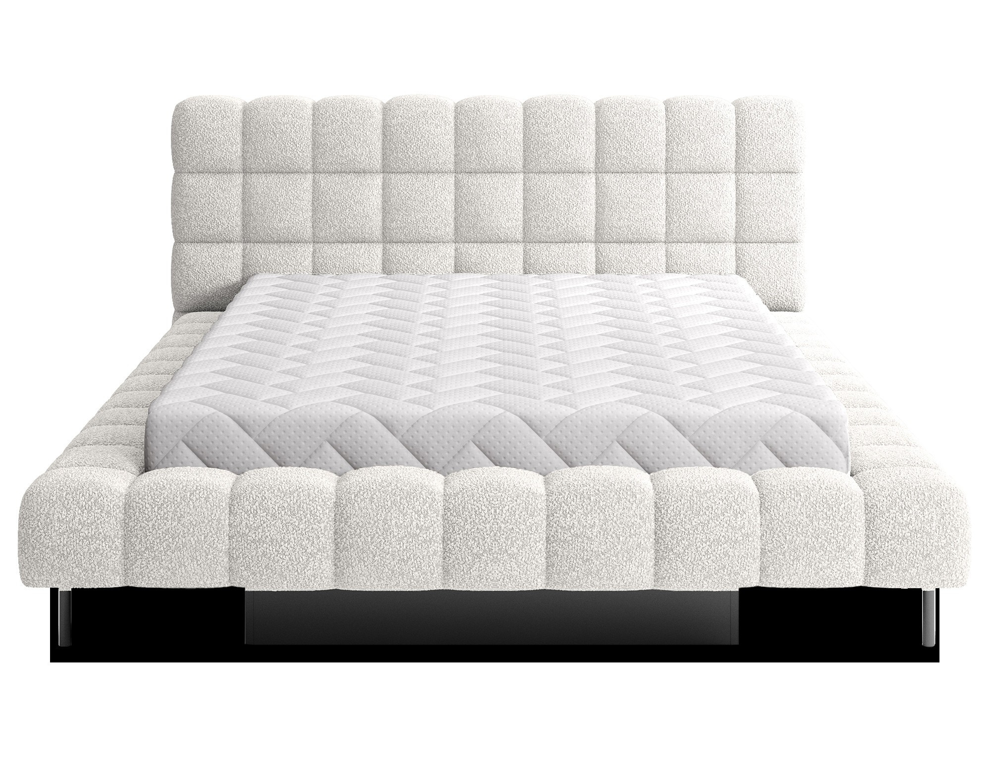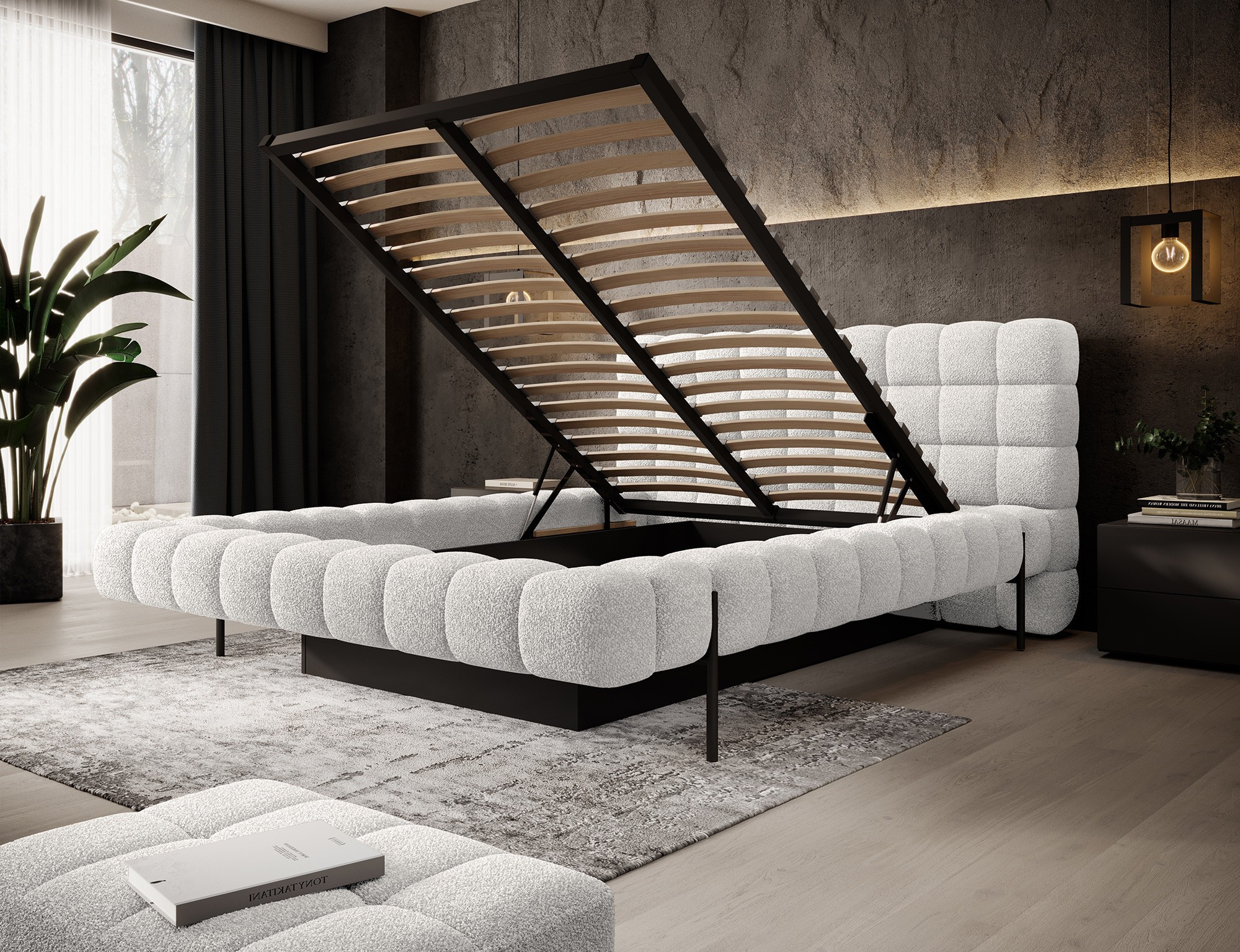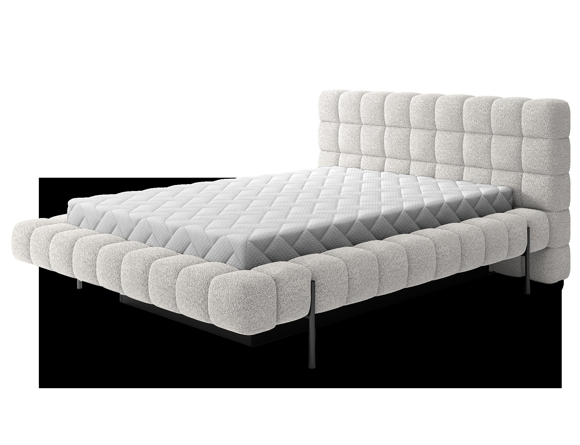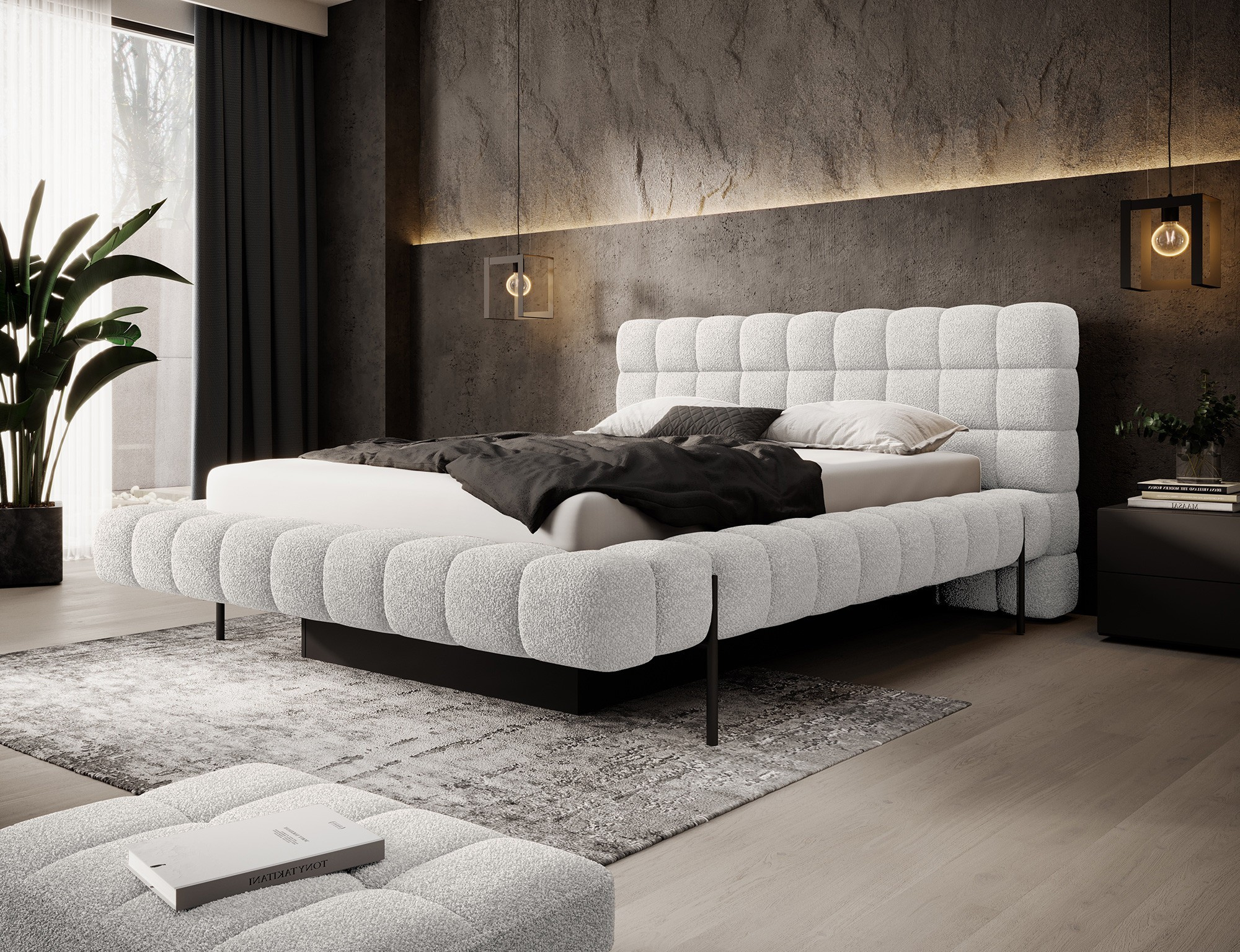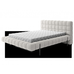 The Magentta bed combines modern design, functionality, and exceptional comfort. Its upholstered backrest adds a touch of elegance and coziness, making it a perfect centerpiece for any bedroom. The sturdy frame and headboard are filled with high-quality T2130 foam, providing excellent support and comfort whether you’re sleeping or relaxing. Available in three sizes: 140 cm, 160 cm, 180 cm, it fits a variety of spaces and personal preferences.The metal frame includes 36 slats, evenly distributing the mattress's weight to enhance durability and provide superior support. The black metal leg ensures a stable base while emphasizing the sleek, minimalist design. A practical storage compartment for bedding offers an efficient solution for organizing duvets, pillows, and other linens, optimizing your bedroom space. The Magentta bed is the ideal choice for those who value modern aesthetics, comfort, and practicality.