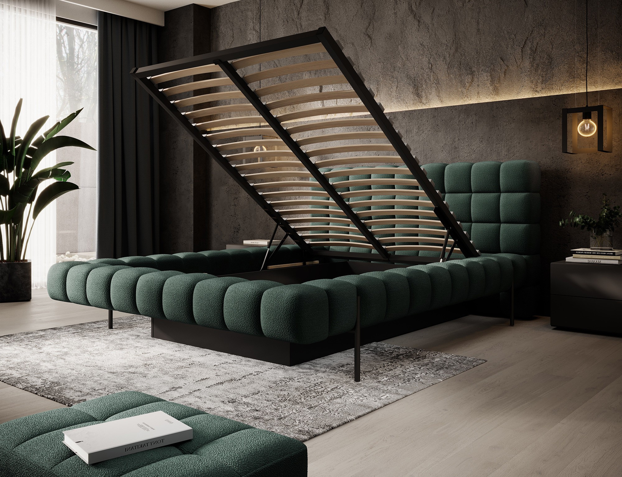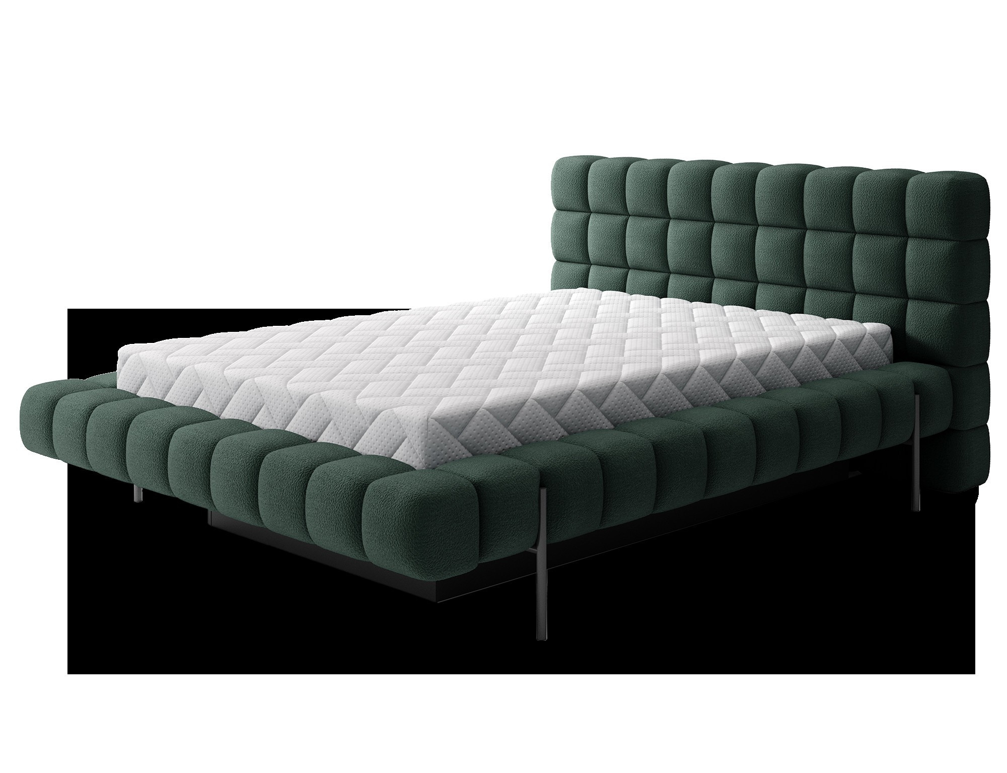 The Magentta bed combines modern design, functionality, and exceptional comfort. Its upholstered backrest adds a touch of elegance and coziness, making it a perfect centerpiece for any bedroom. The sturdy frame and headboard are filled with high-quality T2130 foam, providing excellent support and comfort whether you’re sleeping or relaxing. Available in three sizes: 140 cm, 160 cm, 180 cm, it fits a variety of spaces and personal preferences.The metal frame includes 36 slats, evenly distributing the mattress's weight to enhance durability and provide superior support. The black metal leg ensures a stable base while emphasizing the sleek, minimalist design. A practical storage compartment for bedding offers an efficient solution for organizing duvets, pillows, and other linens, optimizing your bedroom space. The Magentta bed is the ideal choice for those who value modern aesthetics, comfort, and practicality.