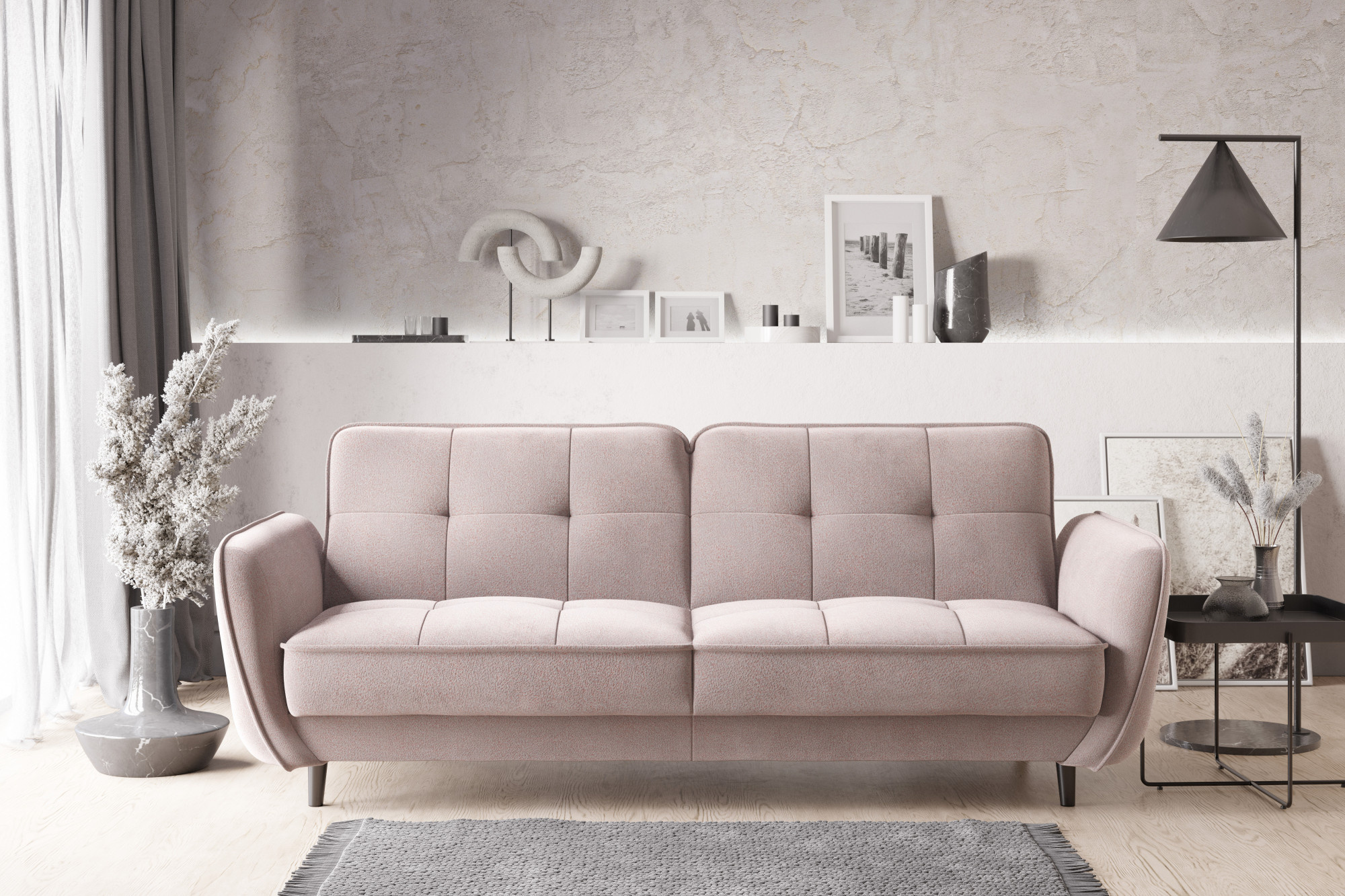 The Bellis sofa bed combines classic elegance with modern style. The Bellis couch with sleep function is complemented by elegant wooden legs that bring a touch of nature to any room. The sofa's width of 220 centimetres is a good size for a medium-sized living room, while the 11 centimetre legs visually enlarge a smaller room and allow you to clean under the furniture. Bellis also comes with a bedding container - useful if there is no room for extra blankets or pillows. The Bellis sofa also has a sleep function. Thanks to the click-clack folding mechanism, you can quickly and easily turn the sofa into a comfortable bed. In addition, the Bellis sofa does not need to be moved away from the wall when it is unfolded and sleeping function is activated. Bellis offers a lying surface of 190x110 centimetres. The piece of furniture is filled with highly flexible HR foam, which is known for its strength and durability. Both the seat of the sofa and the backrest are equipped with this type of foam. The fold-out Bellis sofa is also equipped with a high-quality B-type and pocket spring core. The embellishments in the form of stitching and quilting are responsible for the aesthetic side of the sofa.