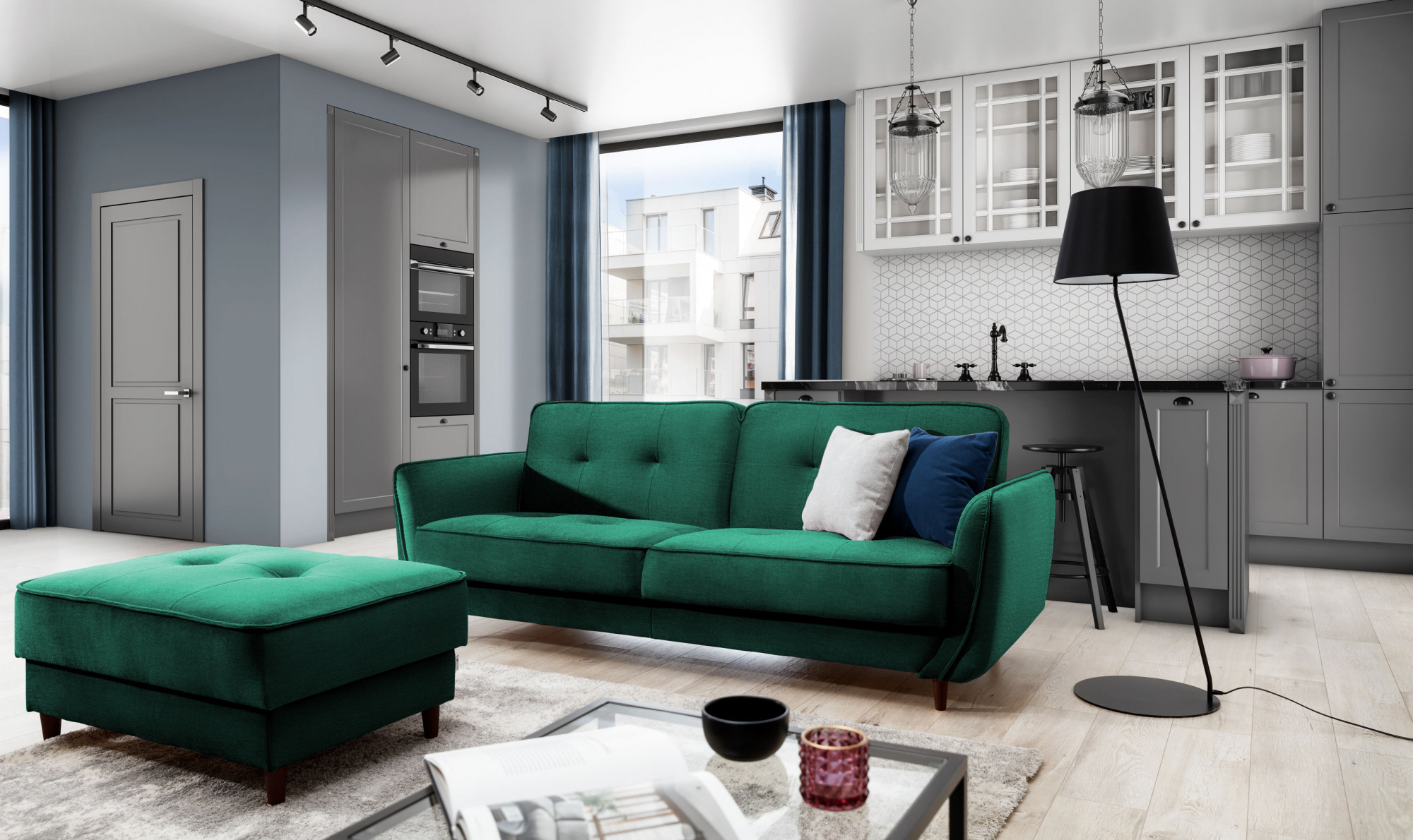 The Bellis sofa bed combines classic elegance with modern style. The Bellis couch with sleep function is complemented by elegant wooden legs that bring a touch of nature to any room. The sofa's width of 220 centimetres is a good size for a medium-sized living room, while the 11 centimetre legs visually enlarge a smaller room and allow you to clean under the furniture. Bellis also comes with a bedding container - useful if there is no room for extra blankets or pillows. The Bellis sofa also has a sleep function. Thanks to the click-clack folding mechanism, you can quickly and easily turn the sofa into a comfortable bed. In addition, the Bellis sofa does not need to be moved away from the wall when it is unfolded and sleeping function is activated. Bellis offers a lying surface of 190x110 centimetres. The piece of furniture is filled with highly flexible HR foam, which is known for its strength and durability. Both the seat of the sofa and the backrest are equipped with this type of foam. The fold-out Bellis sofa is also equipped with a high-quality B-type and pocket spring core. The embellishments in the form of stitching and quilting are responsible for the aesthetic side of the sofa.